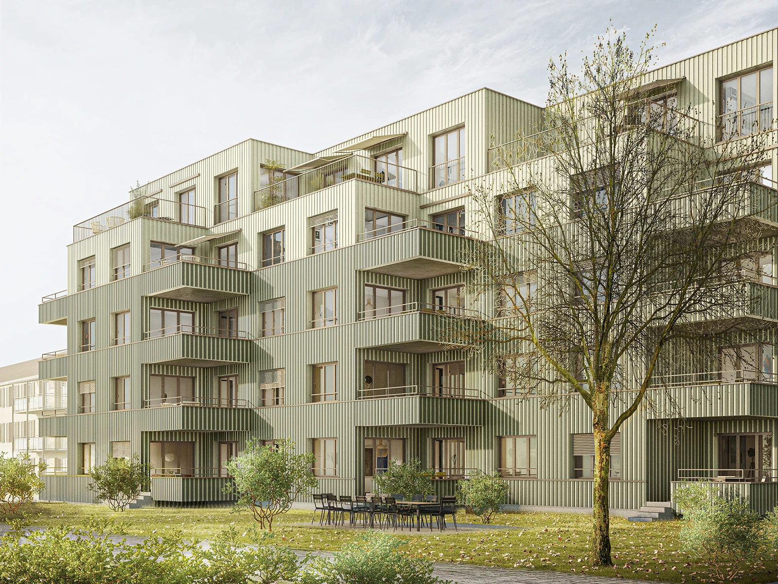 As part of a competition entry, we developed an urban volume that integrates seamlessly into the open, permeable block structure of the neighborhood. A clear tripartite composition – robust base, articulated piano nobile, and recessed attic – anchors the building in its urban context. Loggias, volumetric setbacks, and a finely tuned facade enhance daylight, natural ventilation, and microclimatic performance – with a focus on sustainability and long-term residential quality.