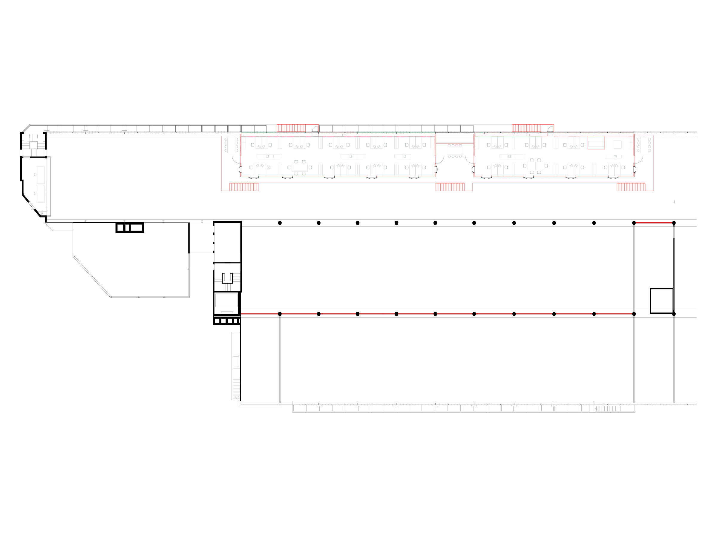 Exceeding those production needs, additional areas are reserved for small exhibitions, staff rooms, and office spaces, newly integrated within the vast production hall, which accommodates forty workstations. Functionally aligned with the original industrial facade, the workstations designated for cutting and assembling the tarps are arranged directly below this new office space, all reinforced by V-shaped pillars maintaining the monolithic floor slab.