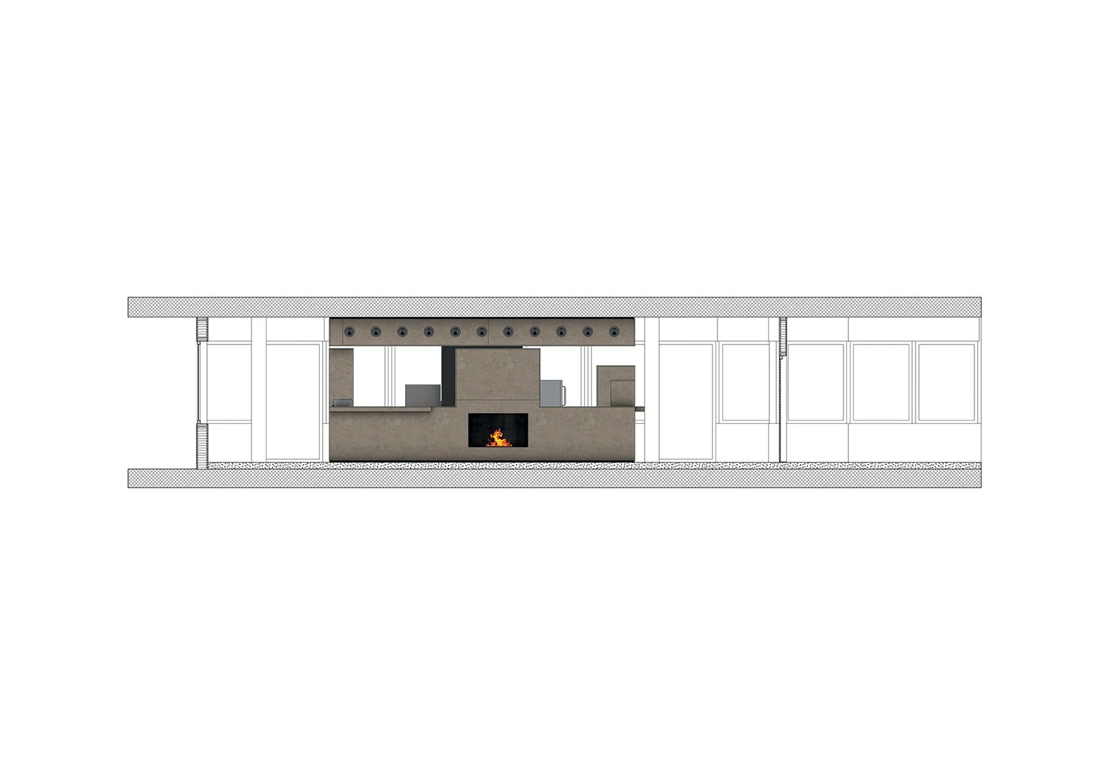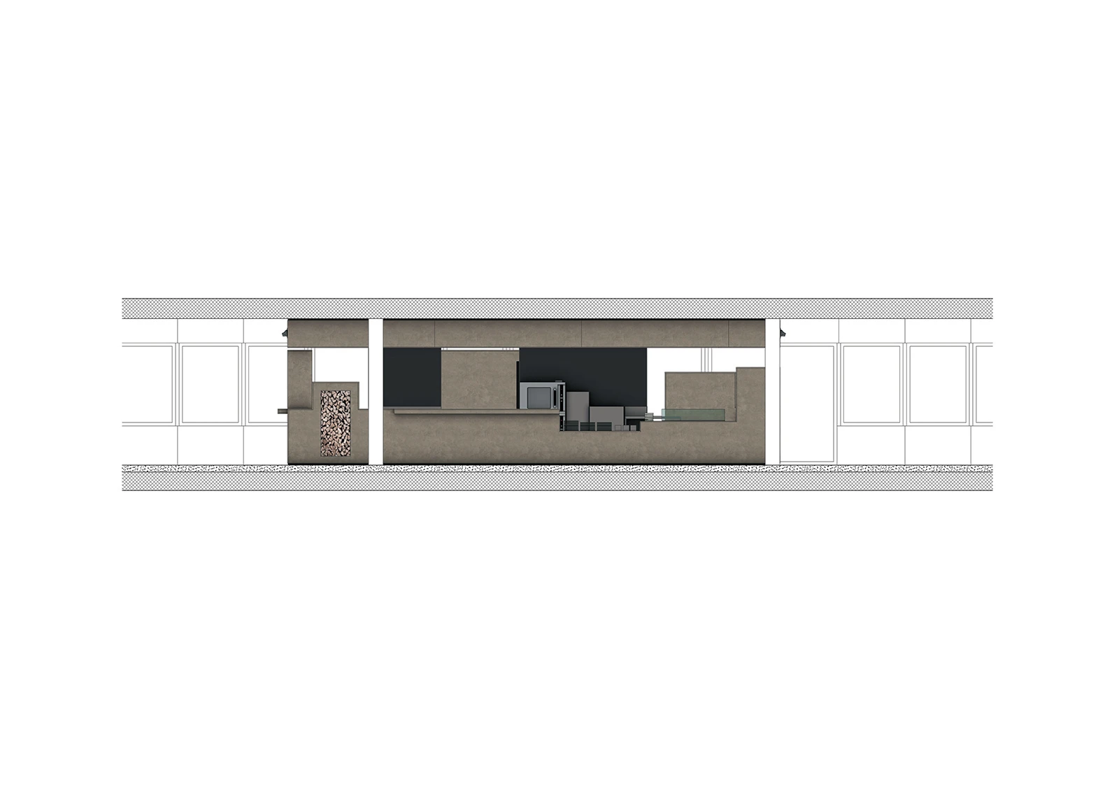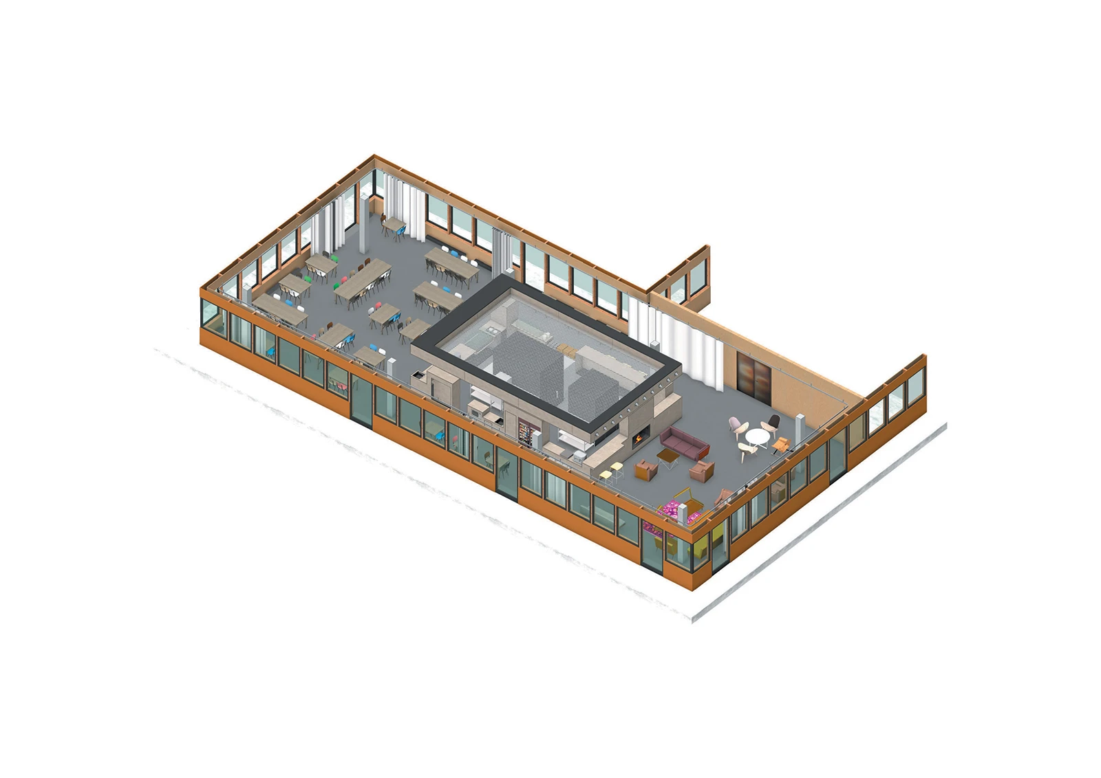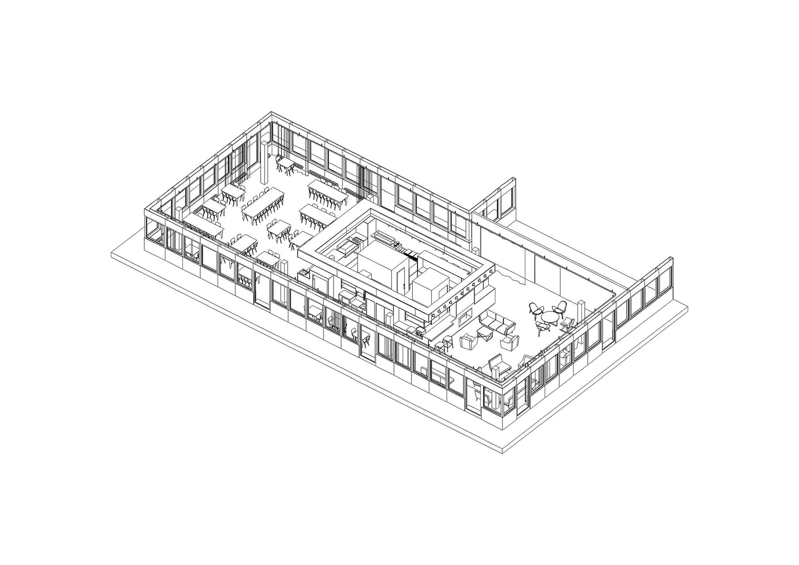 This cafeteria integrates two zones: a lounge, accessible 24/7, and a designated lunch space. The open module incorporates diverse elements such as a bar, kitchen, pick-up area, delivery access, and other essential infrastructure components.