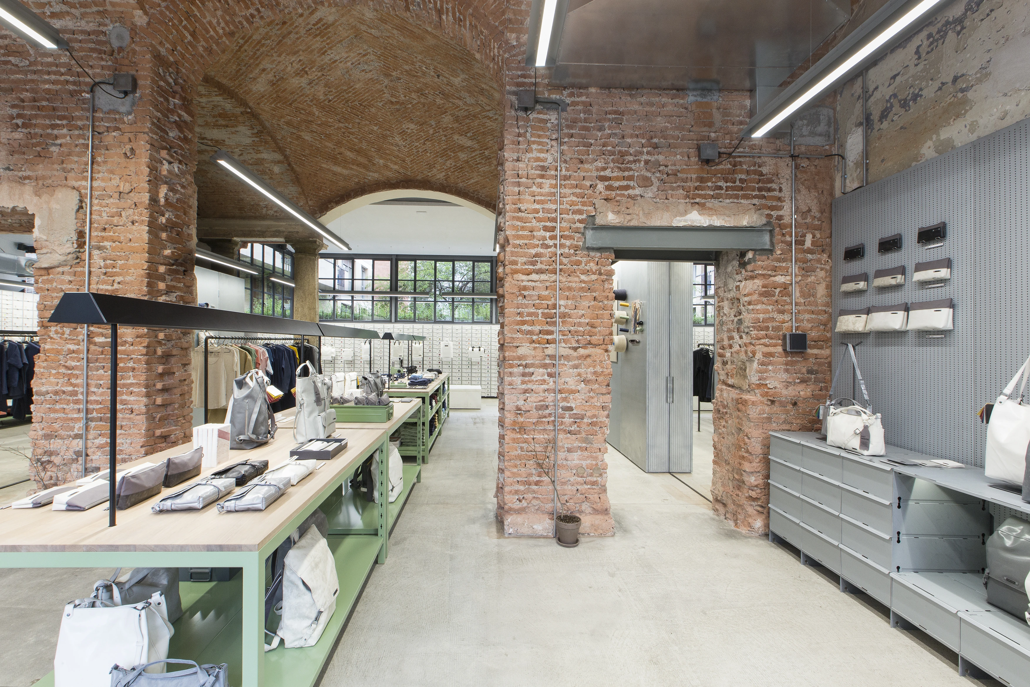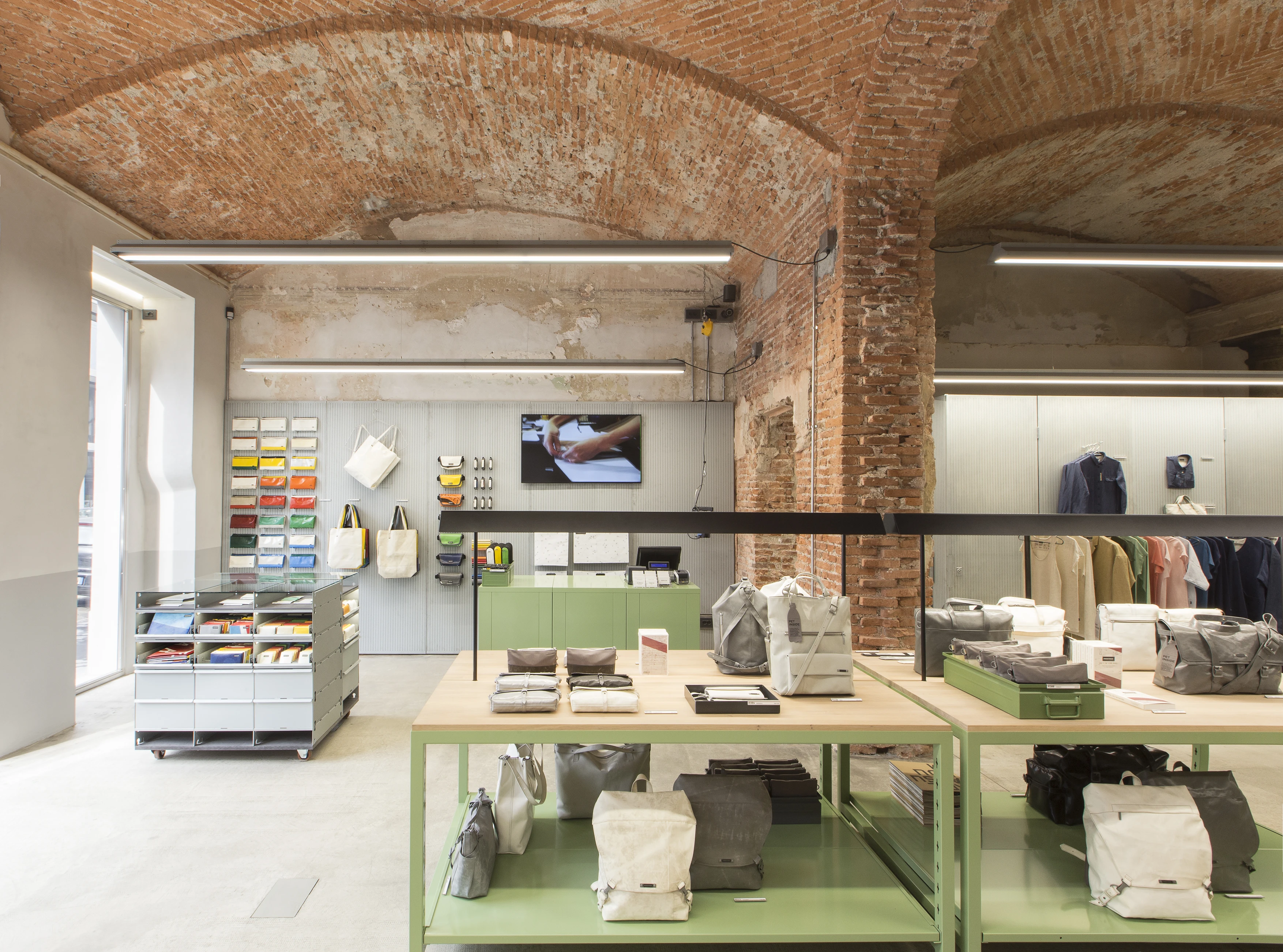 Als Kassentresen dienen industrielle Werkzeugkorpusse von Lista, und die Taschenregale V30 und V200, von FREITAG selbst entwickelt, kommen konsequent zur Anwendung. Die klare, nüchterne Farbgebung und Ausgestaltung der Möblierung, des Bodenbelags und der Beleuchtung kontrastieren den warmen gemauerten Bogenraum bis hin zum hofseitigen Industrieanbau.
