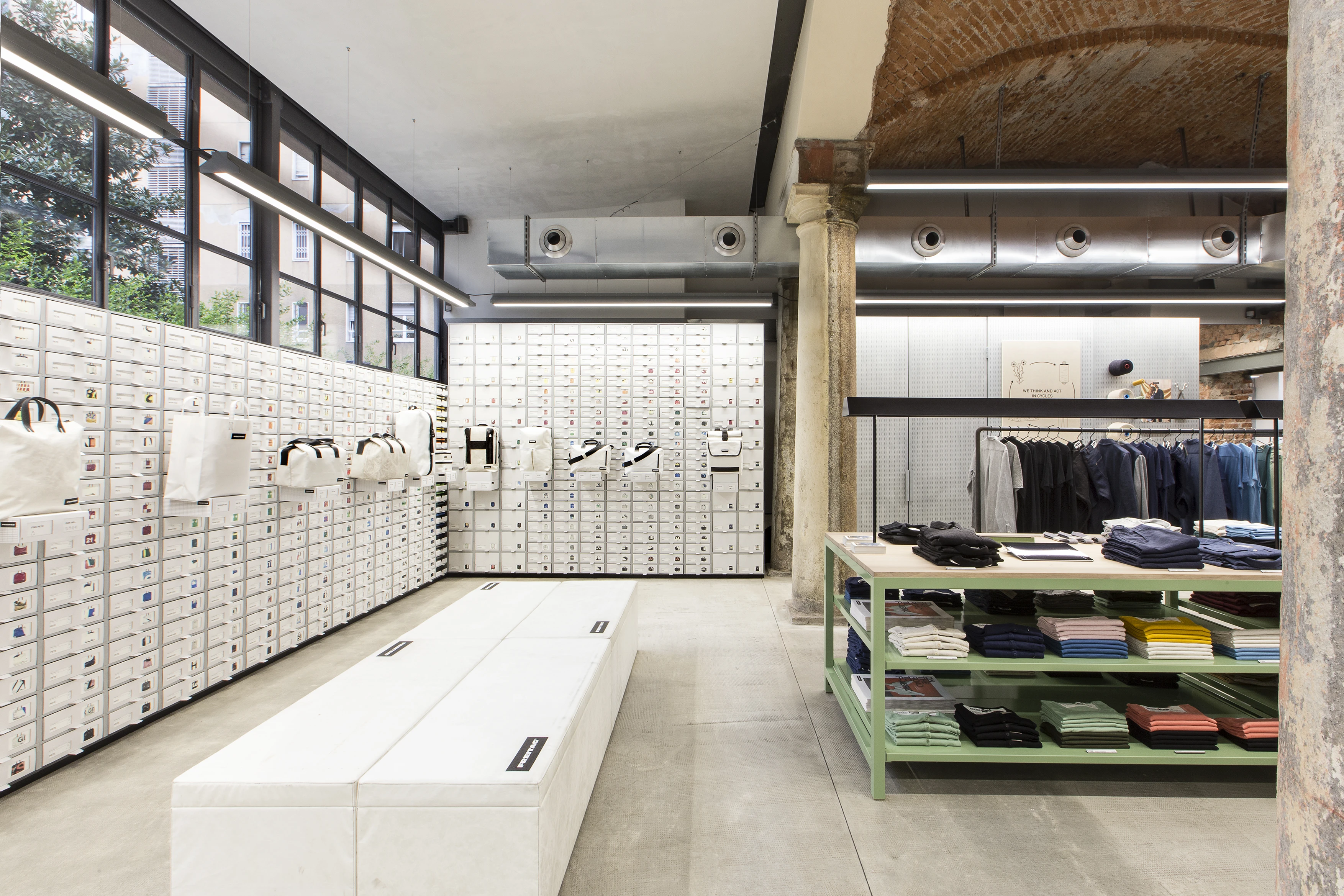 Nach Jahren der Suche stimmte Lage, Raumgrösse und baulicher Zustand mit den formulierten Prämissen für ein Ladenlokal von FREITAG in Mailand überein. Neben den obligaten und bewährten rund 1’000 Taschenplätzen im von Freitag entwickelten Verkaufsregal V30 soll neu zum ersten Mal auch das vollständige Kleidersortiment “Fabric” in Kombination mit der bewährten Taschenkollektion “Reference” räumlich kohärent Platz finden.