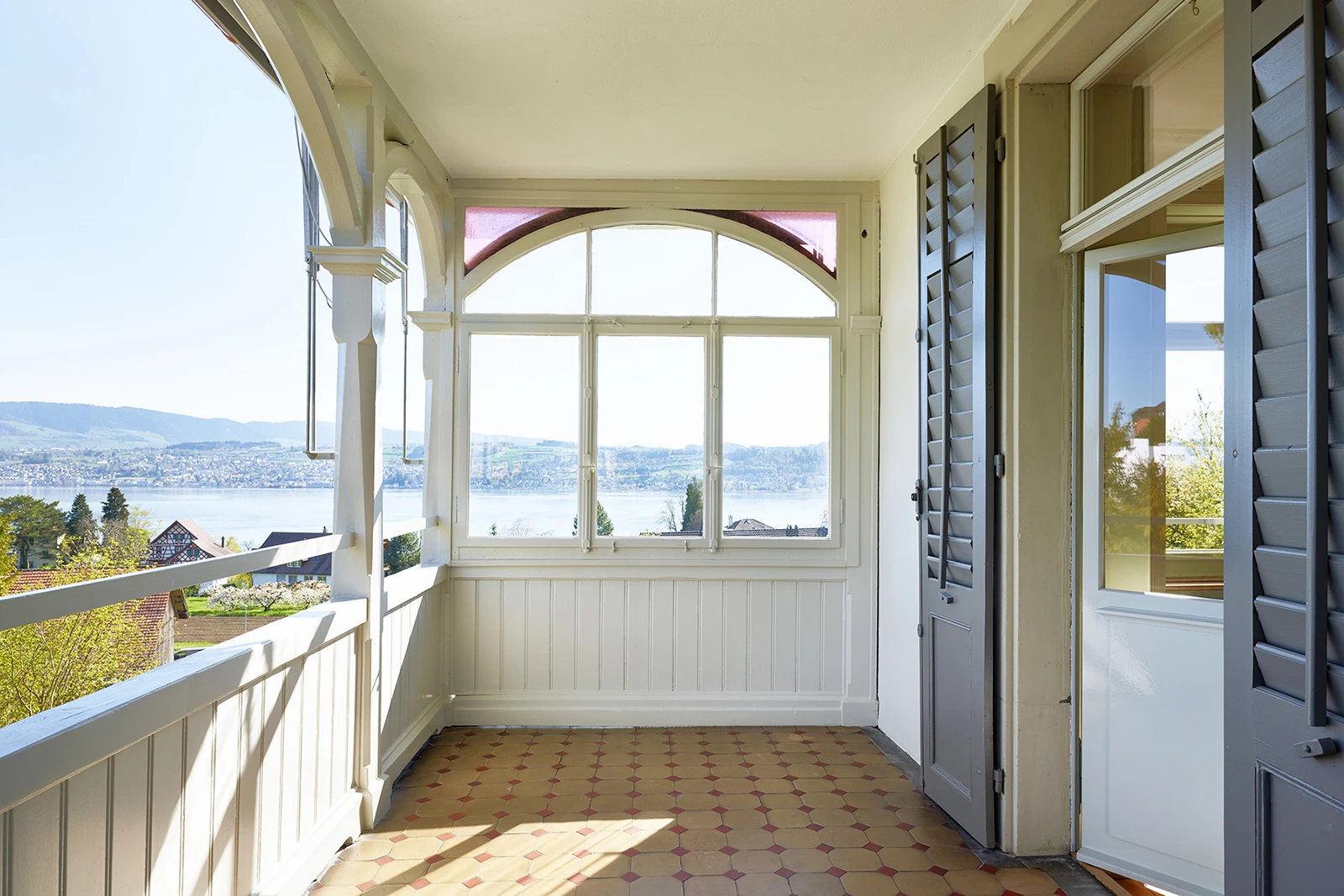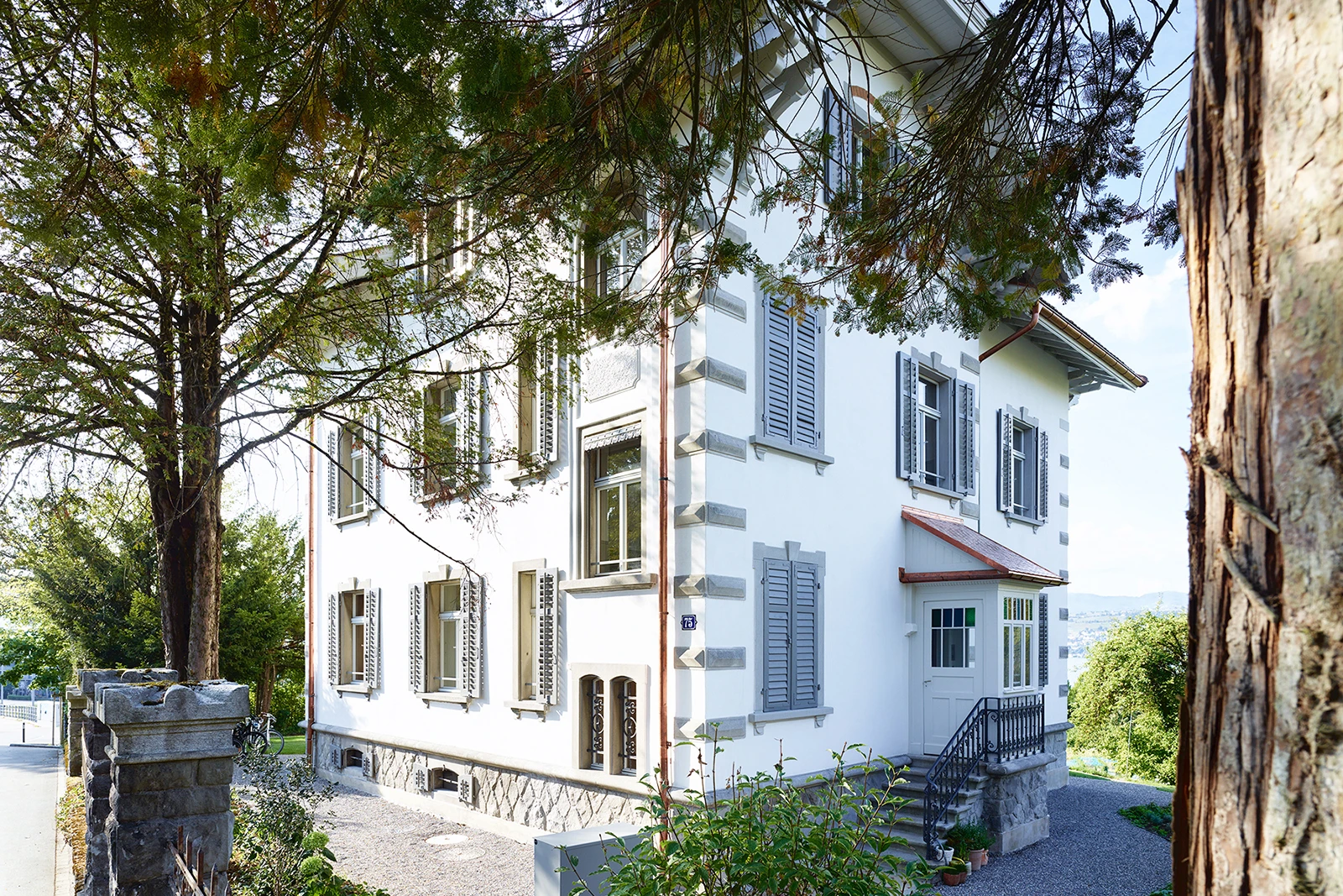 The listed Haus Zur Sommerau in Uetikon near Zurich stands on a ridge next to school buildings, a community center, and the Uetikon church hill. The property is defined by its large garden, featuring "Brezelwegen" pathways, plant beds, enclosures, and historical gates reminiscent of grand bourgeois residences.