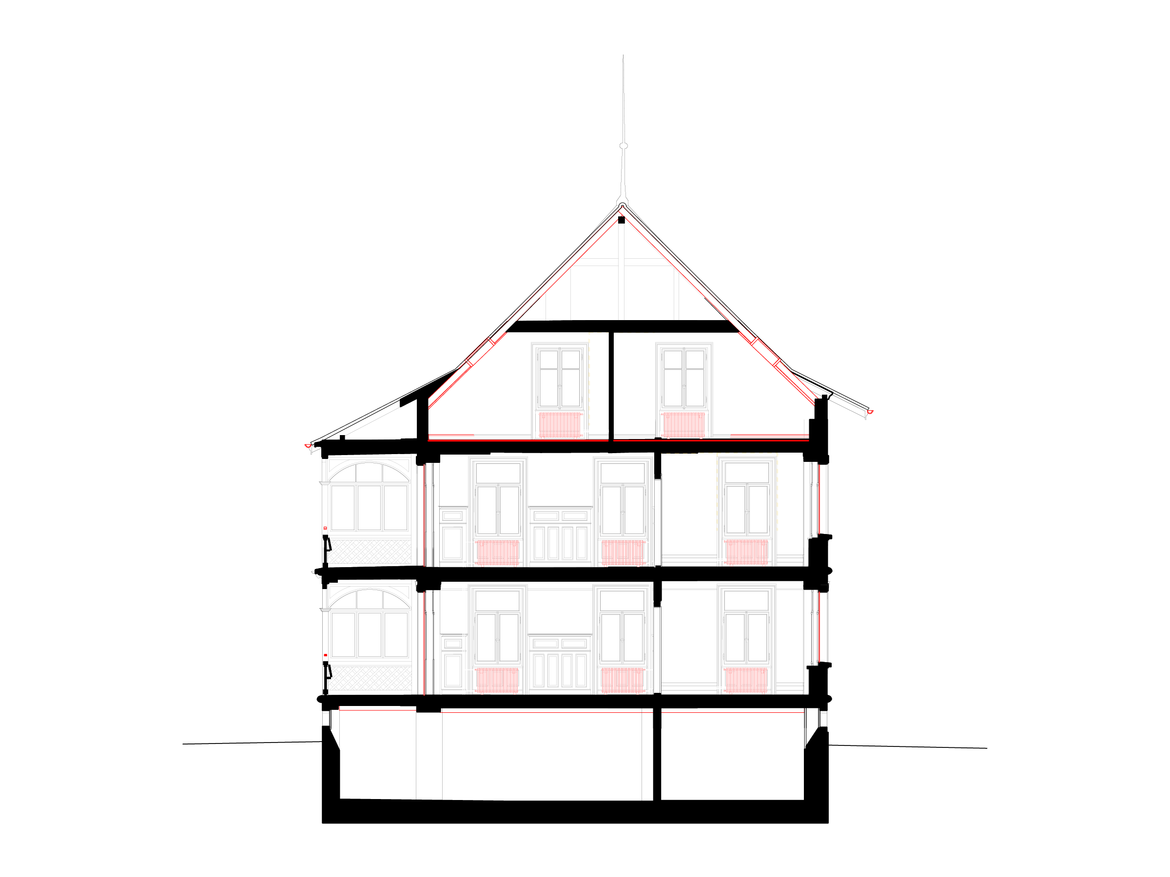 The historicist approach is reflected throughout the interior with elements such as ceiling stucco moldings, dadoes, intricate apartment doors, and painted faux wood, some still in their original condition. All of these features have been carefully restored according to preservation requirements. Additional insulation was introduced to the roof, along with three small windows. Most of the original tiles have been reused or supplemented by historical tiles from a conservation depot. Spatially, the intervention is limited to the kitchens and bathrooms on all floors, designed to integrate with the overall historical context and appearance of the building. The only significant modification in the layout was in the southeast room on the ground floor, where a portion was sectioned off for a cloakroom and guest toilet.