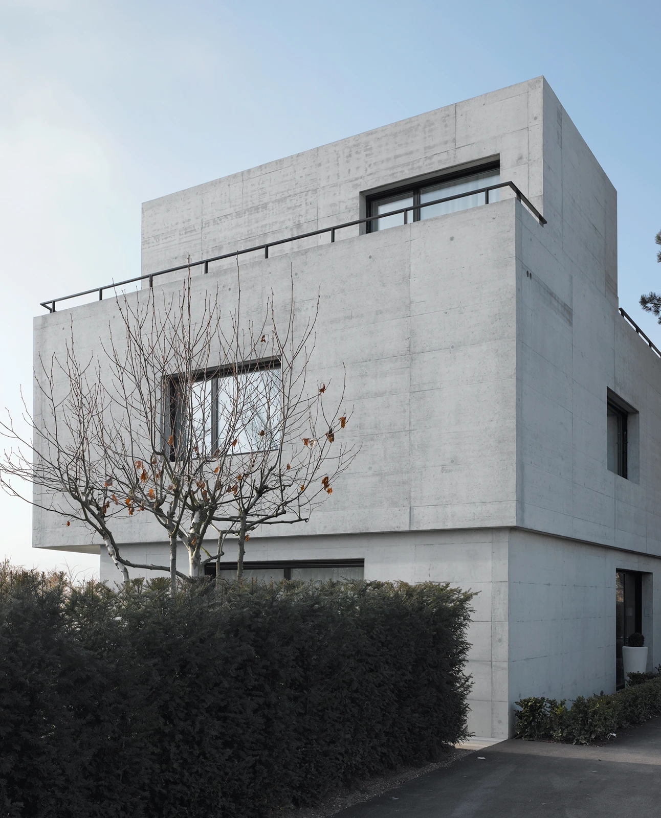 Wie ein Rückgrat führt ein Treppenkern durch das Gebilde und hält die kompakte innere Abwicklung zusammen. Die Schwere des Baukörpers verleiht dem Ort Präsenz und antwortet auf die anonyme neuere Architektur der Umgebung. Gleichzeitig steht er im Dialog mit einer mächtigen, hangseitig an das Haus grenzenden Föhre. Ein puristisch ausgestalteter Gartenraum umfasst den Körper, transformiert den Innen- in den Aussenraum und schafft im Zusammenspiel mit einer das Grundstück umschliessenden Hecke eine hohe wohnliche Intimität.