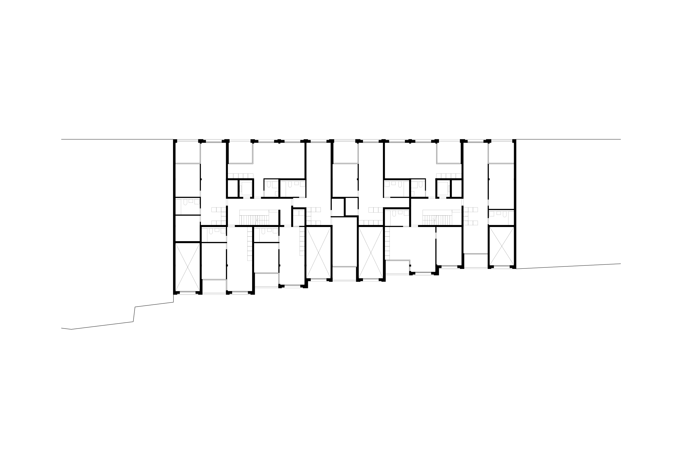 Sitting on a solid base, the compactly organized building is structured with gentle tectonic offsets and visually merges with the attic. Its over-height living spaces stand out with large openings in the façade, evoking an urban, nuanced expression. Densely organized, layered floor plans slot within its basic structure based on a grid of 3.25m. The design offers rooms with a height of almost 4 meters with an atmosphere of inner expanse, spaciousness, and urbanity, thanks to a sophisticated vertical interlocking of the living spaces.