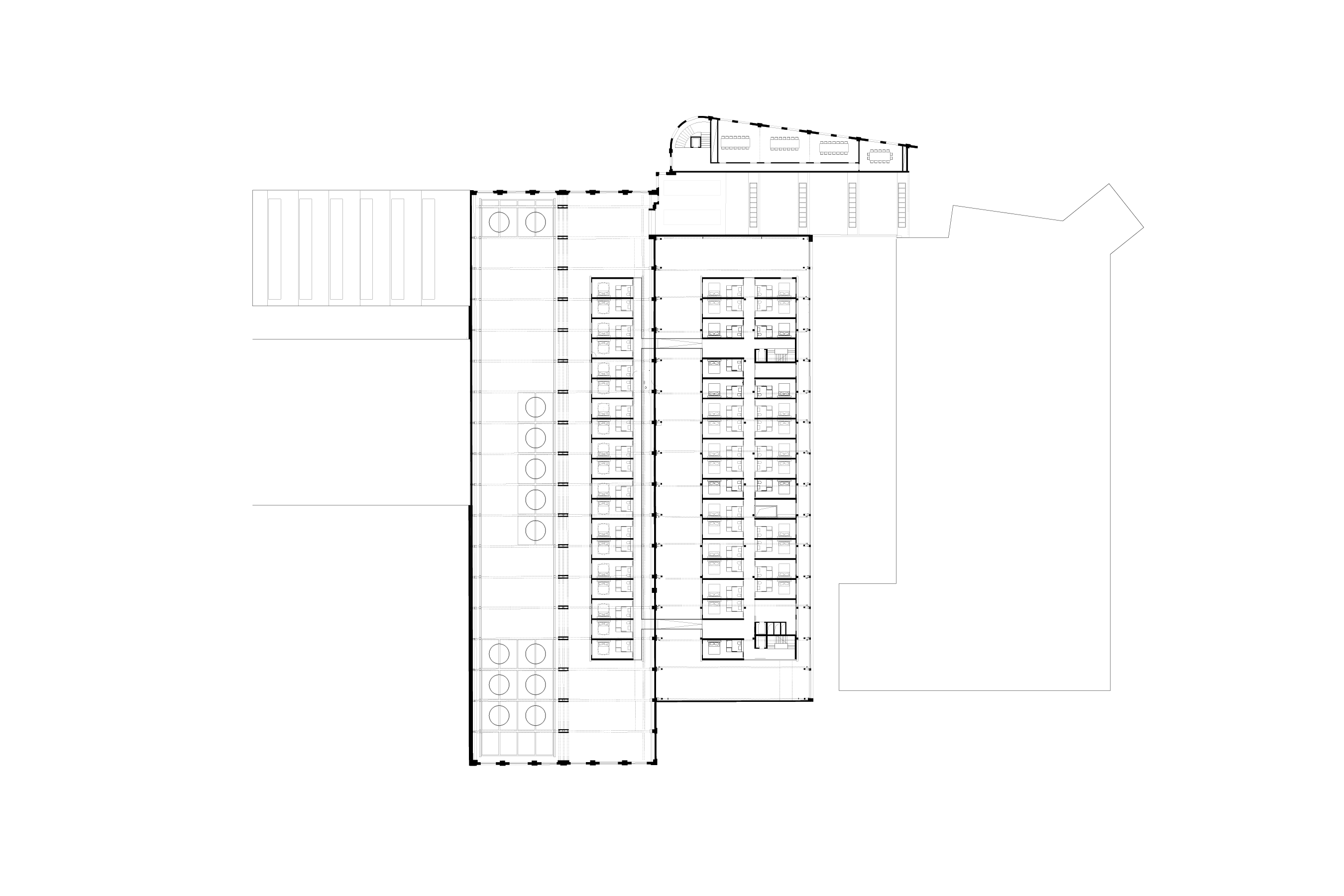 The reinforced concrete columns and girder structures of the installation inside Habersack Hall and those of Rapide Hall's hotel come together into a uniform composition with a visible grid mirroring the rhythmic patterns of the original halls. Circular apertures pay homage to the 1970s Capsule Tower by Kisho Kurokawa, consisting of 140 standardized, prefabricated residential modules. Additionally, they evoke references to the site's industrial lineage and the world of locomotives.