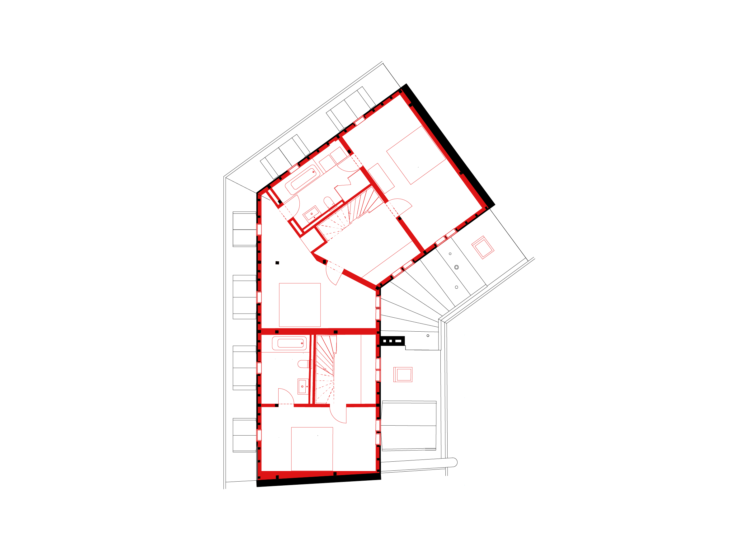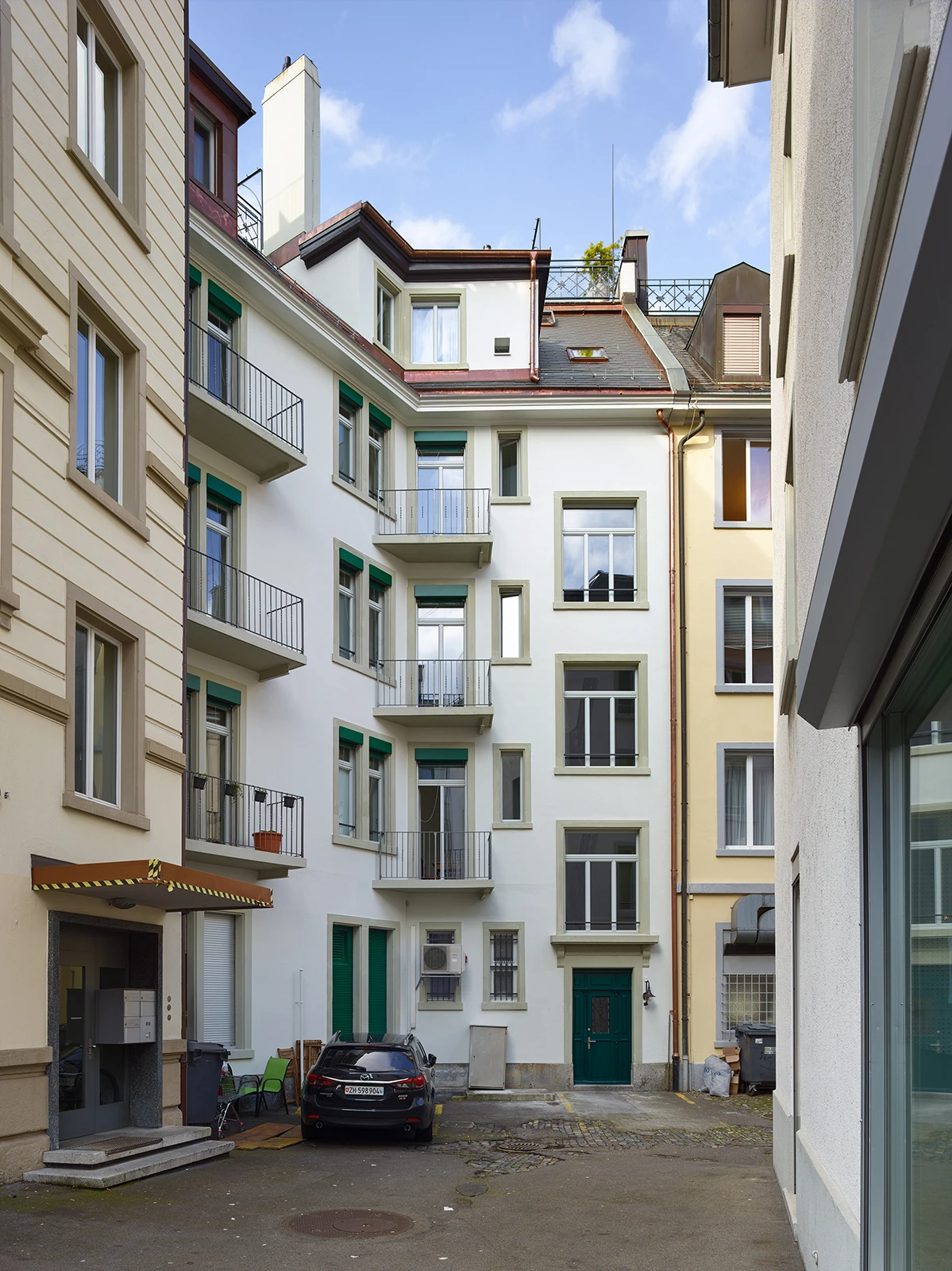Mit Einbezug des Estrichs entstehen anhand Spillmann Echsle’s Renovierung aus einer Wohnung zwei neue Maisonette-Wohnungen. Die quartiertypische Dachzinne wird den beiden Maisonette-Wohnungen als private Aussenräume mit direkten Ausgängen zugeschlagen. Relevante Anlagen, wie auch Bäder und Küchen die nicht mehr heutigen Ansprüchen Genüge tragen, wurden durch die sanfte Sanierung hochqualitativ den heutigen Bedingungen entsprechend angepasst.