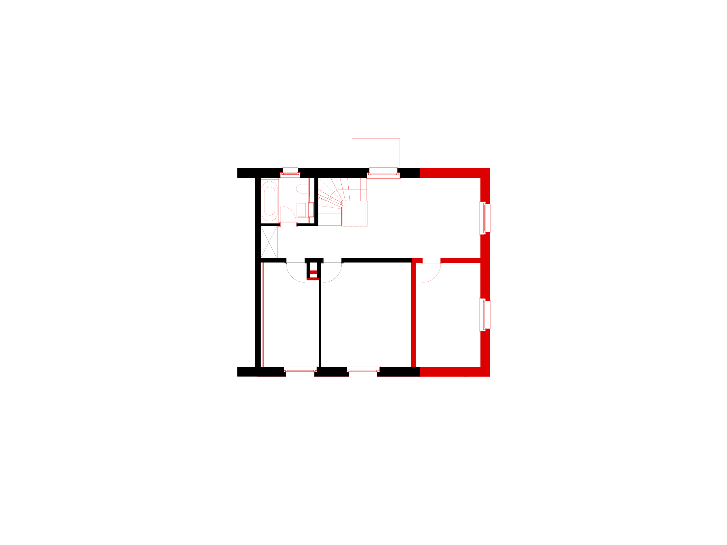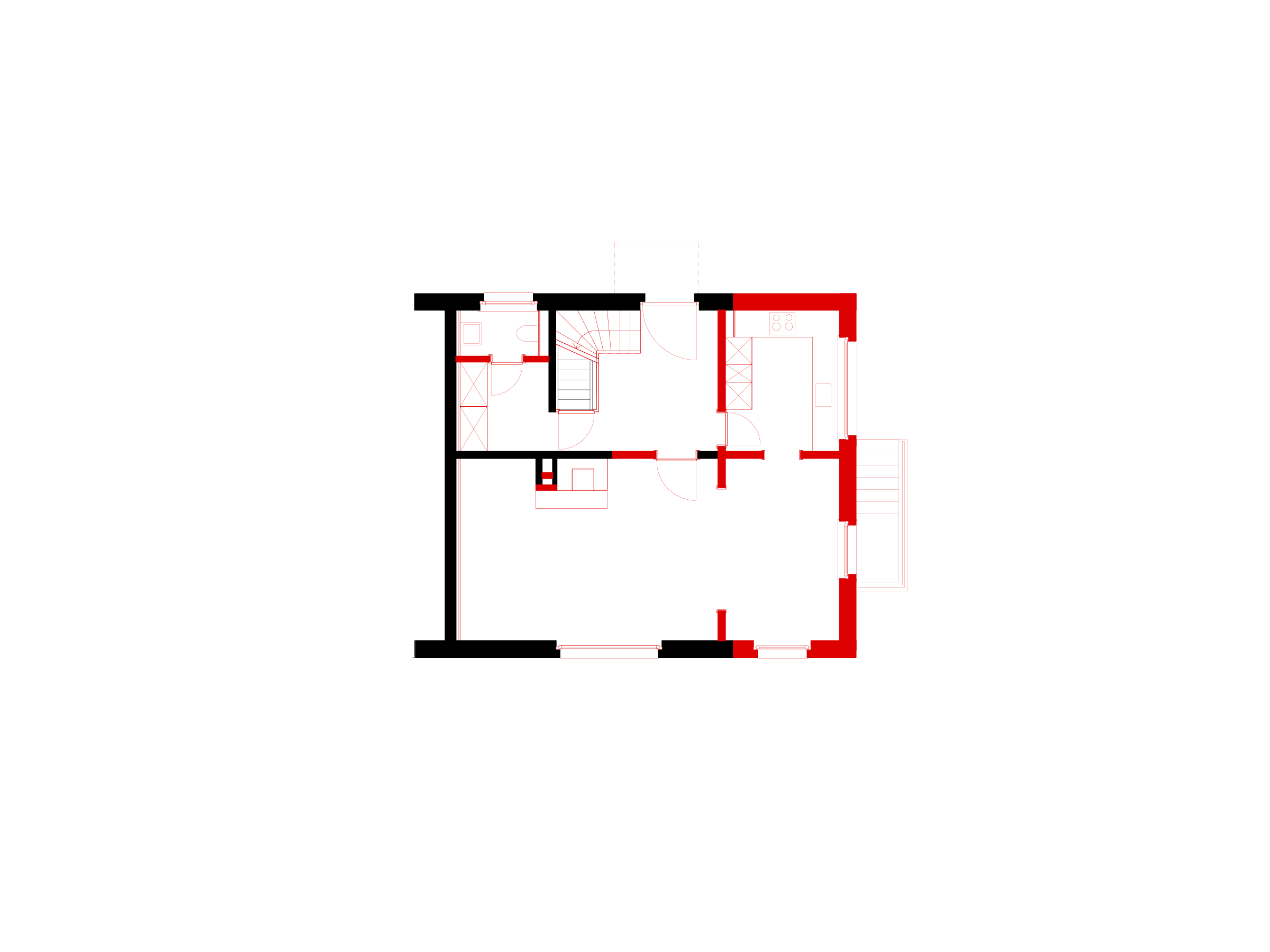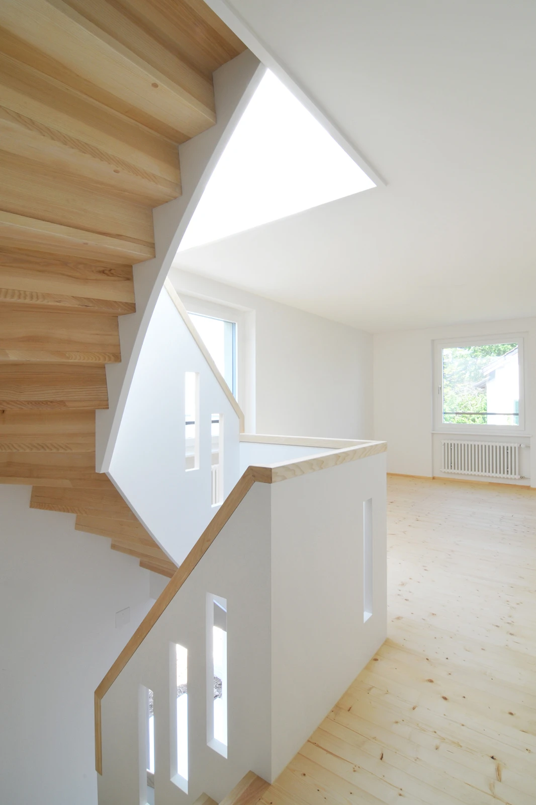 Im EG entstand ein grosszügiger Wohn- und Essbereich mit Küche und einem separaten Gäste-WC. Im Obergeschoss wurde ein zusätzliches Kinderzimmer gewonnen sowie eine grosse Begegnungszone als Vorbereich der Zimmer geschaffen. Im neu ausgebauten Dachgeschoss befindet sich der Elternschlafbereich mit separatem Bad. Die beiden grossen Oblichter verleihen dem Innenraum eine unerwartete Grosszügigkeit und geben den Blick in den Himmel frei. Die neue Treppe, die sich wie ein Band durch die Geschosse windet, ist das zentrale neue Element. Die Oberflächen, wie beispielsweise der geölte Fichtenriemenboden und die gestemmten massiven Türen, nehmen auf den Bestand Bezug, sind jedoch alle neu angefertigt.