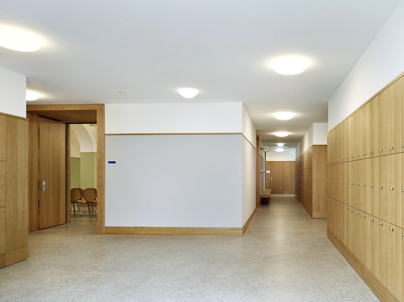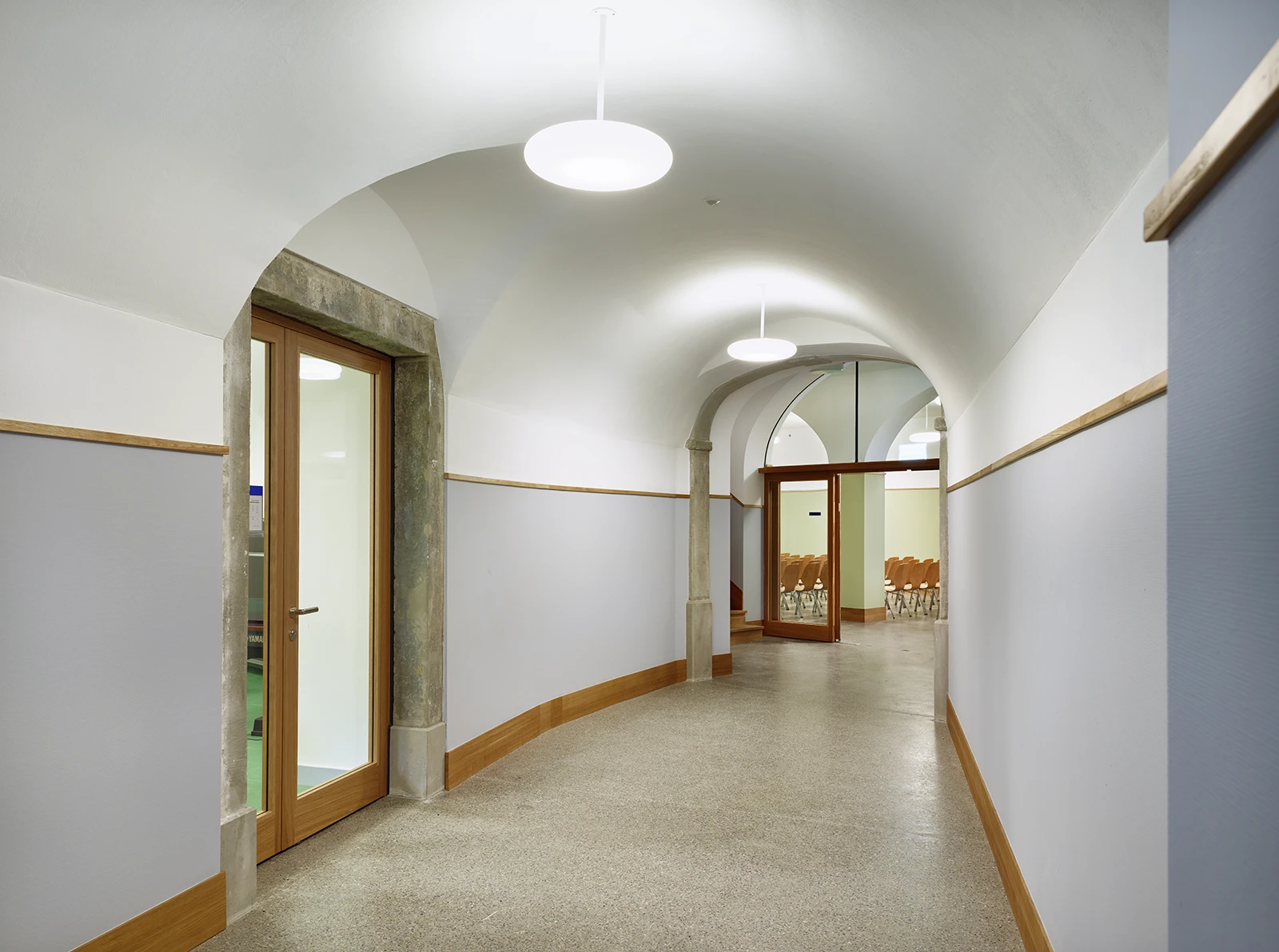 Der Durchgang von der Remise zur Aula wurde über den historischen Gewölbegang wieder geöffnet und die noch vorhandene Steinrahmung freigelegt. Mit dieser baulichen Intervention wird die bestehende Aula zum zentralen Raum. Präzis gesetzte Perforationen durch die ursprüngliche Aussenwand verweben die Aula räumlich mit der unterirdischen Erweiterung. Die vorgelagerten und leicht amorph geschwungenen Klassenzimmer strecken sich zum Licht und alternieren mit Vorbereitungs- und Gruppenräumen. Auf dem Dach des Neubaus ist ein sorgfältig ausgestalteter Gartenraum angelegt.