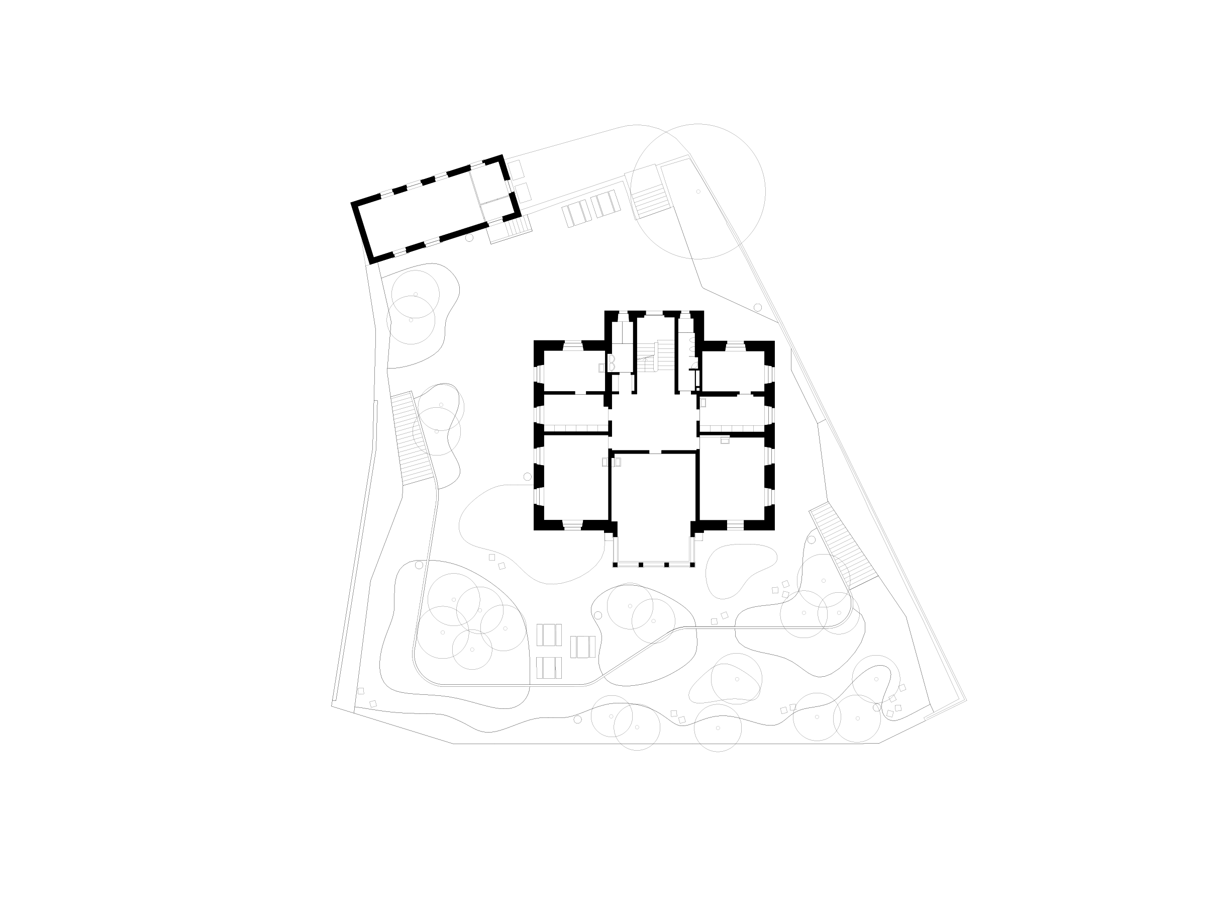 Through this intervention, the main building, the ancillary building, and the new basement are merged into one unit, while at the same time, the independent expression of the individual parts is strengthened.
