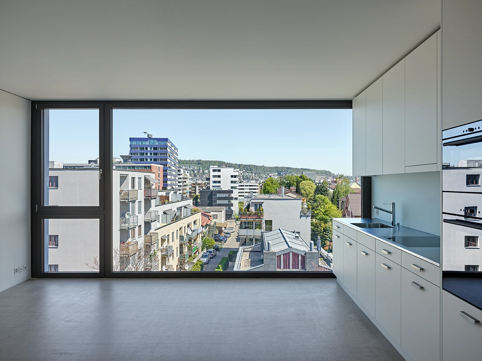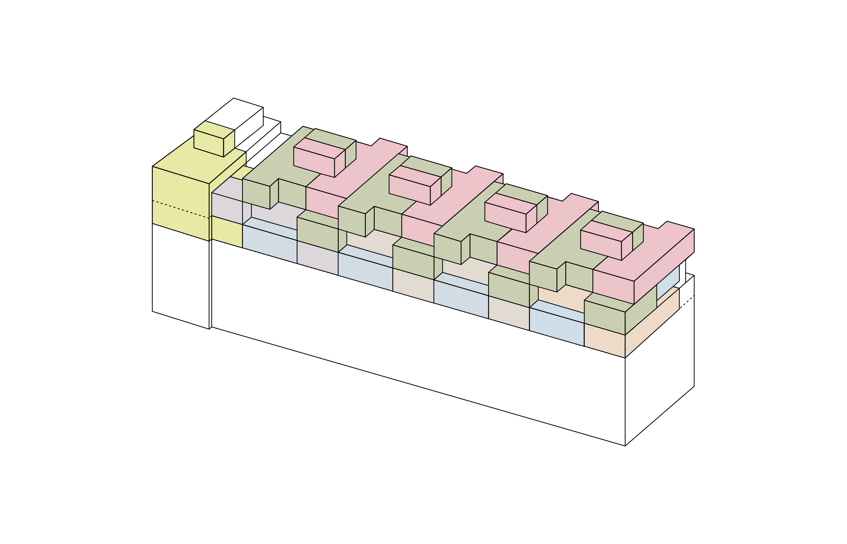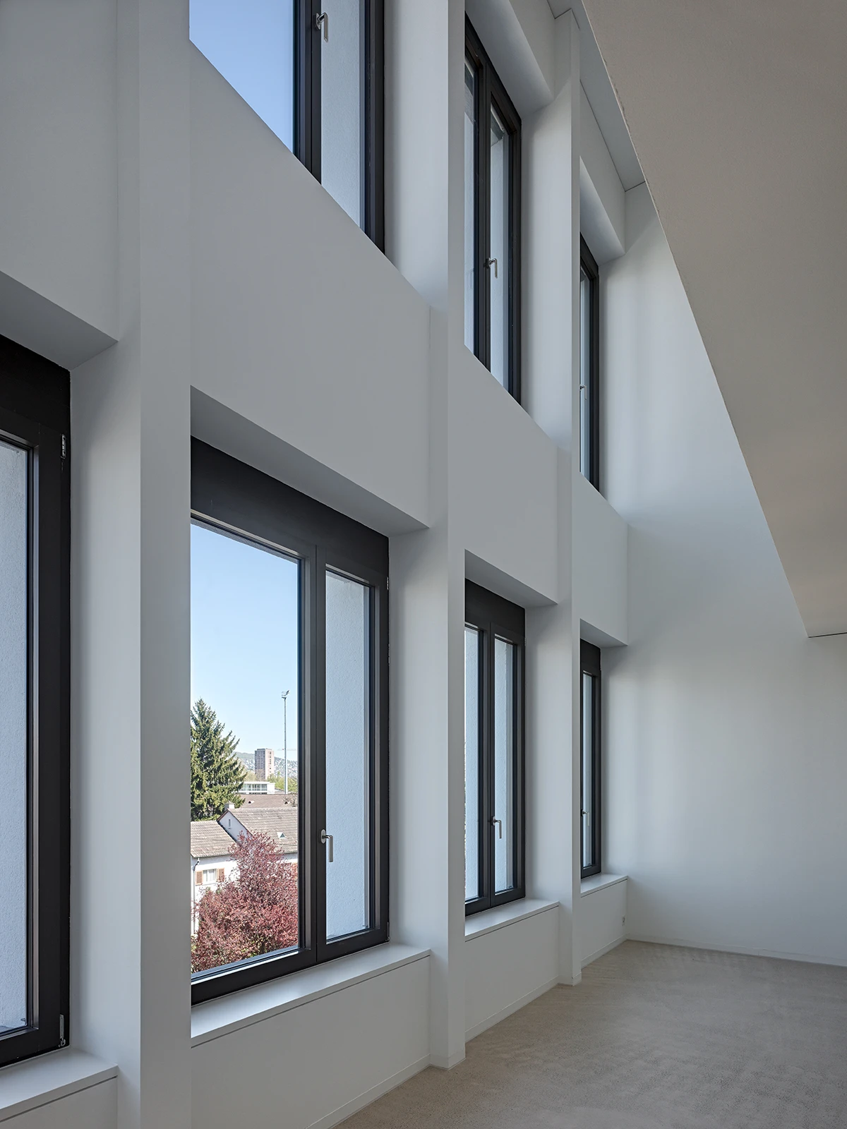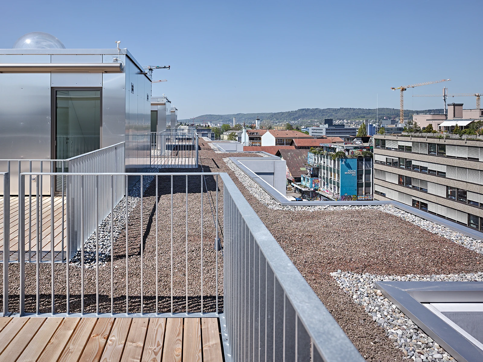 Obwohl die Struktur der Aufstockung auf den ersten Blick einfach und klar erscheint, sind die einzelnen Duplex-Wohnungen komplex ineinander verschachtelt. Dies bewirkt neben der räumlichen Variation der zwei Grundtypen auch die erforderliche Ausrichtung der 17 Wohneinheiten zur lärmabgewandten Gebäuderückseite. Die grosszügigen Wohn- oder Schlafräume finden in vorgelagerten Aussenterrassen ihre Fortsetzung. Die Vertikalstapelung erzeugt im Innern die Weite eines kleinen Stadthauses: Der räumlich gefasste innere Treppenlauf führt je nach Wohnungstyp ein Geschoss hinunter: in die umgenutzte Gebäudestruktur des dritten Obergeschosses; oder hoch: in das aufgestapelte fünfte Obergeschoss. Sämtliche Einheiten werden im vierten Obergeschoss über einen einzigen inneren Korridor, eine Rue Intérieure, erschlossen. Diese wird über als vertikale Schächte ausgebildete Lichtkanonen zenital belichtet. Der Ausdruck der Fassade ist städtisch und Abbild der inneren Organisation. Die gewählte Verkleidung der hölzernen Aufstockung, detailarme Faserzementgusselemente, ist langlebig und schlägt den Bogen zurück zum massiven Grundbau.