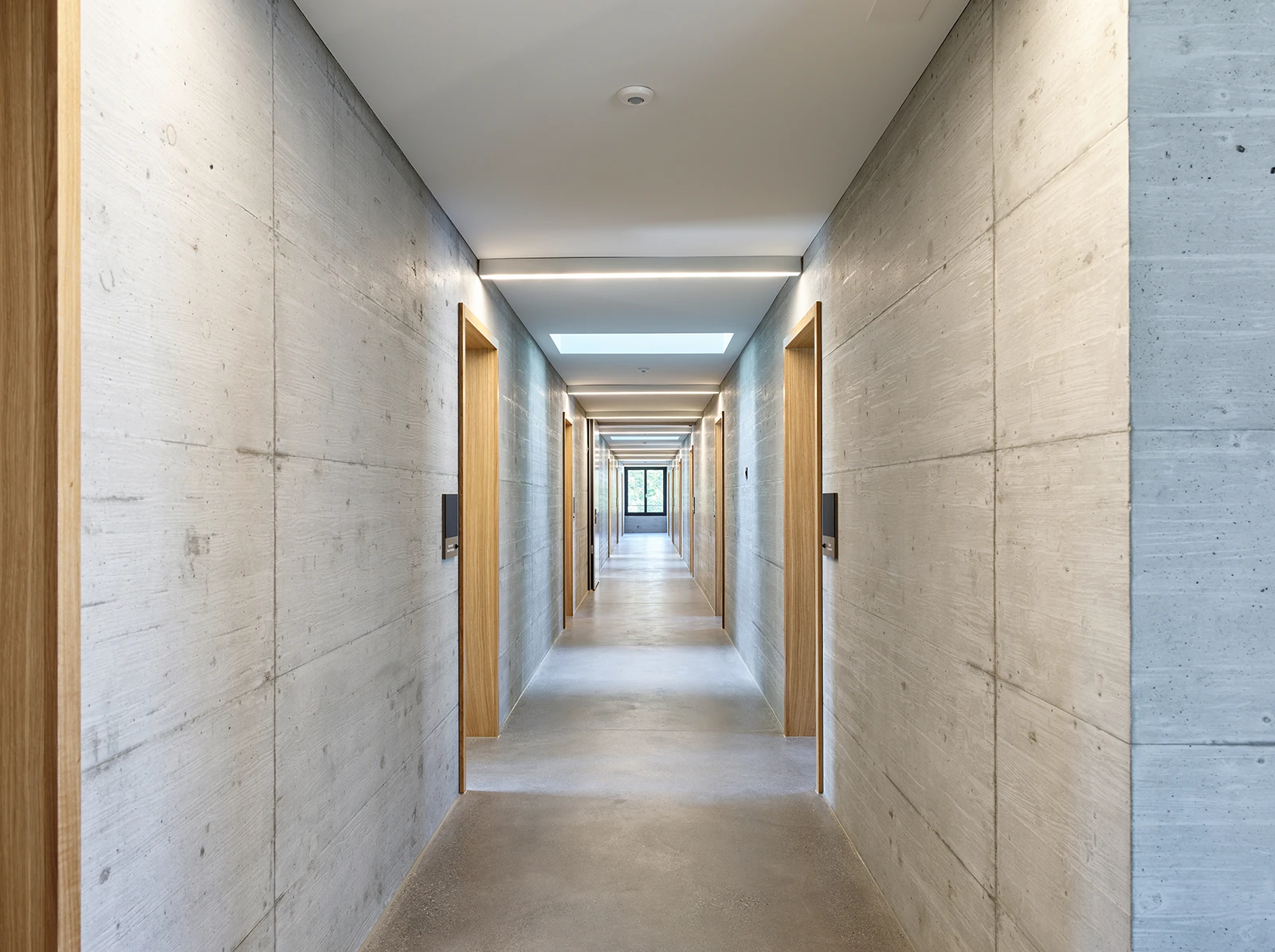 A tectonic façade design visually unifies the structures while allowing each building to retain a subtle individuality. The Bahnhofstrasse-facing commercial building preserved its original façade grid and presented a more restrained aesthetic while complementing the playful design of the new addition. Fenestration is tactically adapted to enhance the interior spatial dynamics and features wall-to-ceiling living room windows interspersed with smaller parapet-framed openings. Both structures exhibit a façade with a rear-ventilated, pre-installed system made of tactile metal panels.