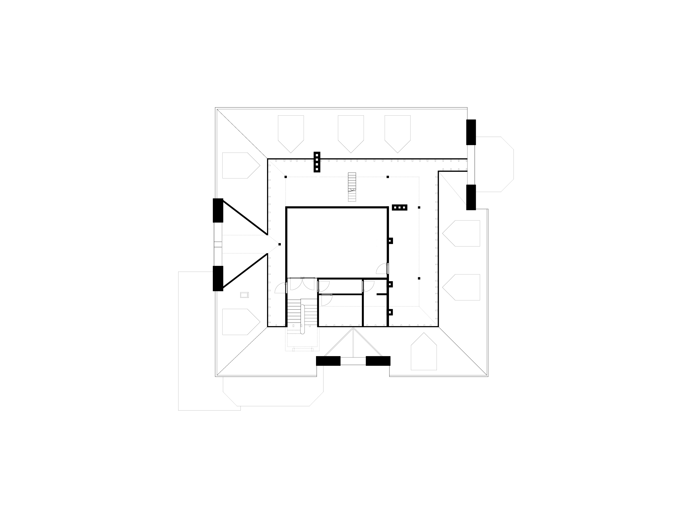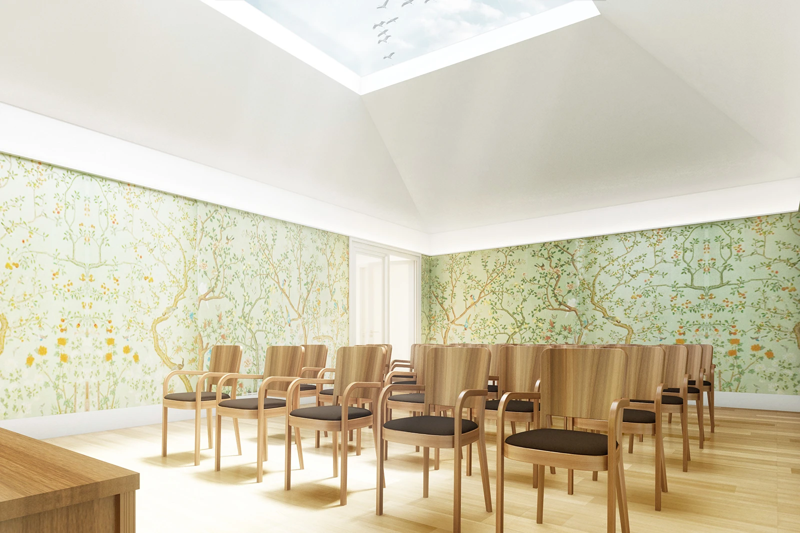 Das erste Obergeschoss folgt ebenfalls dem klassisch organisierten Hauptgeschoss, dessen Raumkammern sich radial um einen Raum in der Mitte schmiegen. Durch eine auf dessen Innenseite angelegte Schrankschicht, die mit kassettiertem Holzwerk ausgebildet ist, werden die umgebenden Räume betreten. Unter dem Zentralwalmdach, das bereits heute eine mittige, zenitale Öffnung aufweist, wird ein vierter, grosszügiger Seminarraum von rund 40 m2 in die Struktur eingeschrieben. Da dieser oberste Raum keinen direkten Sichtbezug zum Park hat, sublimieren sich die ihn umgebenden Baumkronen auf einer textilen Wandbespannung und verwandeln ihn in ein grünes, fast laubenartiges Gartenzimmer. Gleichzeitig stellt diese florale Wandbespannung den Bezug her zu den ursprünglich in der Villa vorhandenen, kunstvoll handbemalten Tapeten von Hans Sandreuter.