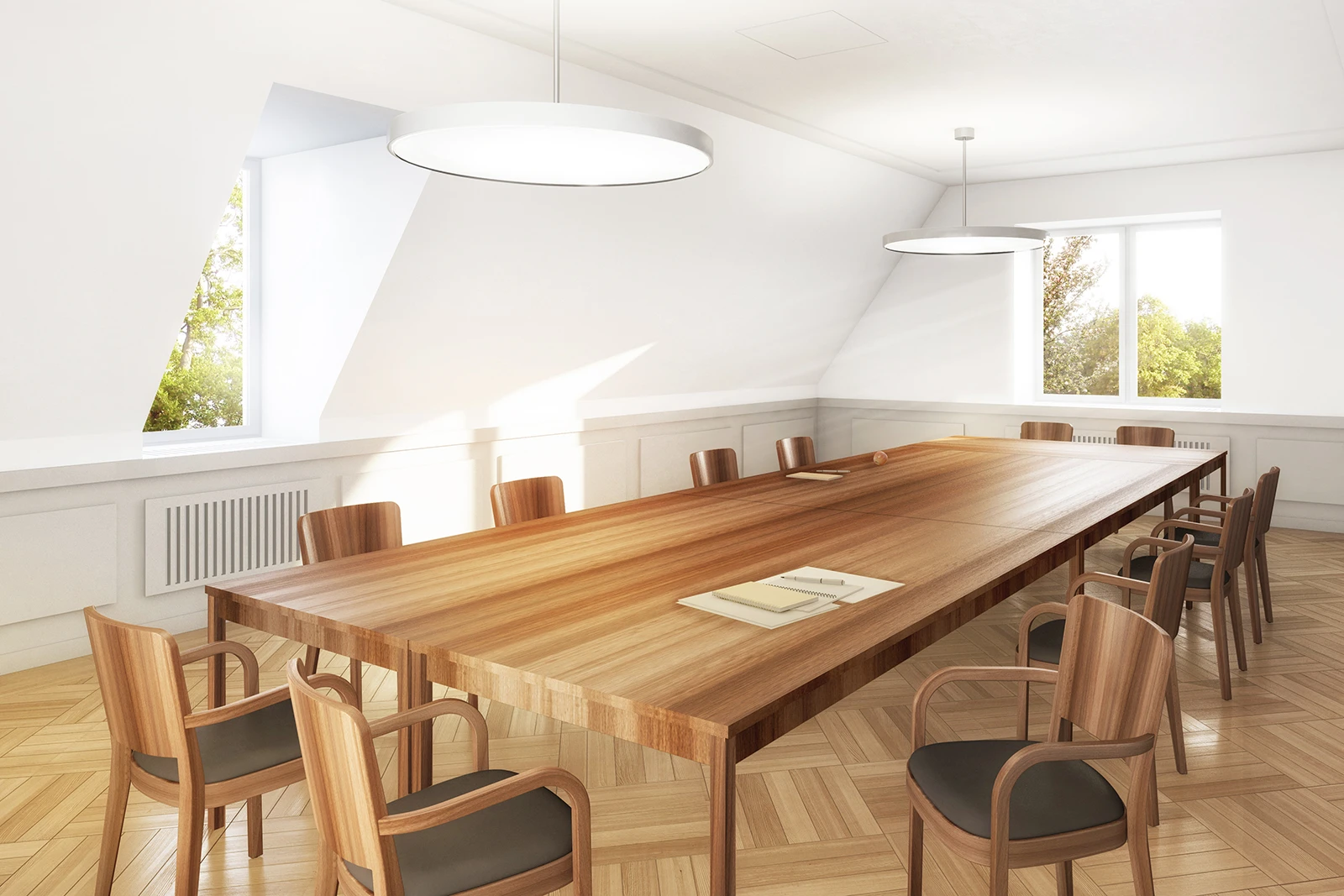 A proposed seminar room, approximately 40 m2 in size, is envisioned under the pitched roof, leveraging the existing central skylight. Working with the lack of a direct view of the surrounding park and trees on this floor, a textile wall covering is proposed to introduce a green, floral ambiance. This choice also subtly nods to the villa's original hand-painted wallpaper by Hans Sandreuter.