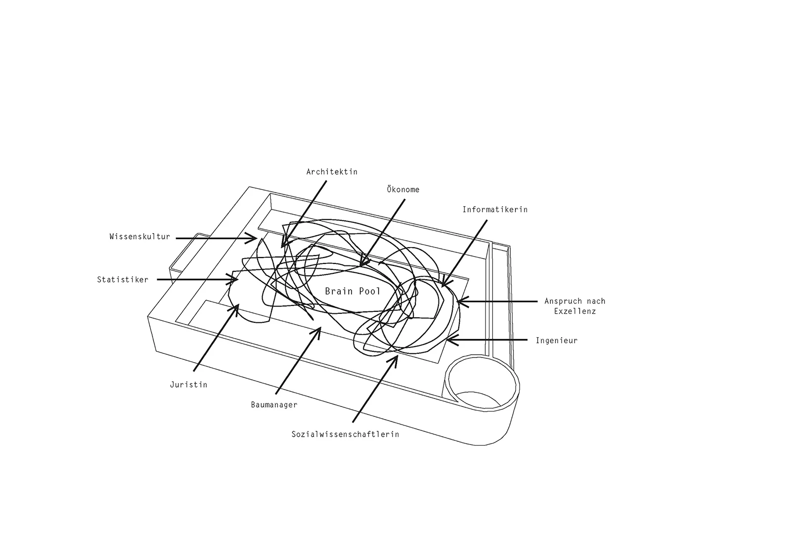 Inspired by the collective knowledge of Wüest & Partner’s employees, the “brain pool” concept materializes as a central library. This library serves not only as a repository of knowledge, but also as a space for learning and communication. The ring that houses the library both organizes and delineates the space, separating the central multifunctional open area from the adjacent zones.