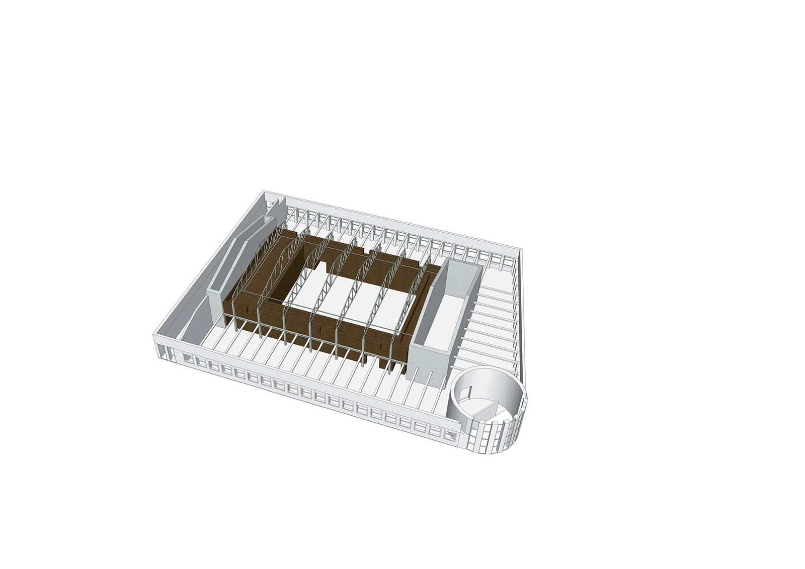 The technical modifications include ventilation, cooling, and electrical distribution. Together, they optimize both functionality and acoustics. The ring houses installations for power, data, cooling and heating, and air treatment. This also ensures the integration of fire protection and other functional aspects. These technical enhancements allow the library to evolve as an integrative center for both analog and digital work. As reflected in its architectural design, this space affirms the fusion of past and future; tradition and innovation.