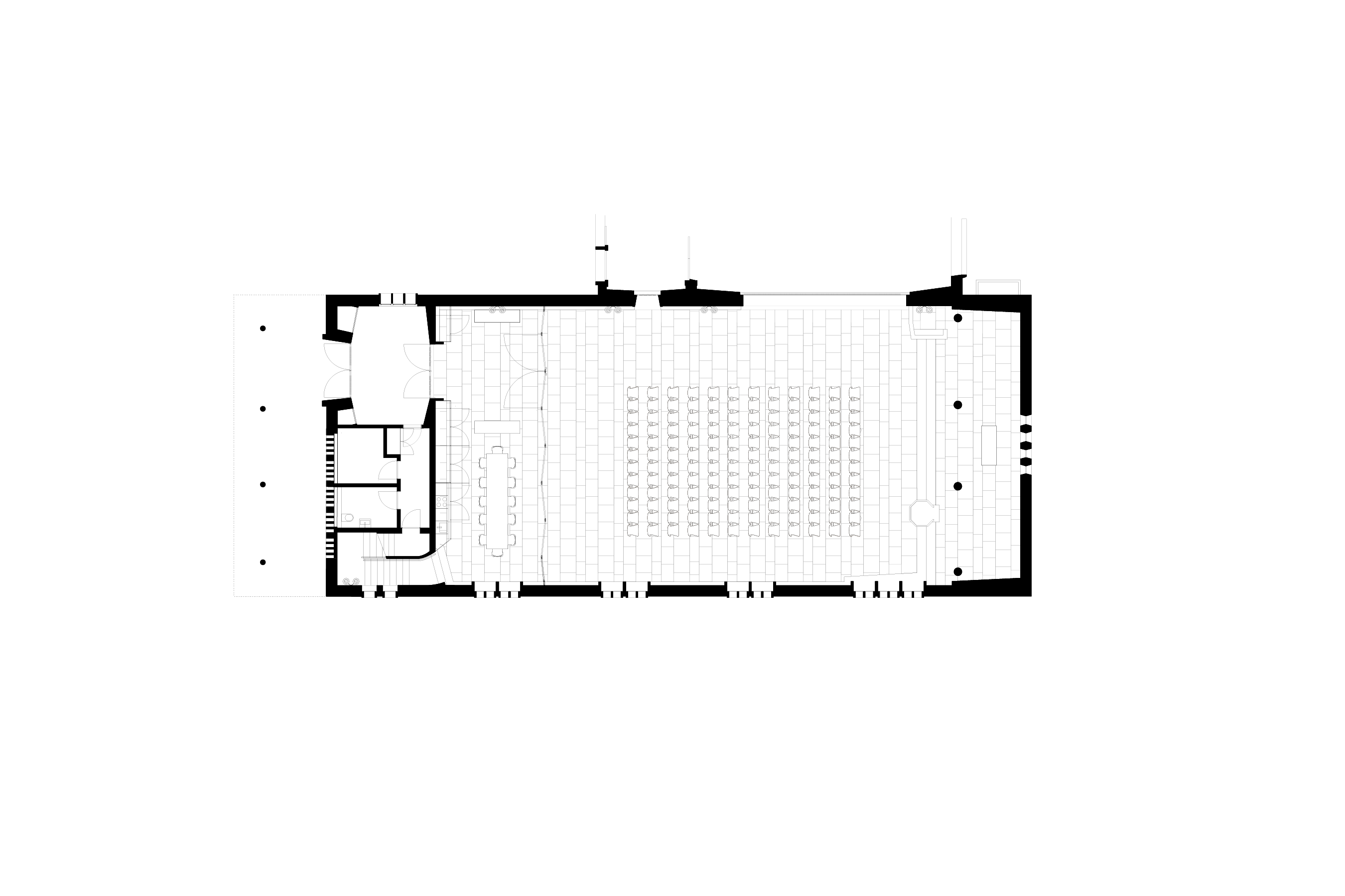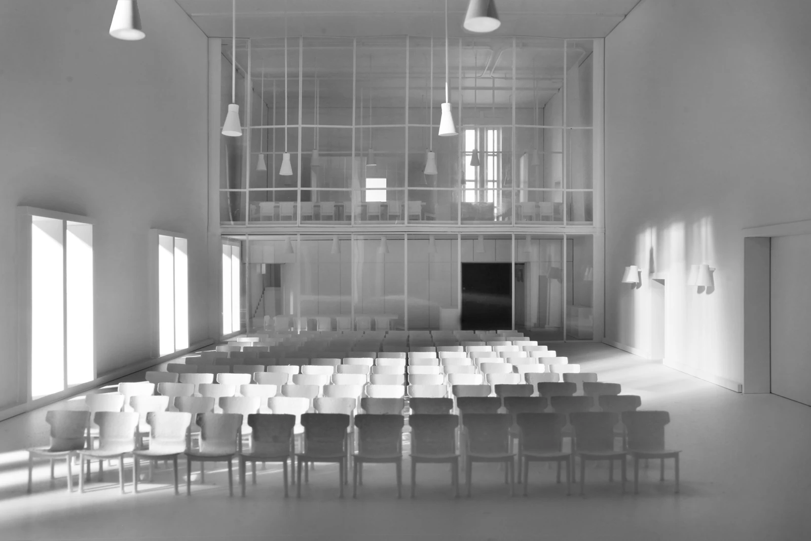 Eine räumliche Erweiterung dockt als fünf Meter breite Raumschicht an die bestehende Empore an. Konzeptionell erscheint der Einbau als grosses hölzernes Möbel, das sich als Raumkissen auf die vorhandene steinerne Struktur legt und mit einer Schrankschicht im Bereich der Teeküche eine Verbindung zum Boden herstellt. Treppen, Regale und eine Meetingbox für vertrauliche Gespräche sind darin integriert. Betreten die Besuchenden diese intim anmutende Box, offenbart sich ihnen ein kleines, archaisches Haus. Ein grosses, in den Giebel eingeschnittenes Oberlicht schafft einen räumlichen Bezug zum Umraum. Betreten die Besuchenden die intim anmutende Box, offenbart sich ihnen im Inneren ein archaisches Haus. Ein grosses in den Giebel eingeschnittenes Oberlicht schafft einen räumlichen Bezug in den Umraum.