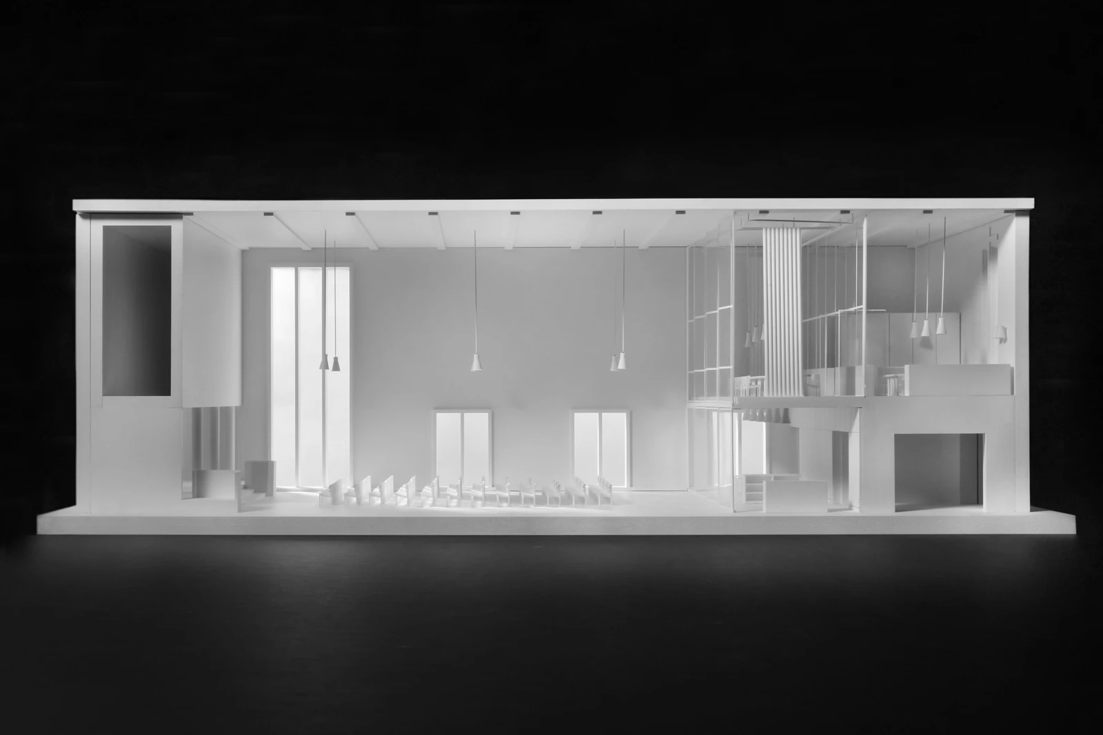 Designed for a competition, the spatial extension connects as a 5-metre-wide space to the existing gallery. This new addition appears as a large piece of wooden furniture that rests, as a room cushion, against the original stone structure. The design further introduces a layer of cupboards in a kitchenette and precisely positioned stairs, frames, and an enclosed meeting box for private discussions. Upon entering this intimate, box-like space, visitors are welcomed by an ambiance of an archaic dwelling. A generously sized skylight carved into the gable spatially references the exterior.