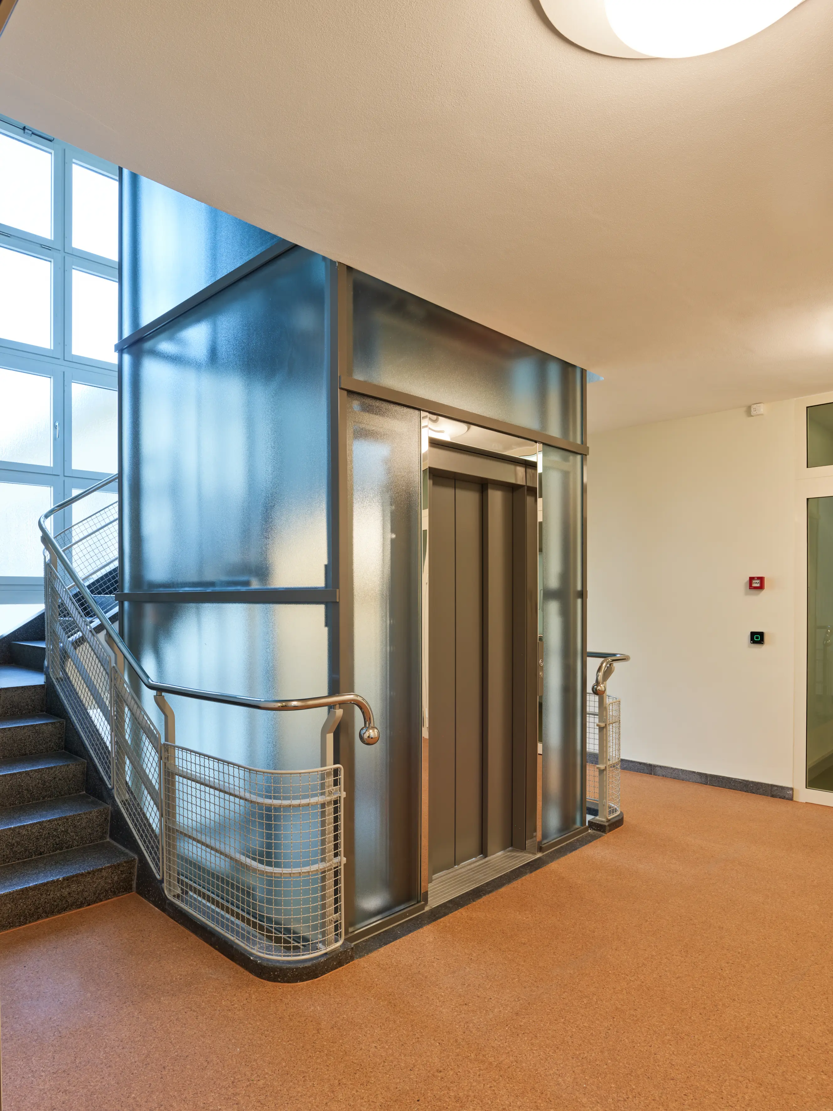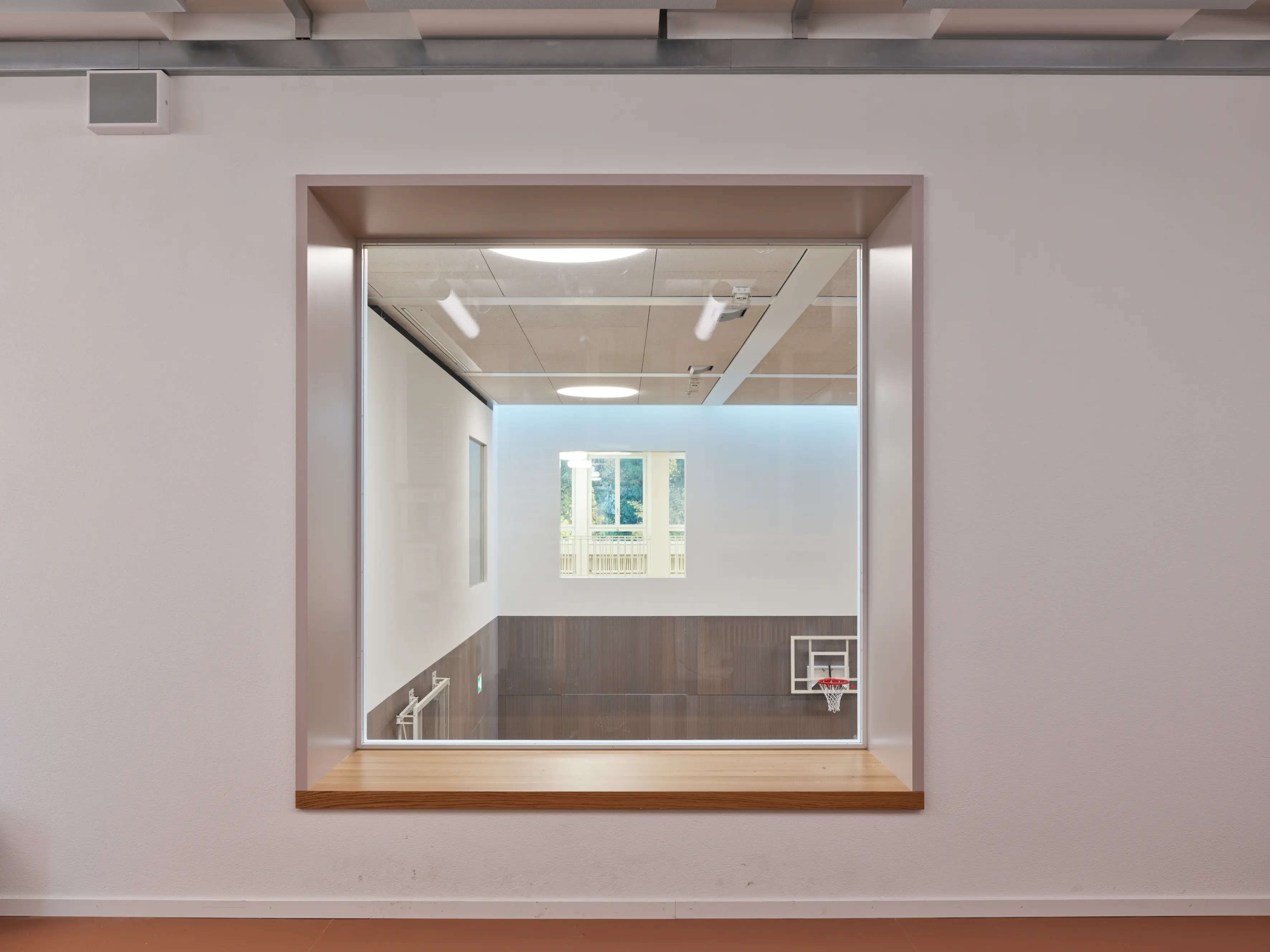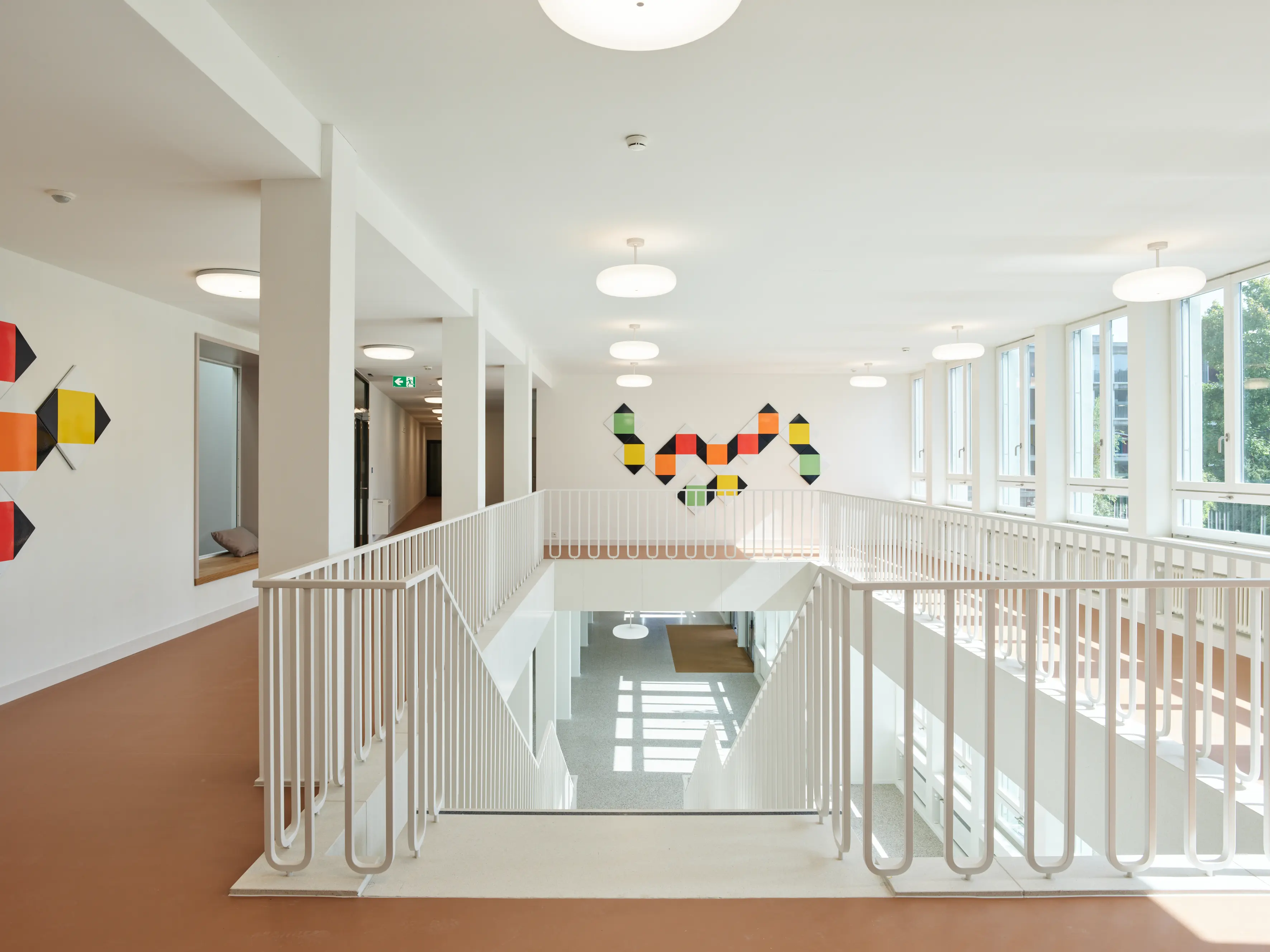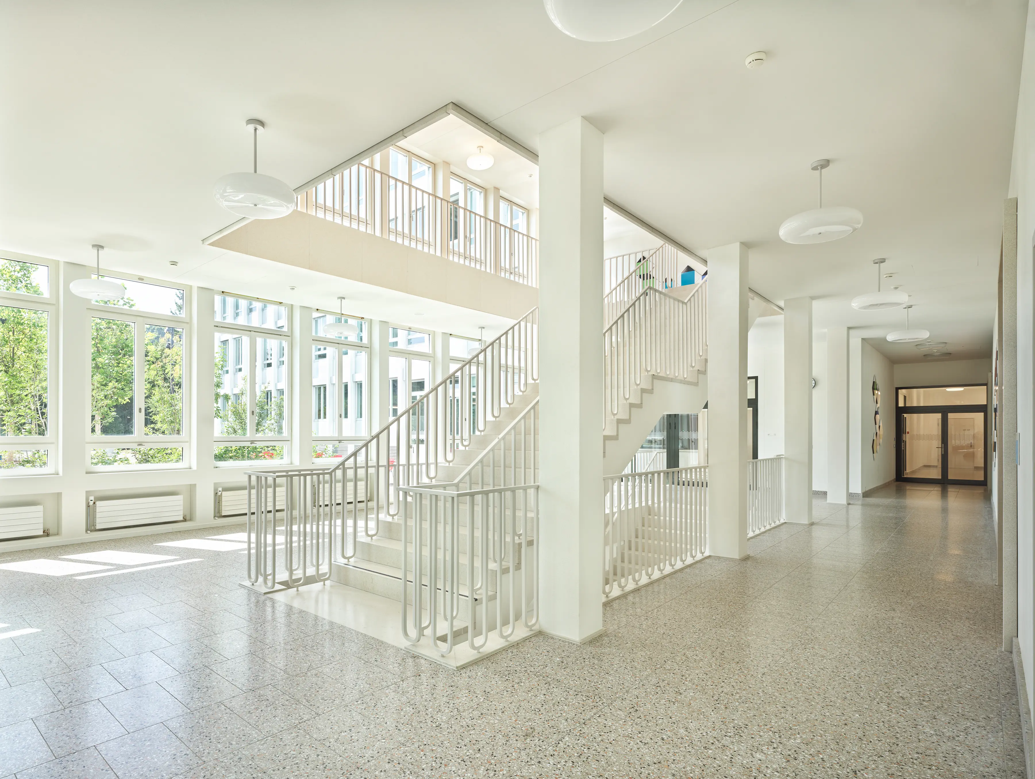 Secondary school students will reach their classrooms via a newly introduced staircase, leading up from the foyer. The tower, formerly a radio broadcasting hub, will provide a perfectly suitable layout for educational use: the space is to be organized into clusters, each consisting of three classrooms, two breakout rooms, and a common area, promoting contemporary educational and caregiving concepts. On the ground floor, plans include a cafeteria, a kitchen, and a terrace, meeting the requirements of an all-day school. Dedicated spaces for physical education, including a gym and an activity room, will be made available, as well.
