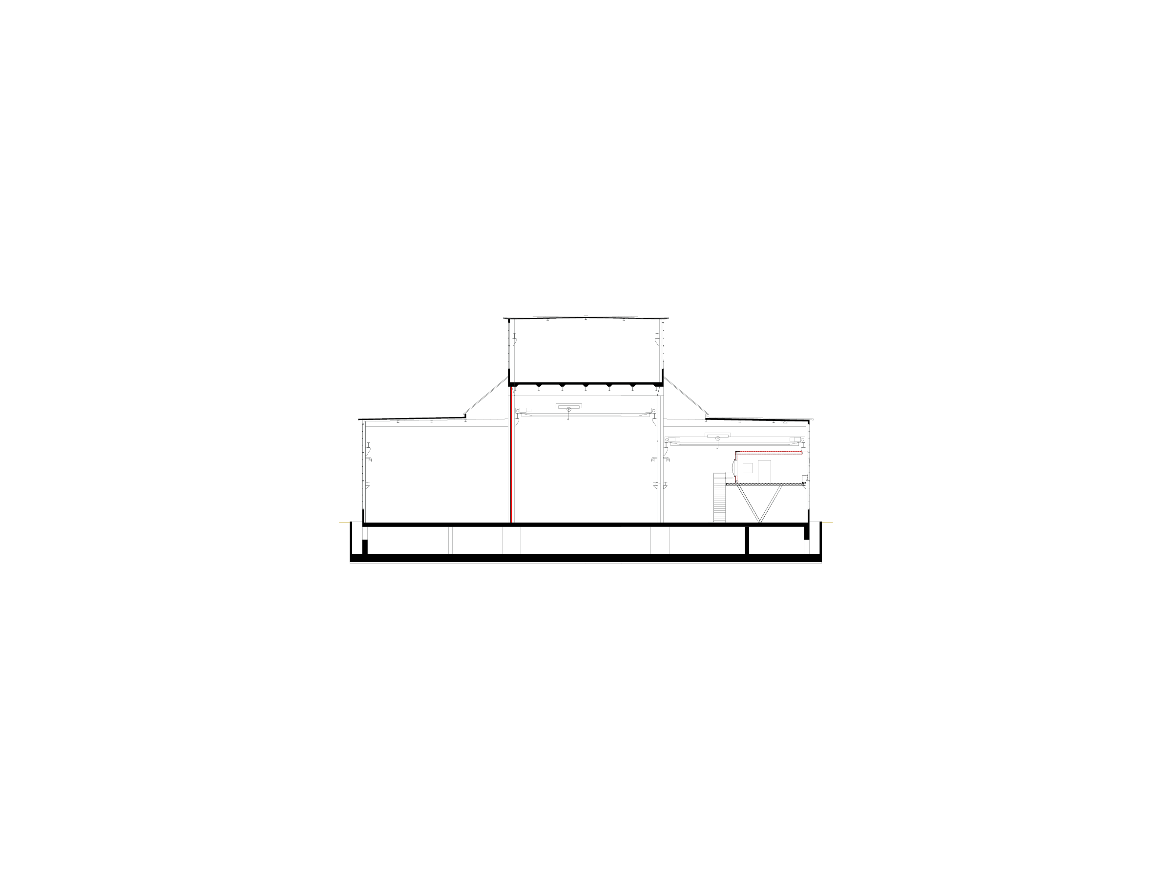 Exceeding those production needs, additional areas are reserved for small exhibitions, staff rooms, and office spaces, newly integrated within the vast production hall, which accommodates forty workstations. Functionally aligned with the original industrial facade, the workstations designated for cutting and assembling the tarps are arranged directly below this new office space, all reinforced by V-shaped pillars maintaining the monolithic floor slab.