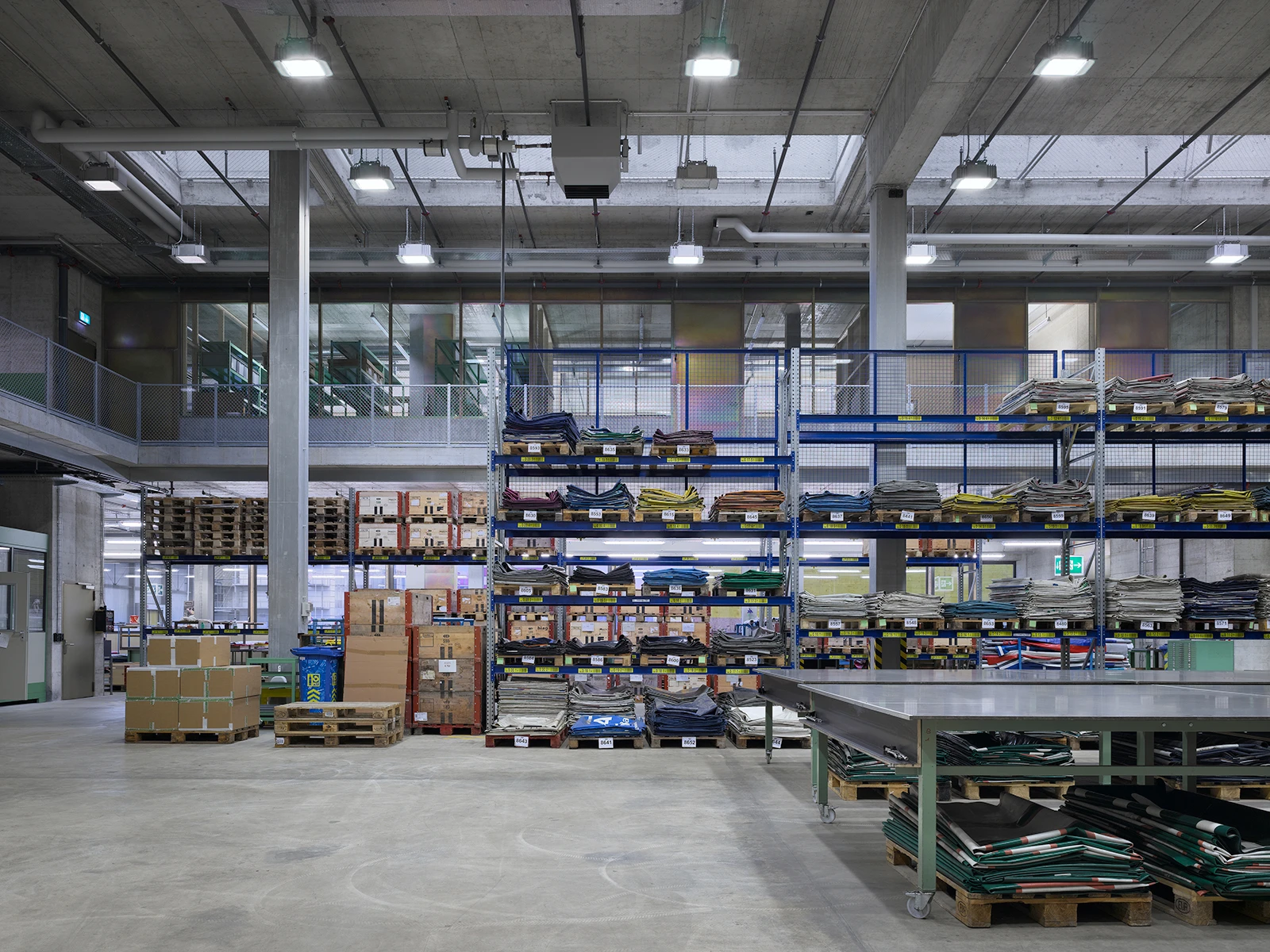 Die Zuschnittplätze, Kontroll- und Logistikzentren finden sich in der hohen Haupthalle. In diesen Grossraum wurde ein Zwischengeschoss mit zugehörigen Büroeinheiten eingeschrieben. In den Obergeschossen mit Dachkantine und Fabrikladen finden sich die Büros der Entwicklung und der Administration. Einfache Holzständereinbauten zonieren die roh gehaltene Grossstruktur und verleihen ihr räumliche Spannung.