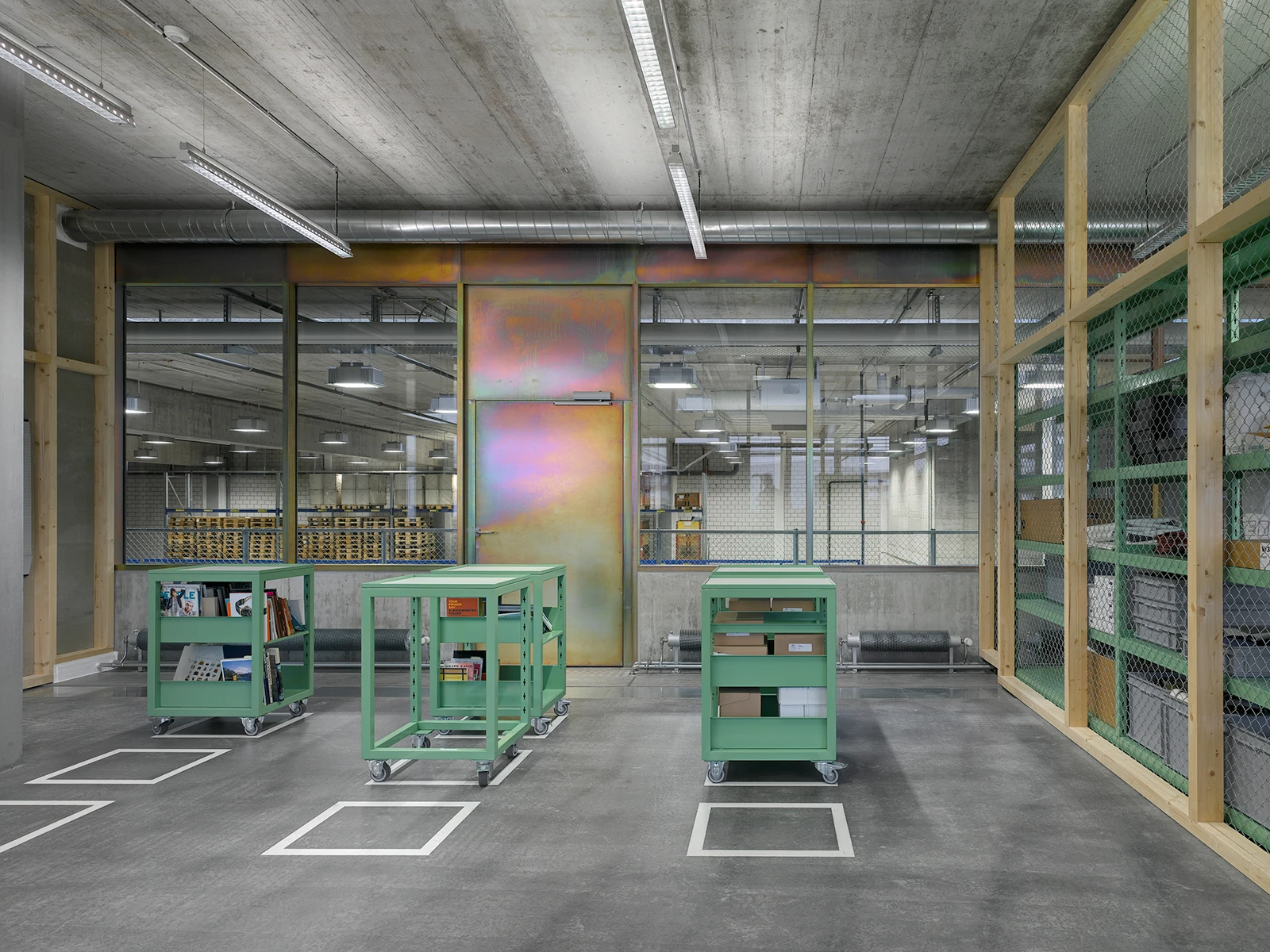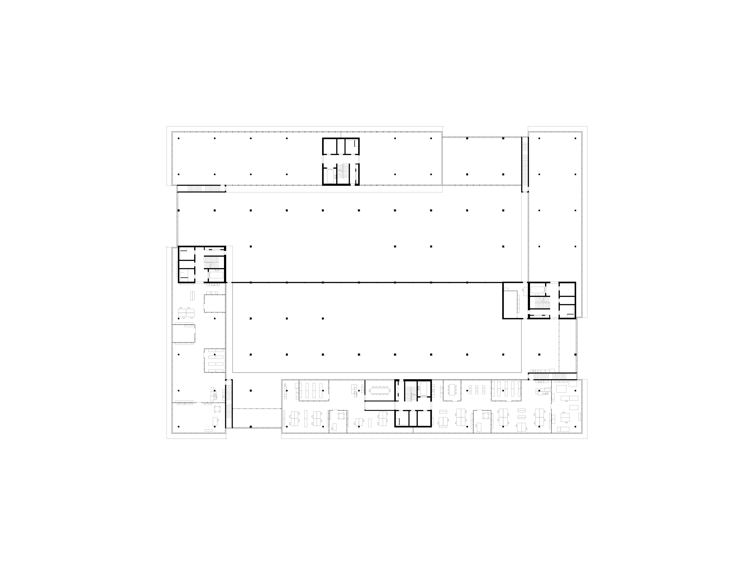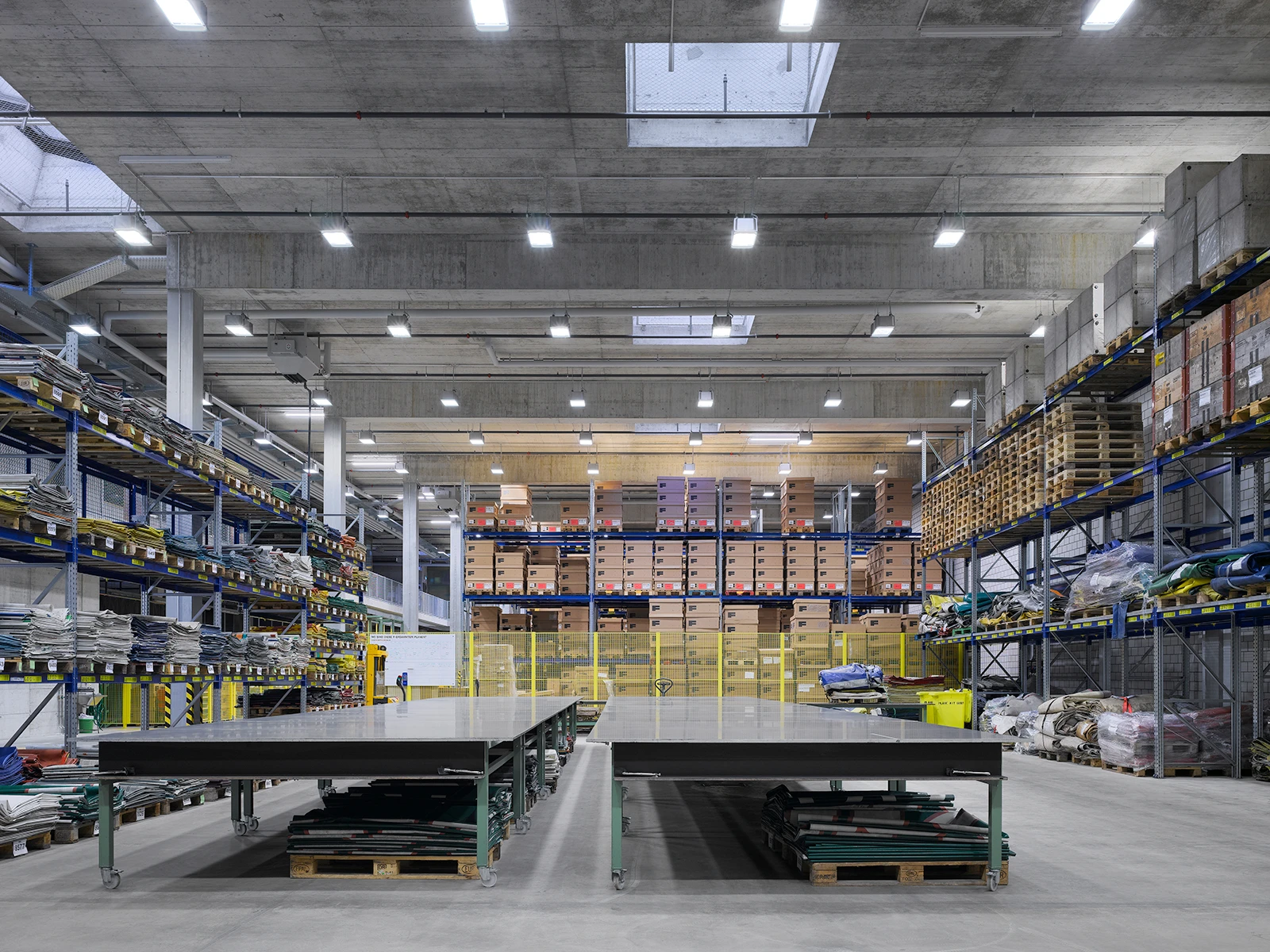 The central high-ceilinged hall houses cutting stations as well as control and logistics centers. A mezzanine level with offices has been superimposed in this large space. The upper floors contain development and administration offices, alongside a roof canteen and a factory shop. Simple timber-frame fixtures divide the large, unfinished space, adding a sense of spatial tension.