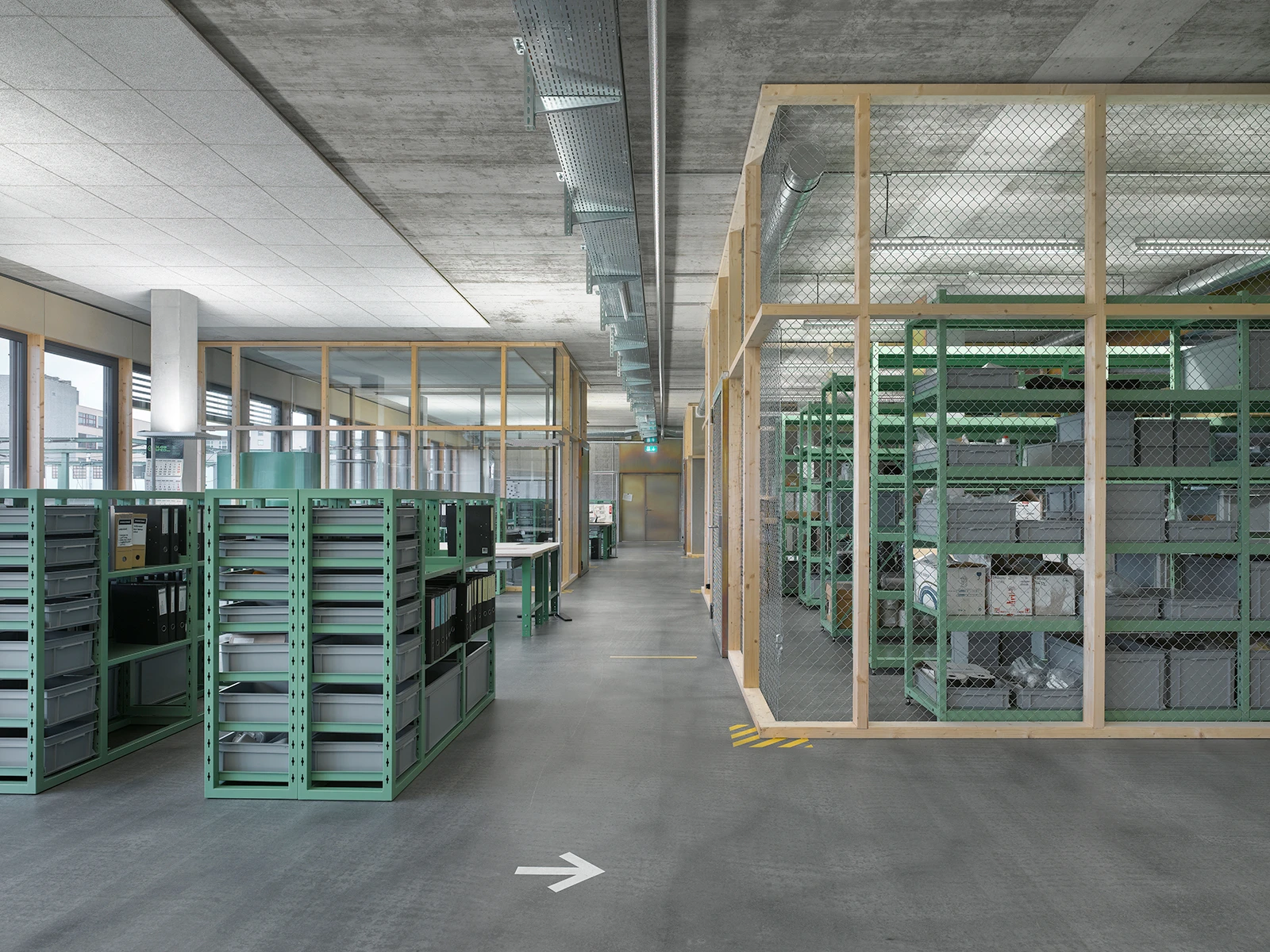Je nach Funktion der Räume werden die Holzständer entweder mit Glas (Einzelbüros), zementgebundenen Spanplatten (Meetingräume) oder metallenem Diagonalgeflecht (Lagerbereiche) einseitig verkleidet oder bespannt. Die Zugänge zu den Geschossen werden farblich und funktional mittels Aufenthaltsbereichen (Biopoints) und Druckerzonen inszeniert.