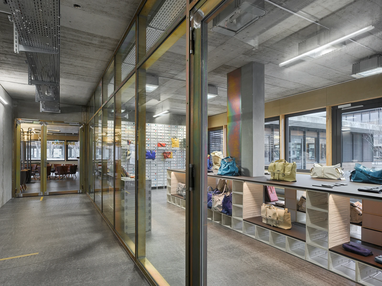 The Freitag factory in Zurich-Oerlikon is housed in the Noerd commercial building designed by Rothen Architektur in 2010. Featuring production facilities and design studios, as well as logistics and administration, the floor, 10’000-square-meter space accommodates over 120 employees. The facility also includes a staff canteen and a factory shop. The heart of production is the newly developed, eco-friendly rainwater-powered industrial washroom in the basement.