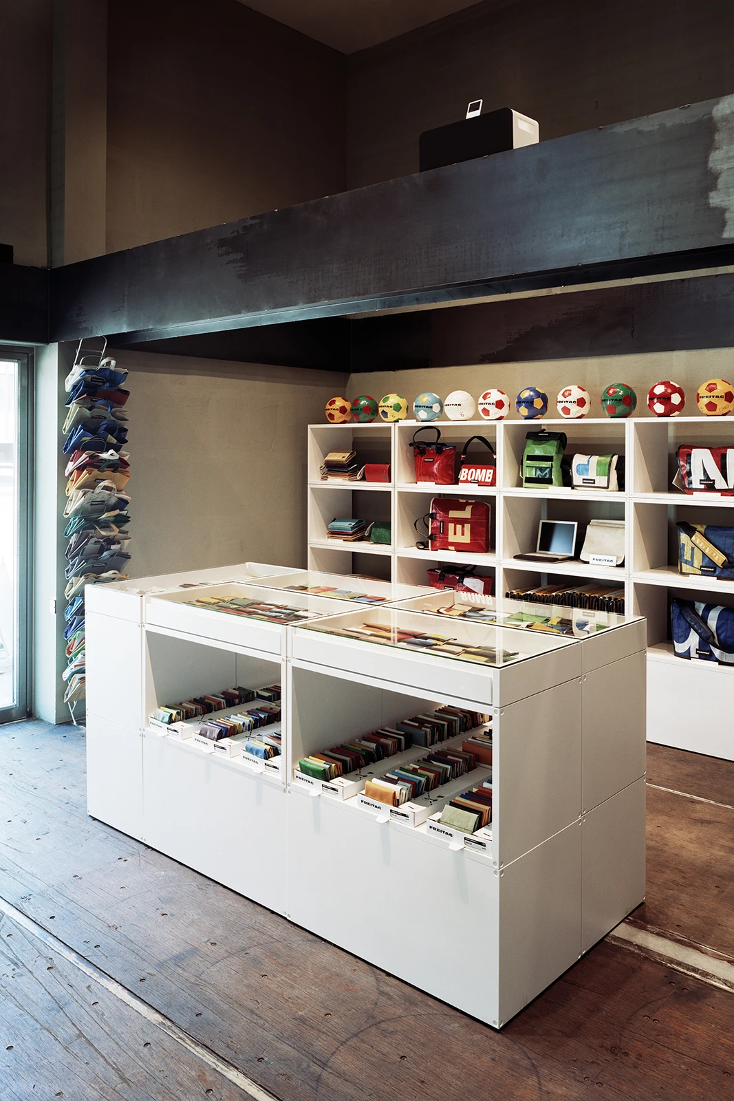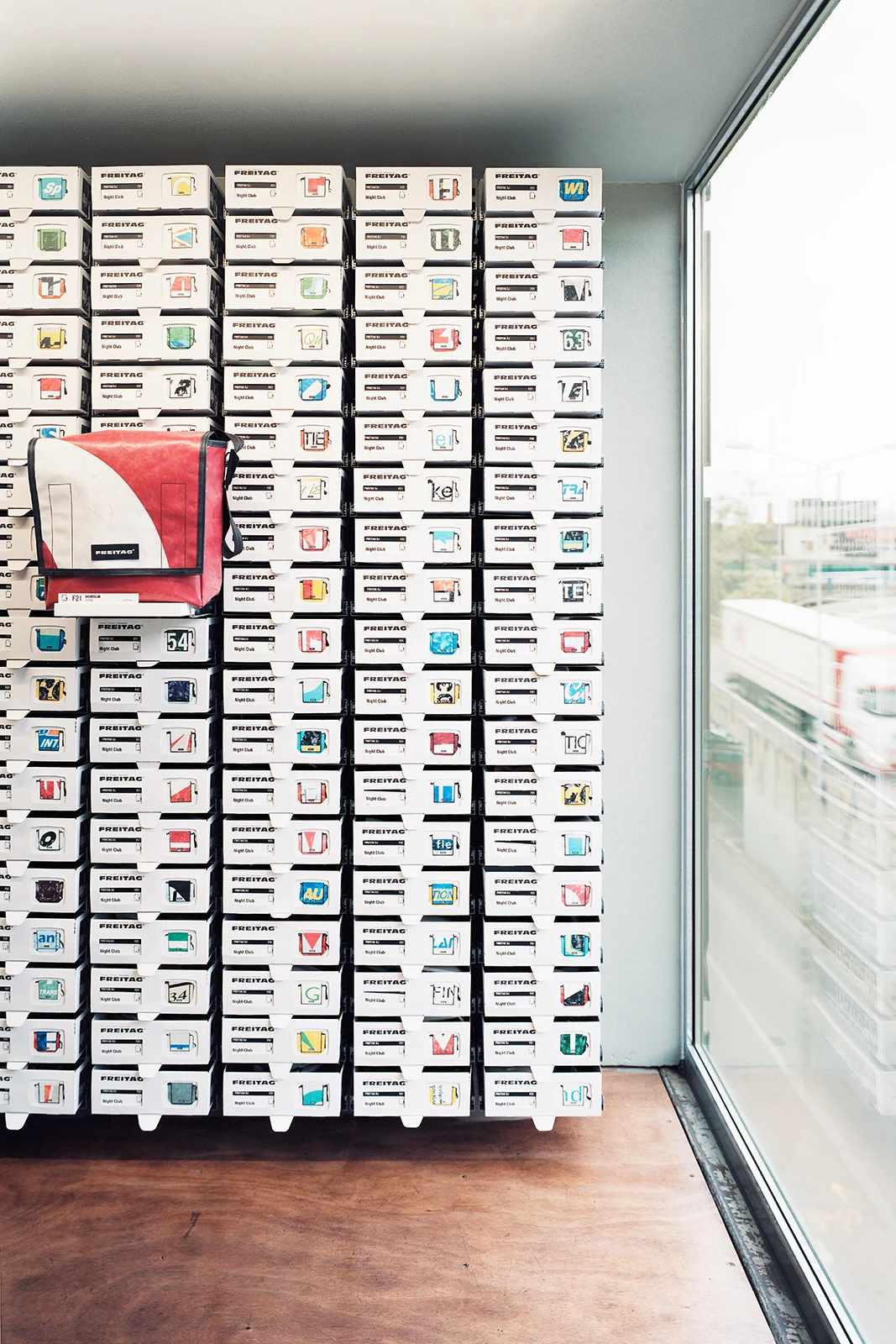 Originally built from 17 units with a subsequent extension of the shop by 2 lateral modules, today 19 refurbished overseas containers form the Freitag Flagship Store. The containers were sourced in Hamburg and transported by rail to Zurich. The stacking of the units is based on their original design logic: only connecting elements from the shipping industry are used, thus ensuring simple dismantling.