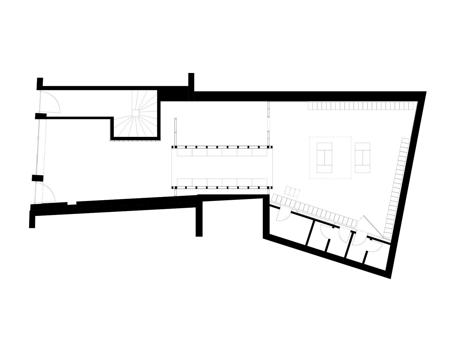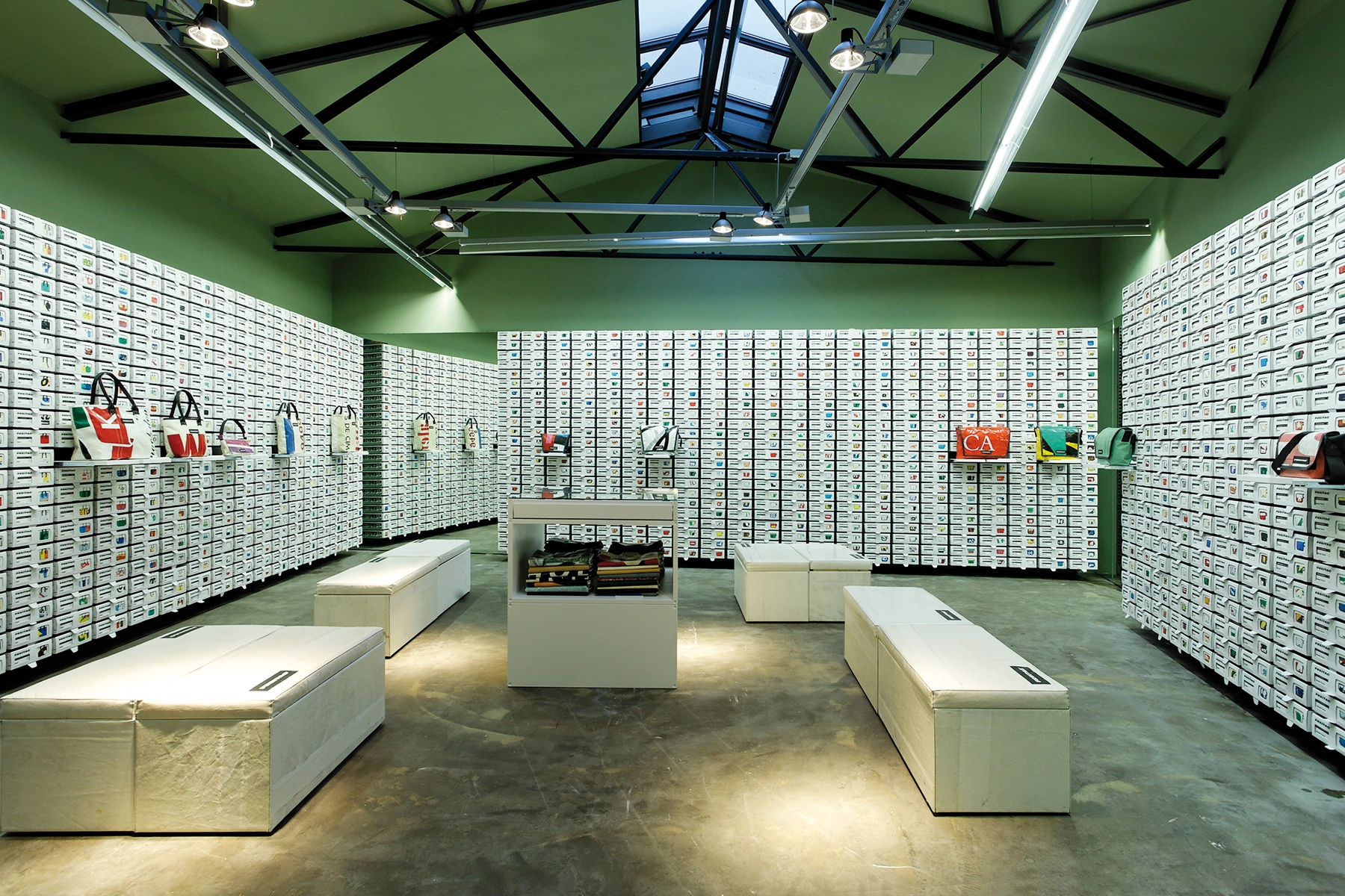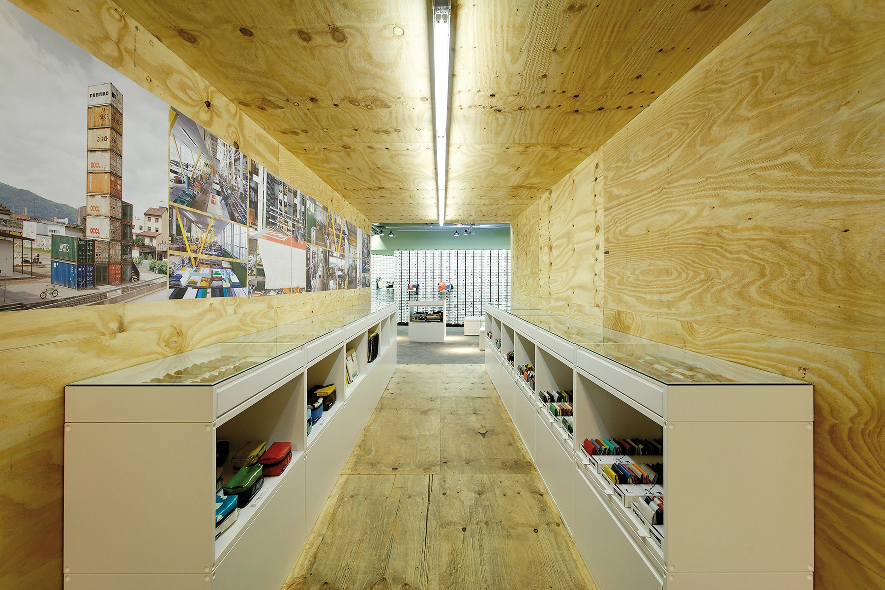The spatial conditions of an existing structure in Cologne were not initially suited for commercial use. The layout consisted of a small shop window at the front, followed by a narrow, tunnel-like corridor leading to a large, skylit back room. Eventually, this spatial arrangement inspired the design concept for Freitag’s Cologne store: A wooden tunnel leading to one of the largest collections of Freitag bags north of Zurich.
