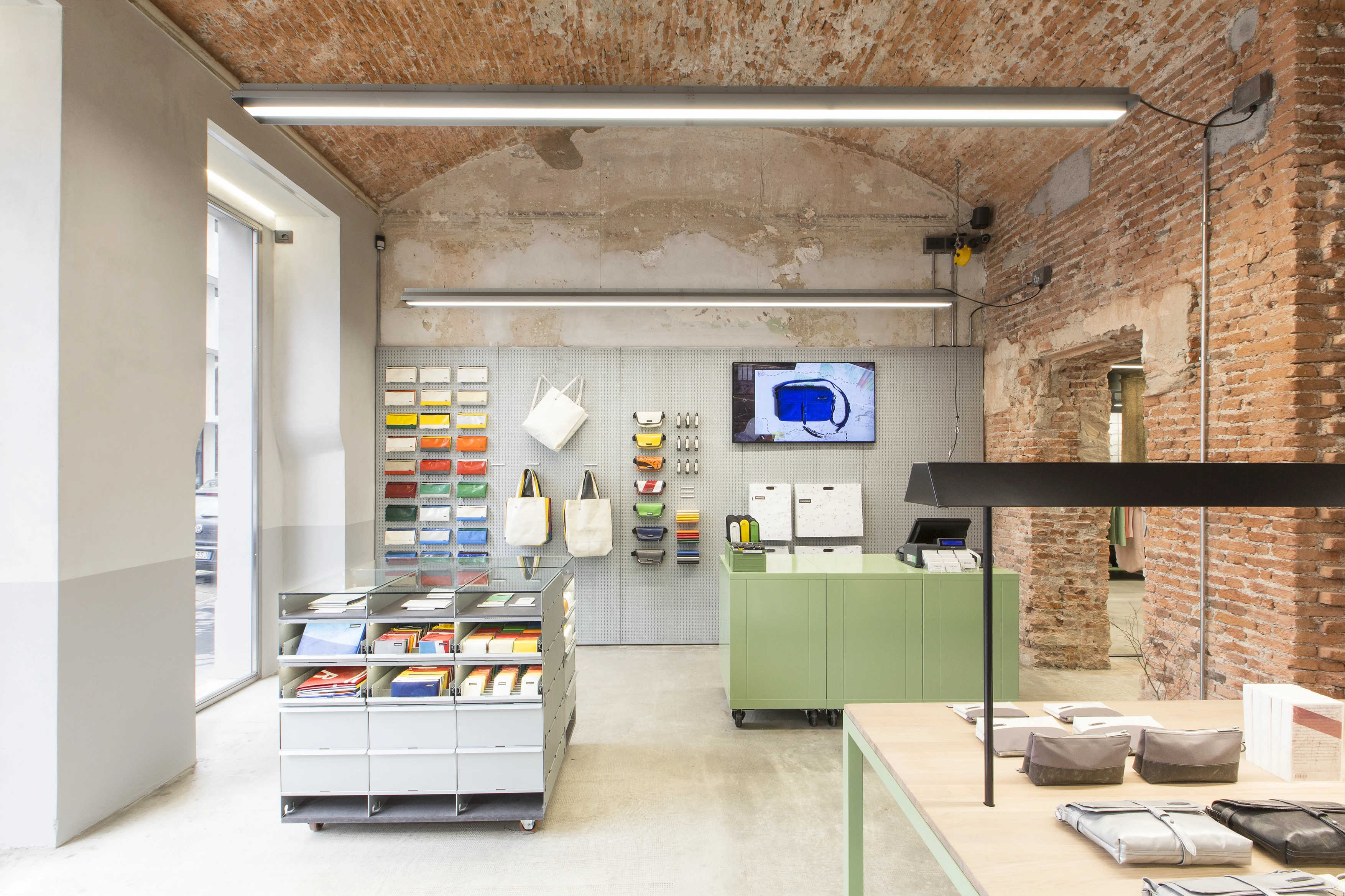 Nach Jahren der Suche stimmte Lage, Raumgrösse und baulicher Zustand mit den formulierten Prämissen für ein Ladenlokal von FREITAG in Mailand überein. Neben den obligaten und bewährten rund 1’000 Taschenplätzen im von Freitag entwickelten Verkaufsregal V30 soll neu zum ersten Mal auch das vollständige Kleidersortiment “Fabric” in Kombination mit der bewährten Taschenkollektion “Reference” räumlich kohärent Platz finden.