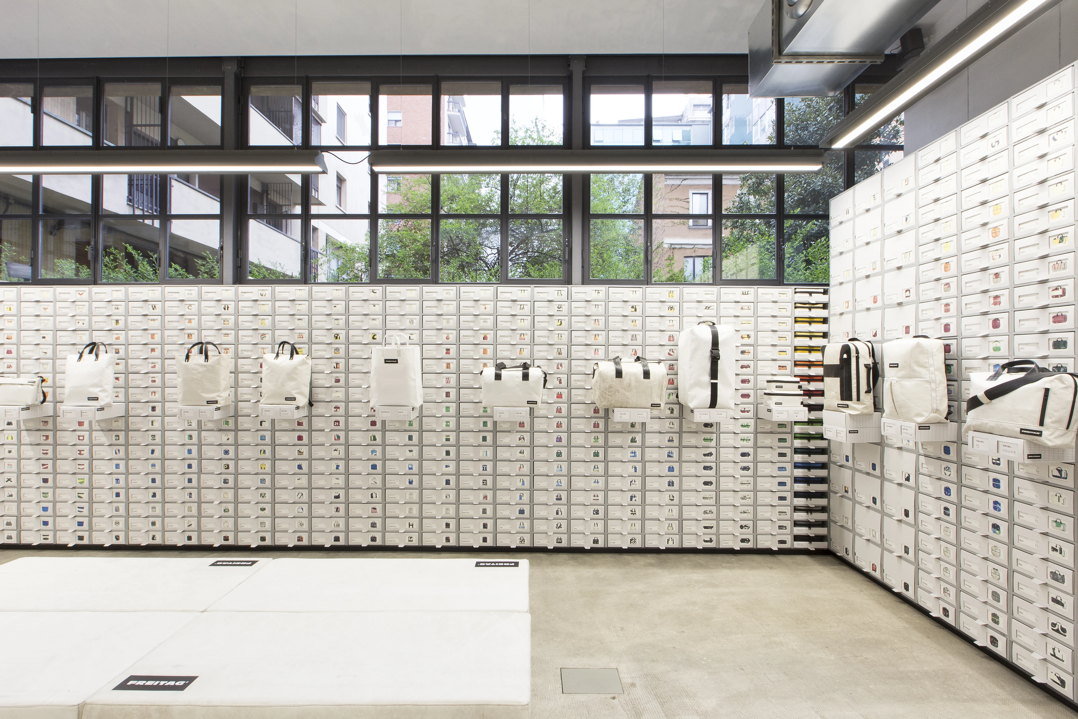 Als Kassentresen dienen industrielle Werkzeugkorpusse von Lista, und die Taschenregale V30 und V200, von FREITAG selbst entwickelt, kommen konsequent zur Anwendung. Die klare, nüchterne Farbgebung und Ausgestaltung der Möblierung, des Bodenbelags und der Beleuchtung kontrastieren den warmen gemauerten Bogenraum bis hin zum hofseitigen Industrieanbau.