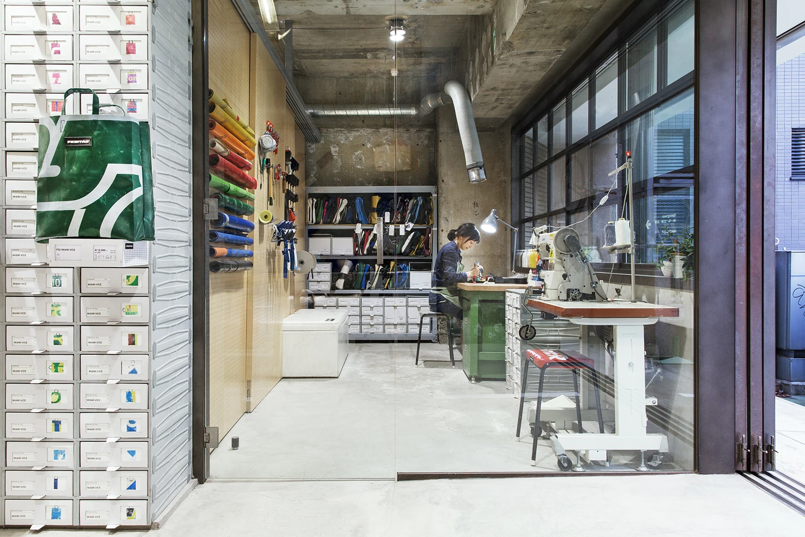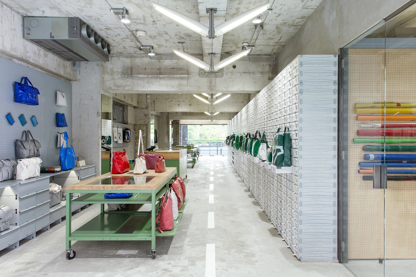 Set in Shibuya, a busy shopping and fashion district, the Freitag Store Tokyo capitalizes on a unique opportunity to connect two streets and provide shopfronts on both sides.