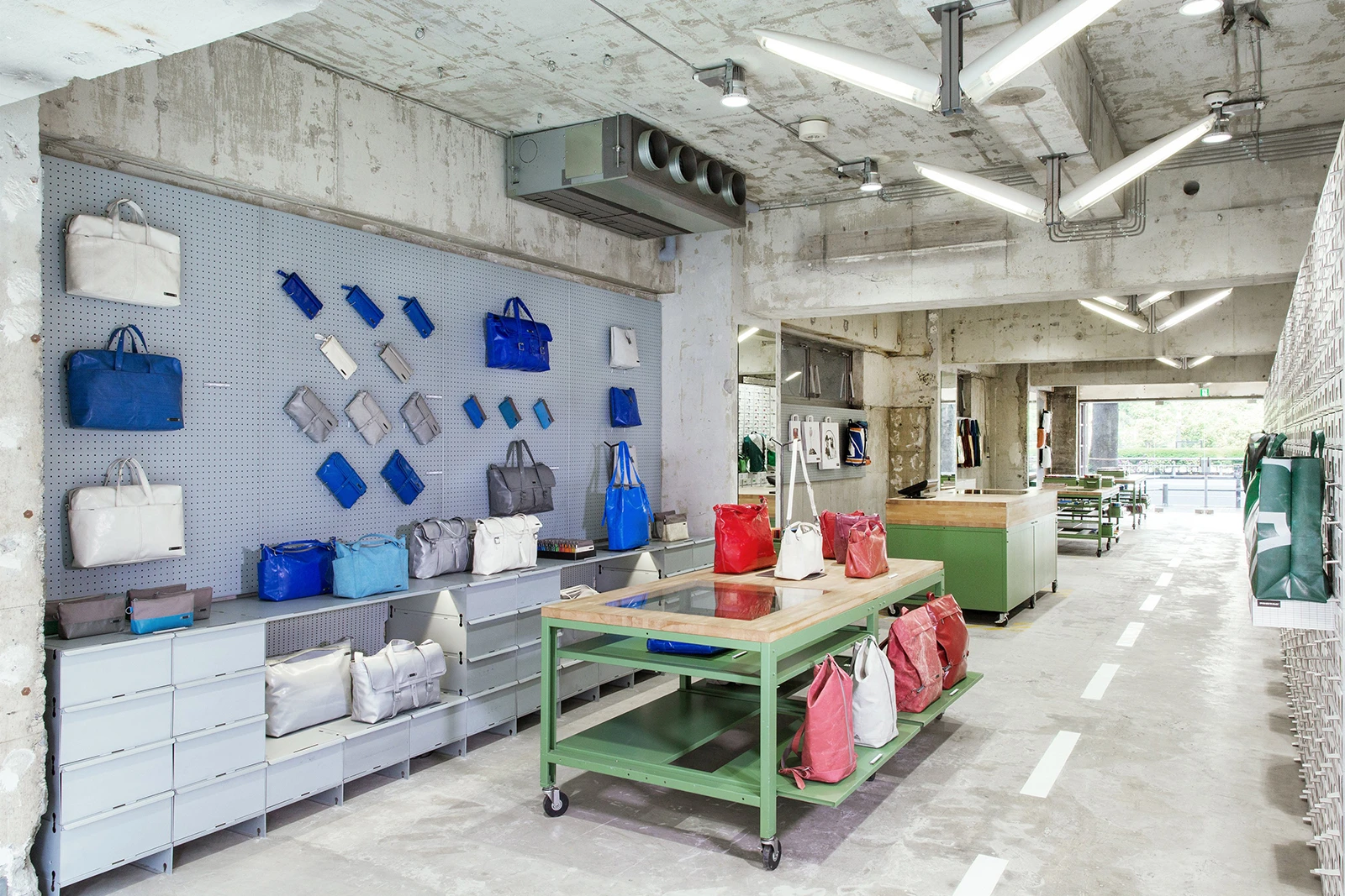 Die Idee für das Ladenlayout war, eine 'Freitag Strasse' zu schaffen. Im Inneren des Ladens wurden Strassenlaternen aus Tokio verwendet, um die Straße zu markieren und die Besucher durch den Laden zu führen. Es gibt fünf Verkaufsstellen, die jeweils unterschiedliche Dienstleistungen und Produkte anbieten. Dazu gehören ein Reparaturcenter, ein Fahrradverleih und ein Shop für die einzigartige Freitag-Referenzserie. Rohe Materialien und spezifische Objekte vermitteln die Idee der Marke und schaffen ein einzigartiges Einkaufserlebnis.