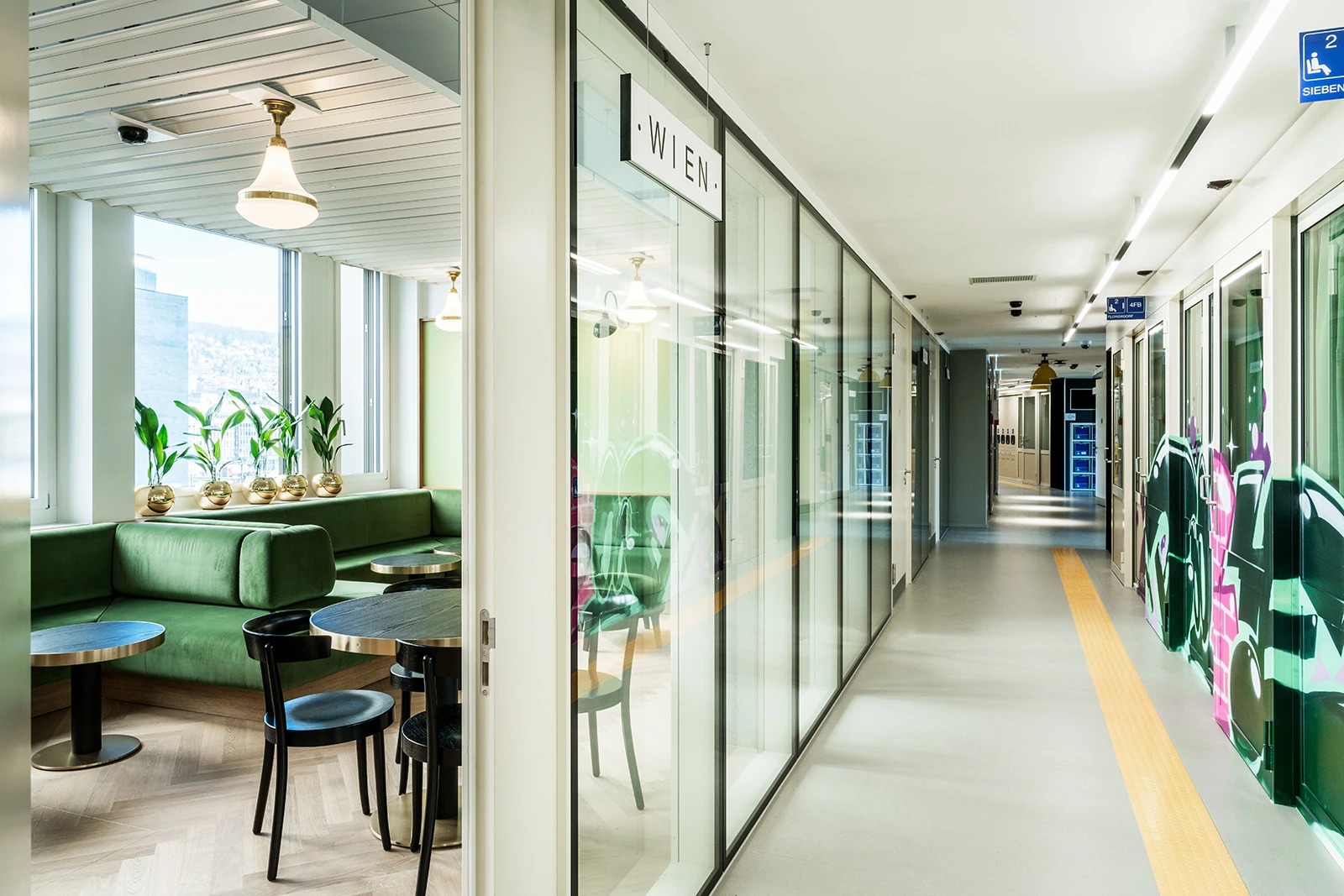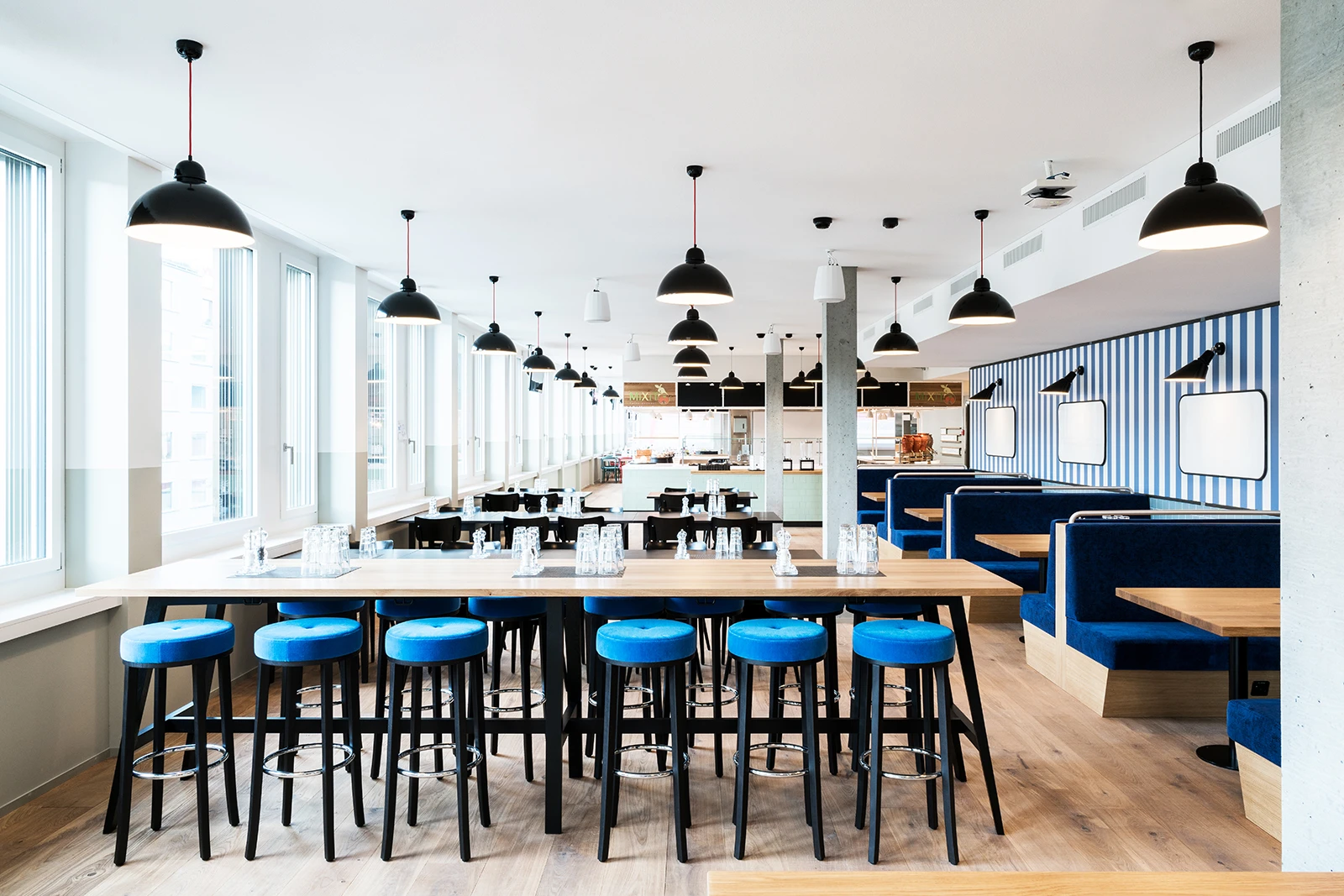 The various departments are each assigned to a European city. They are provided with an individual material, color, and furnishing concept that is atmospherically attuned to the respective city.