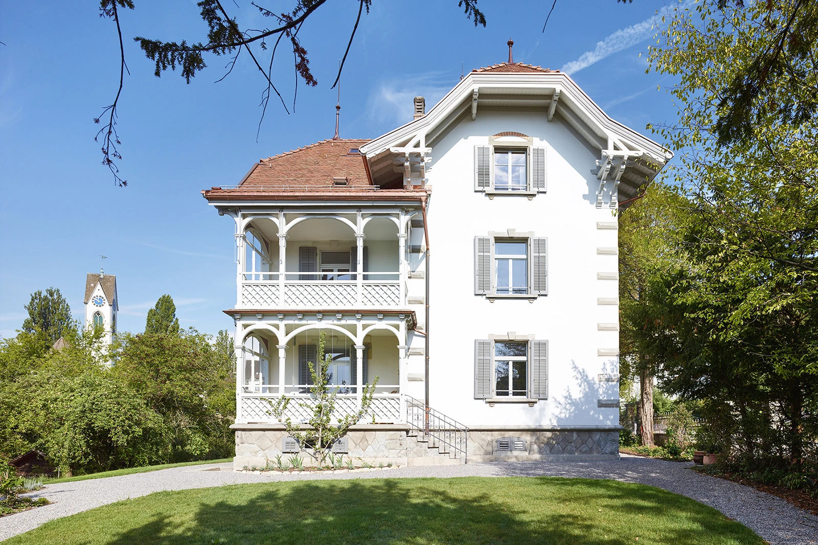 The listed Haus Zur Sommerau in Uetikon near Zurich stands on a ridge next to school buildings, a community center, and the Uetikon church hill. The property is defined by its large garden, featuring "Brezelwegen" pathways, plant beds, enclosures, and historical gates reminiscent of grand bourgeois residences.