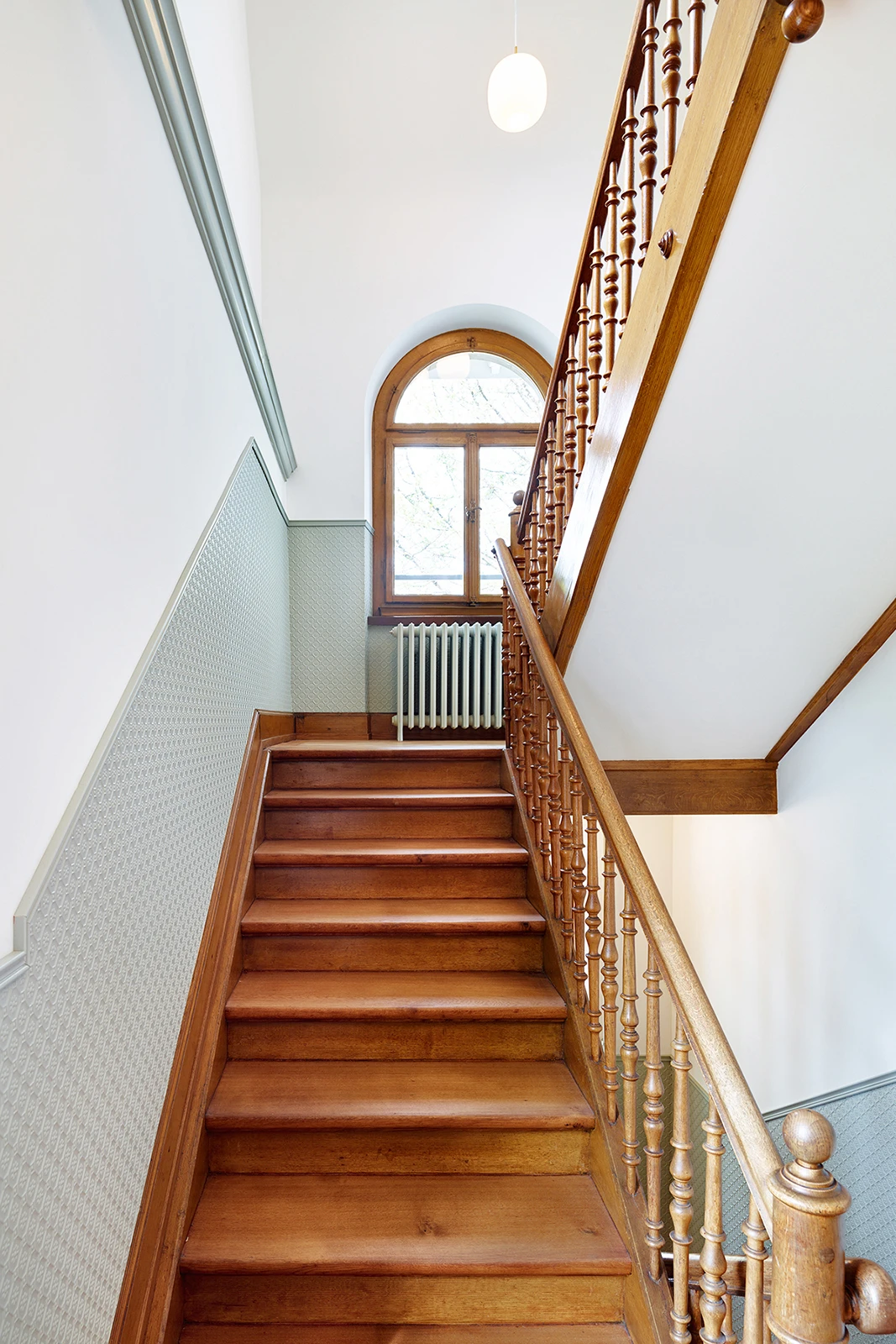 The historicist approach is reflected throughout the interior with elements such as ceiling stucco moldings, dadoes, intricate apartment doors, and painted faux wood, some still in their original condition. All of these features have been carefully restored according to preservation requirements. Additional insulation was introduced to the roof, along with three small windows. Most of the original tiles have been reused or supplemented by historical tiles from a conservation depot. Spatially, the intervention is limited to the kitchens and bathrooms on all floors, designed to integrate with the overall historical context and appearance of the building. The only significant modification in the layout was in the southeast room on the ground floor, where a portion was sectioned off for a cloakroom and guest toilet.