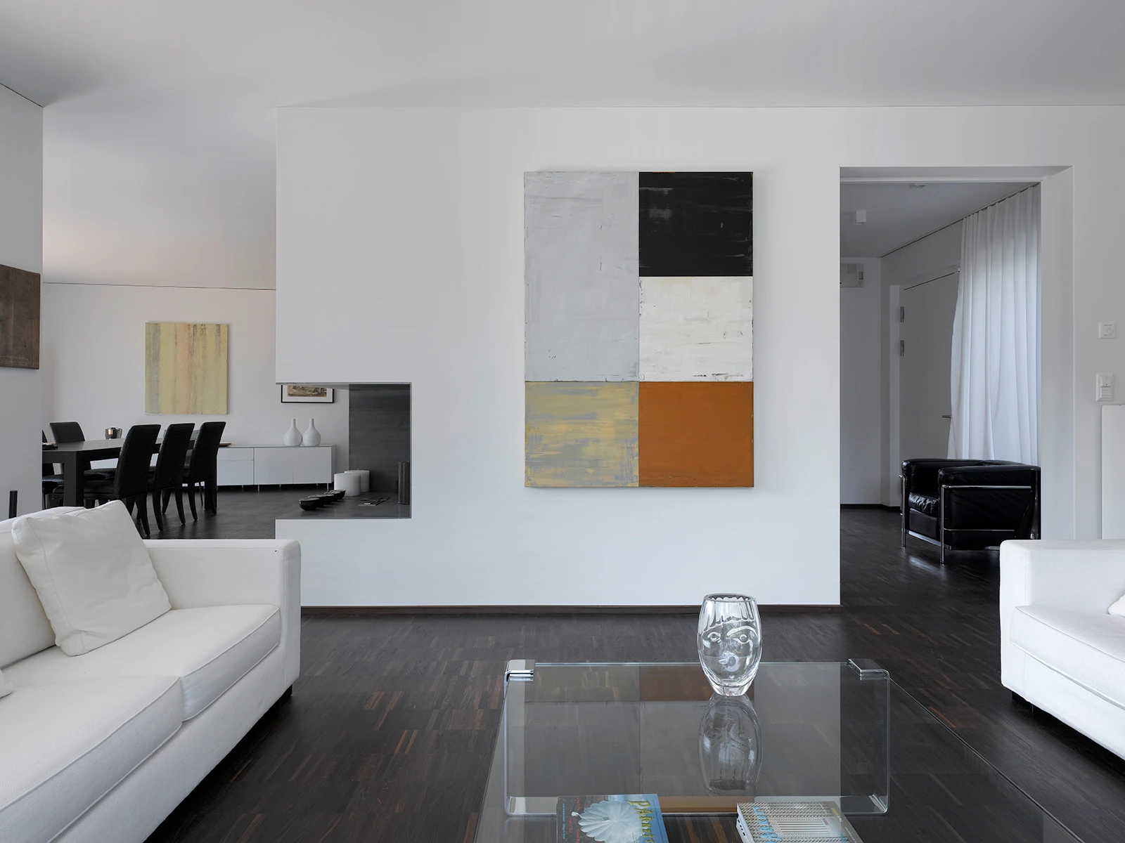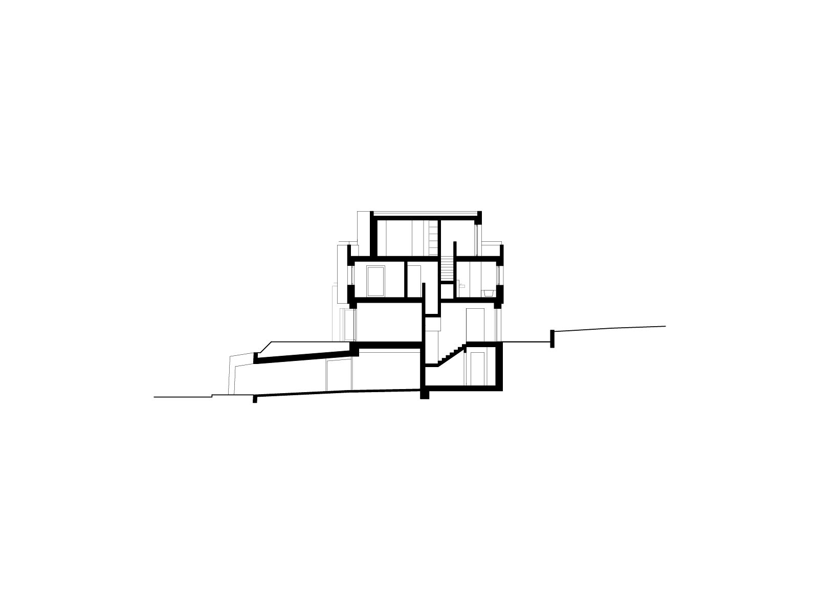 Wie ein Rückgrat führt ein Treppenkern durch das Gebilde und hält die kompakte innere Abwicklung zusammen. Die Schwere des Baukörpers verleiht dem Ort Präsenz und antwortet auf die anonyme neuere Architektur der Umgebung. Gleichzeitig steht er im Dialog mit einer mächtigen, hangseitig an das Haus grenzenden Föhre. Ein puristisch ausgestalteter Gartenraum umfasst den Körper, transformiert den Innen- in den Aussenraum und schafft im Zusammenspiel mit einer das Grundstück umschliessenden Hecke eine hohe wohnliche Intimität.