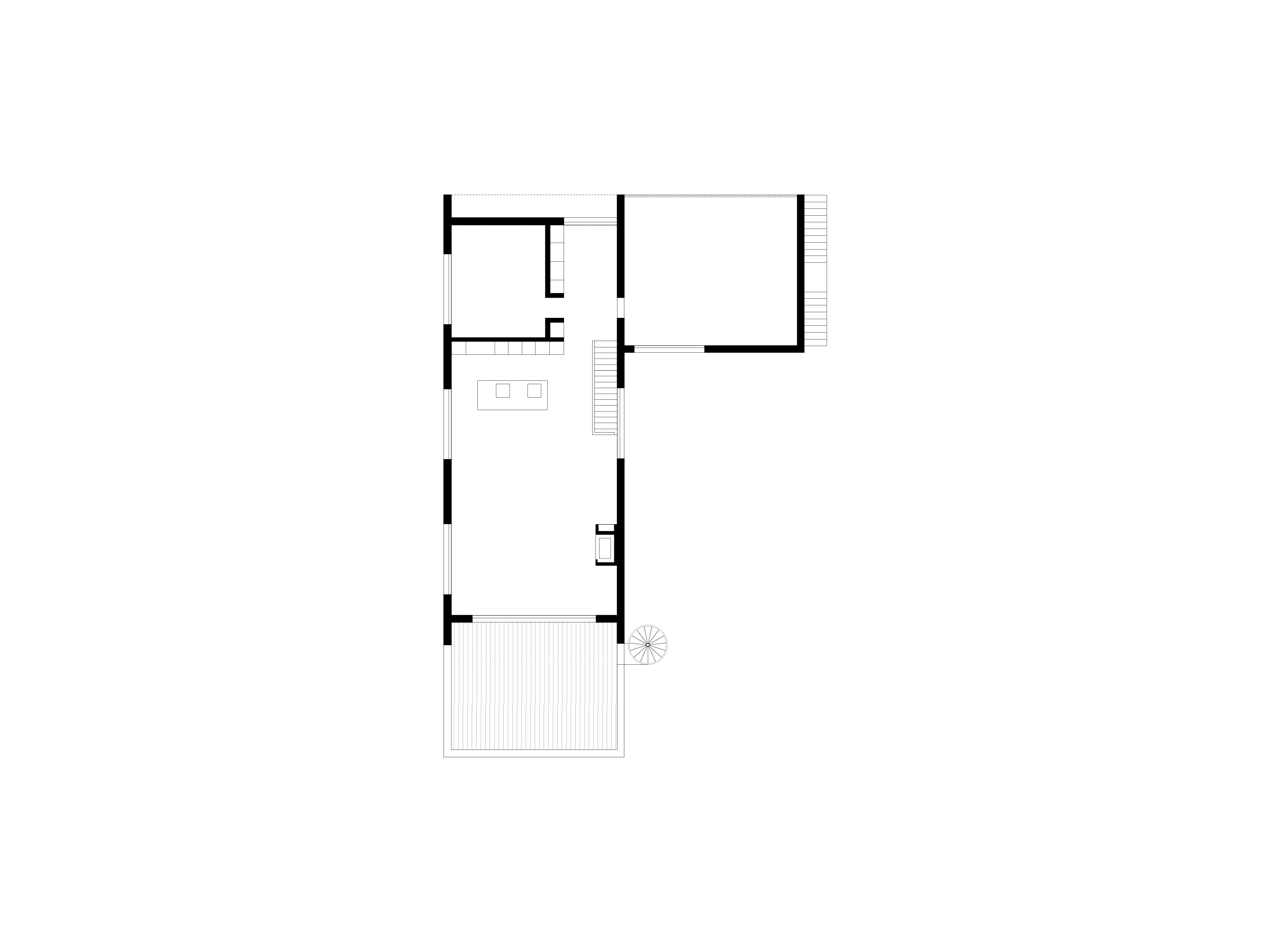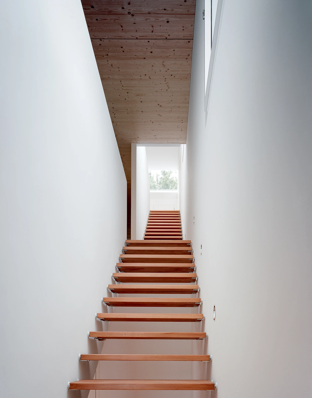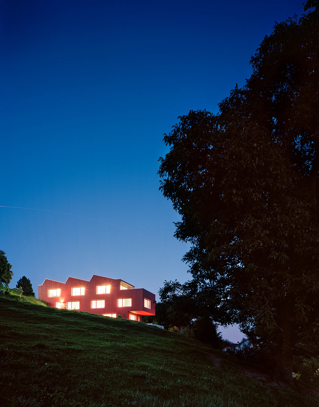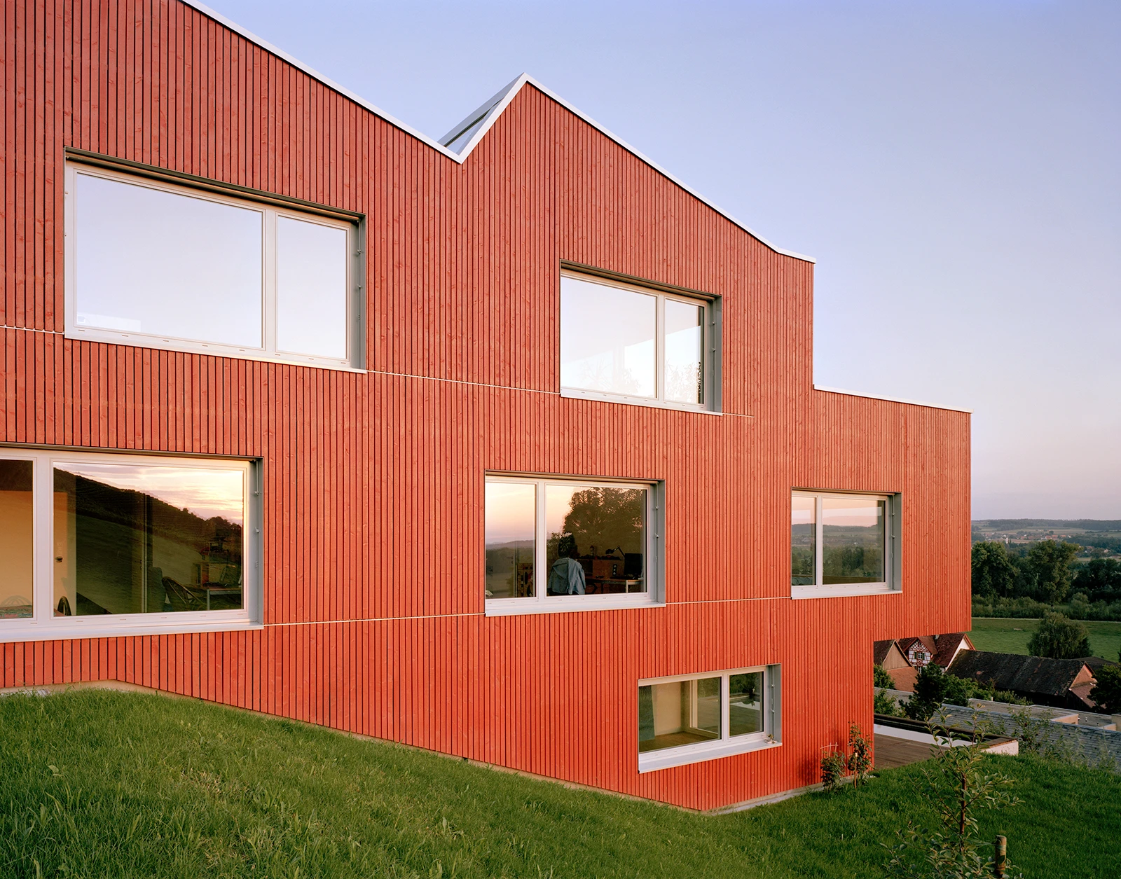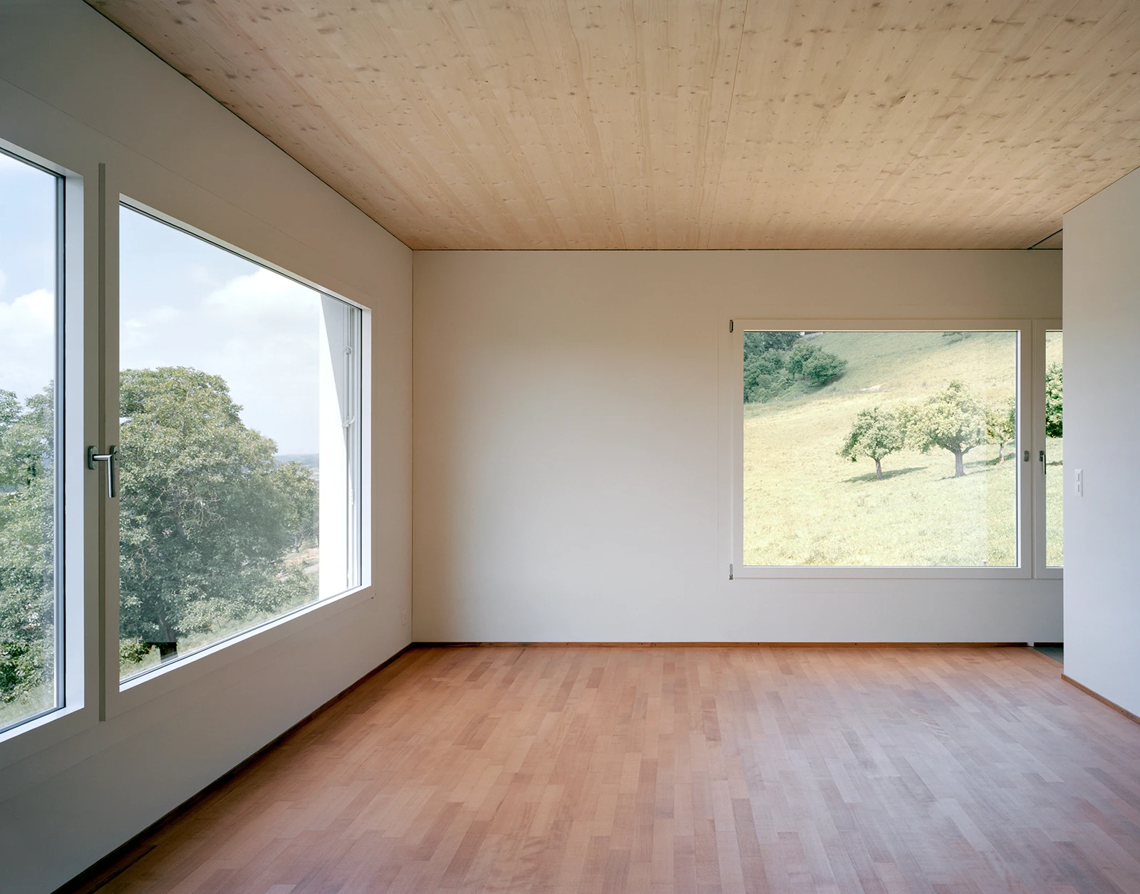 A 300-square-meter detached family house sits on an incline at the periphery of Üsslingen, Switzerland. The home is built as a sustainable, prefabricated timber structure atop a pre-cast concrete basement, while the existing topography shapes its placement. Its primary entrance on the top floor leads to a kitchen and living area. Subsequently, a staircase leads to the mid-level bedrooms and further down to the cellar that extends onto a terrace and an outdoor swimming pool.