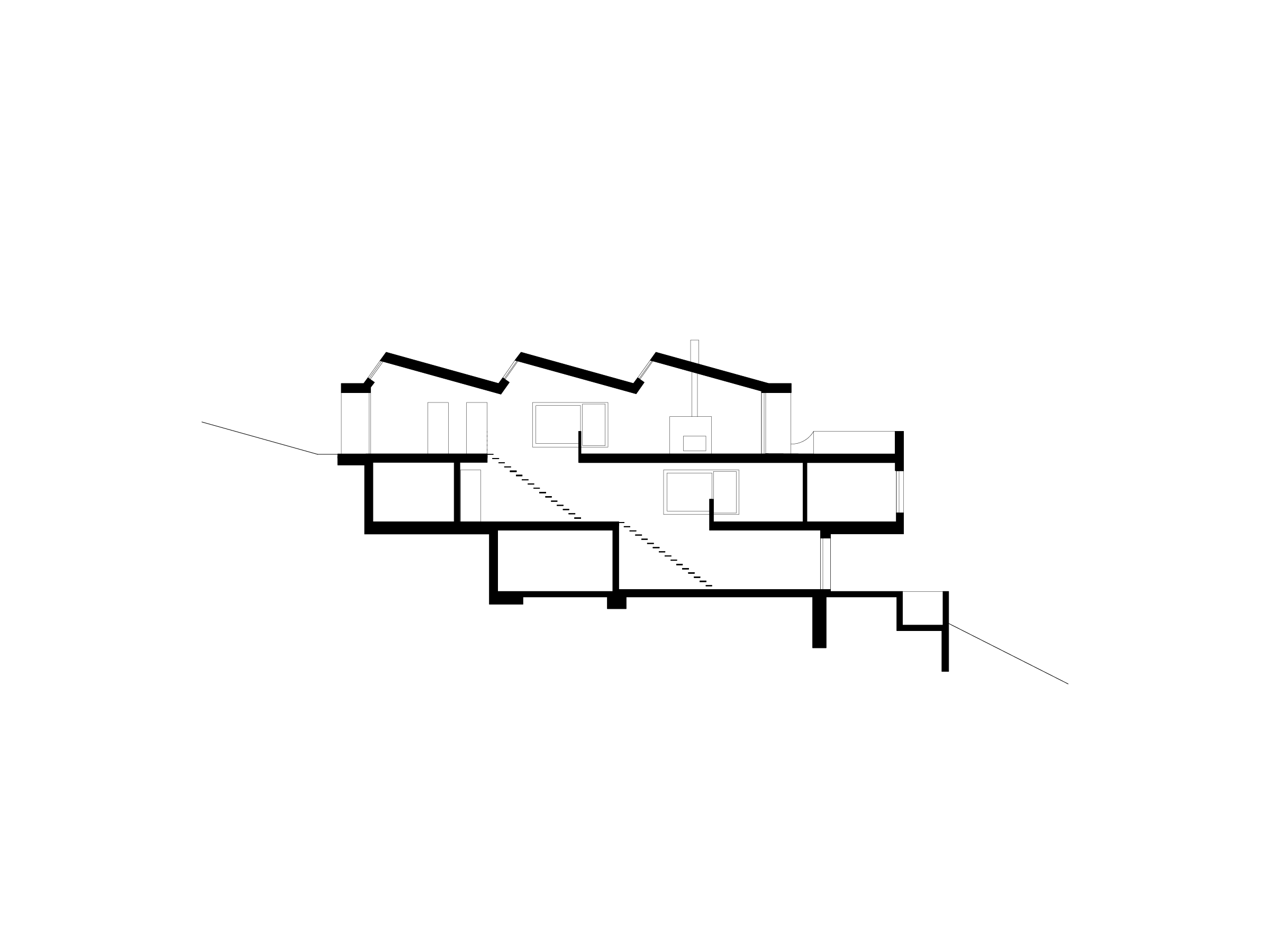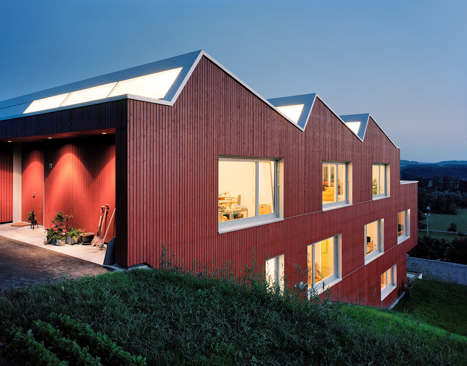 Inspired by local building codes prescribing pitched roofs, the structure incorporates a distinctive triple sawtooth roof design that echoes the characteristics of factory roofs when aligned, effectively transforming the top floor into a "living factory" divided into distinct zones for work, cooking, and respite.