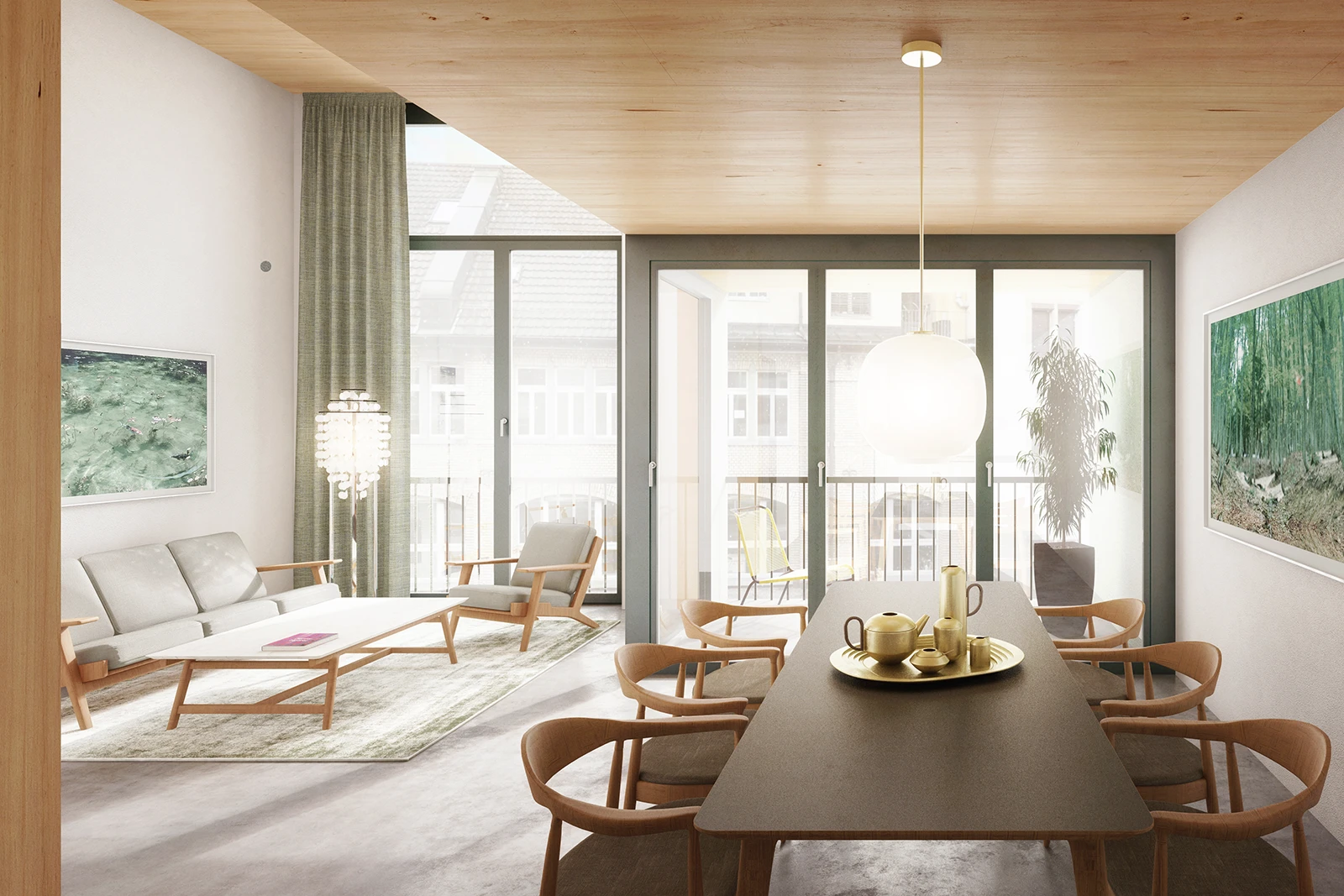 The new building boasts an excellent spatial balance, achieved through the central positioning of the cores that minimize the circulation area and enable a high proportion of primary living space. The existing buildings will be dismantled down to the outer walls of the basement floors, eliminating the need for costly excavation stabilization. The building grid simplifies timber construction and minimizes costs, combined with affordable and robust materials for the interior fittings.