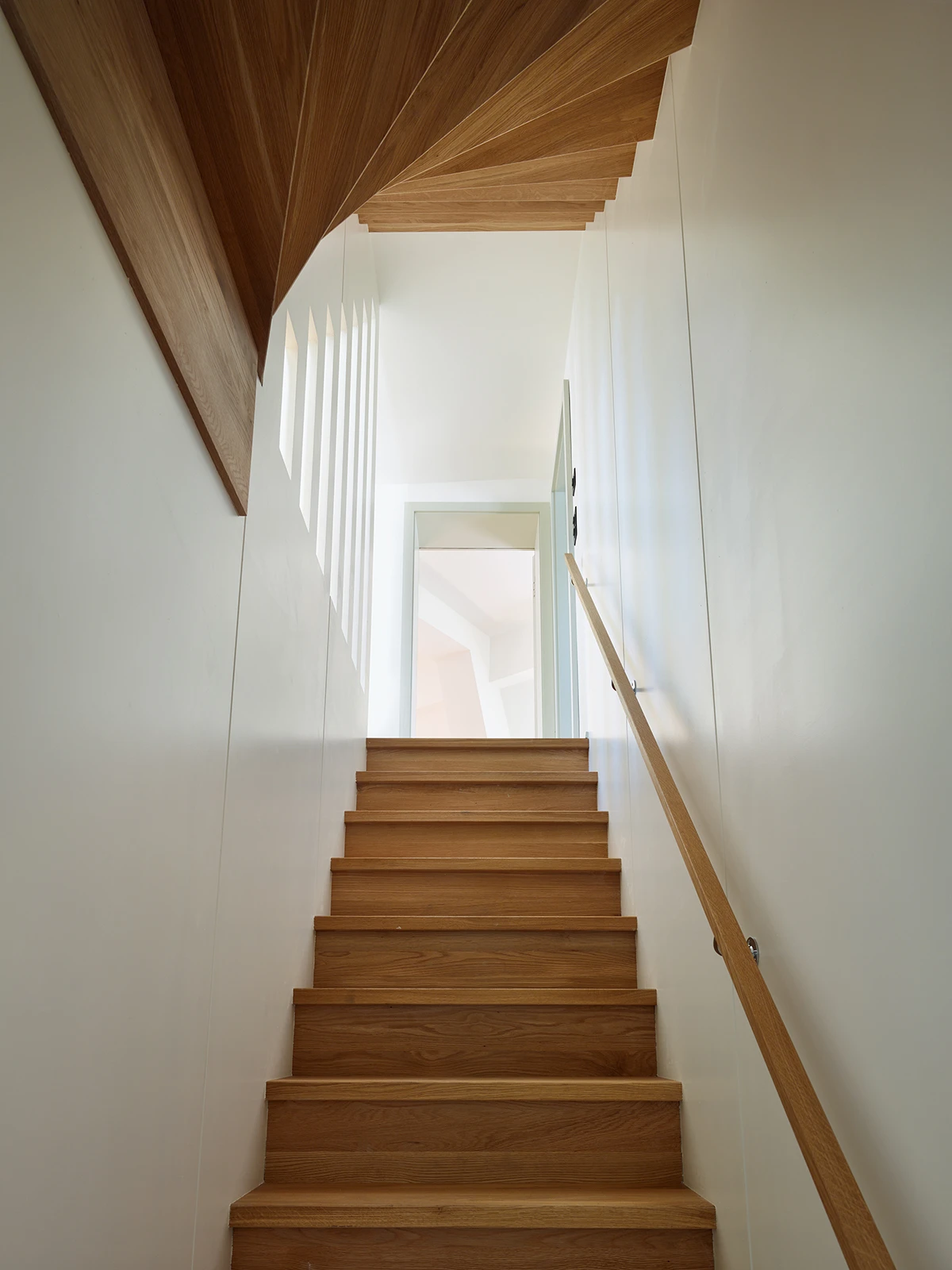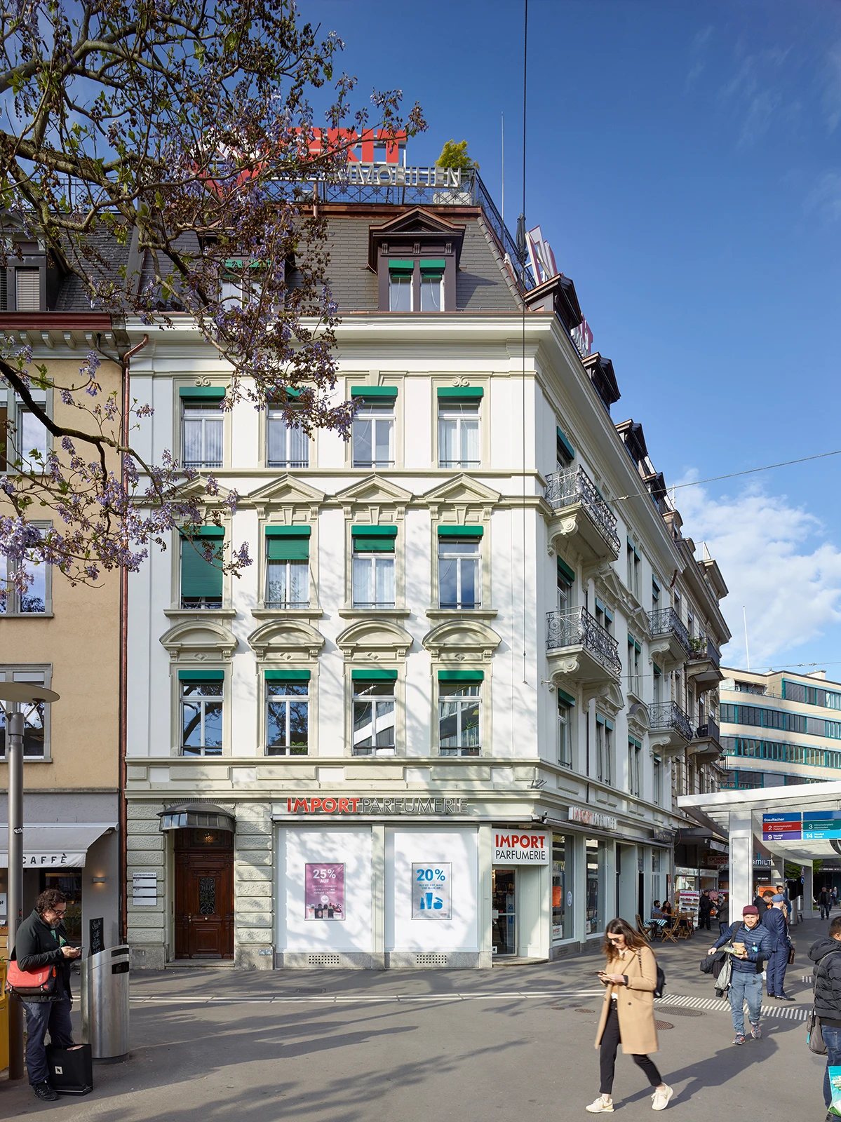 Mit Einbezug des Estrichs entstehen anhand Spillmann Echsle’s Renovierung aus einer Wohnung zwei neue Maisonette-Wohnungen. Die quartiertypische Dachzinne wird den beiden Maisonette-Wohnungen als private Aussenräume mit direkten Ausgängen zugeschlagen. Relevante Anlagen, wie auch Bäder und Küchen die nicht mehr heutigen Ansprüchen Genüge tragen, wurden durch die sanfte Sanierung hochqualitativ den heutigen Bedingungen entsprechend angepasst.