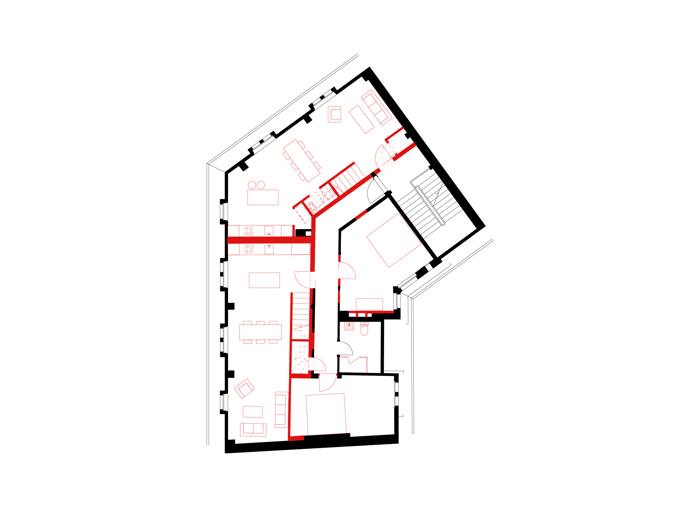 In der Renovierung des Mehrfamilienhauses wird die architektonische Essenz bewahrt. Die historische Bedeutung des Gebäudes wird nuanciert und respektvoll mit modernem Wohnen vereint.