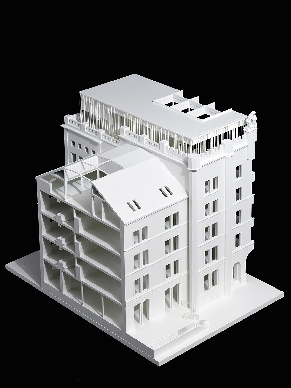 The second measure involves the partial opening of the roof structure above each wing. The apertures are only recognisable when illuminated during the evening. The two music rooms beneath the roof are enveloped by glass domes, creating lantern-like structures that shine light from all sides into the waiting areas.