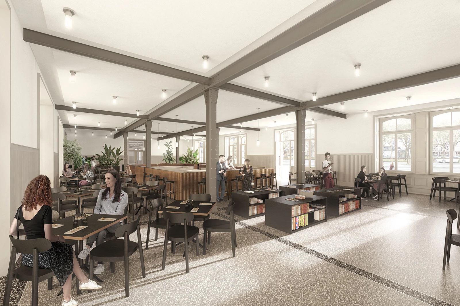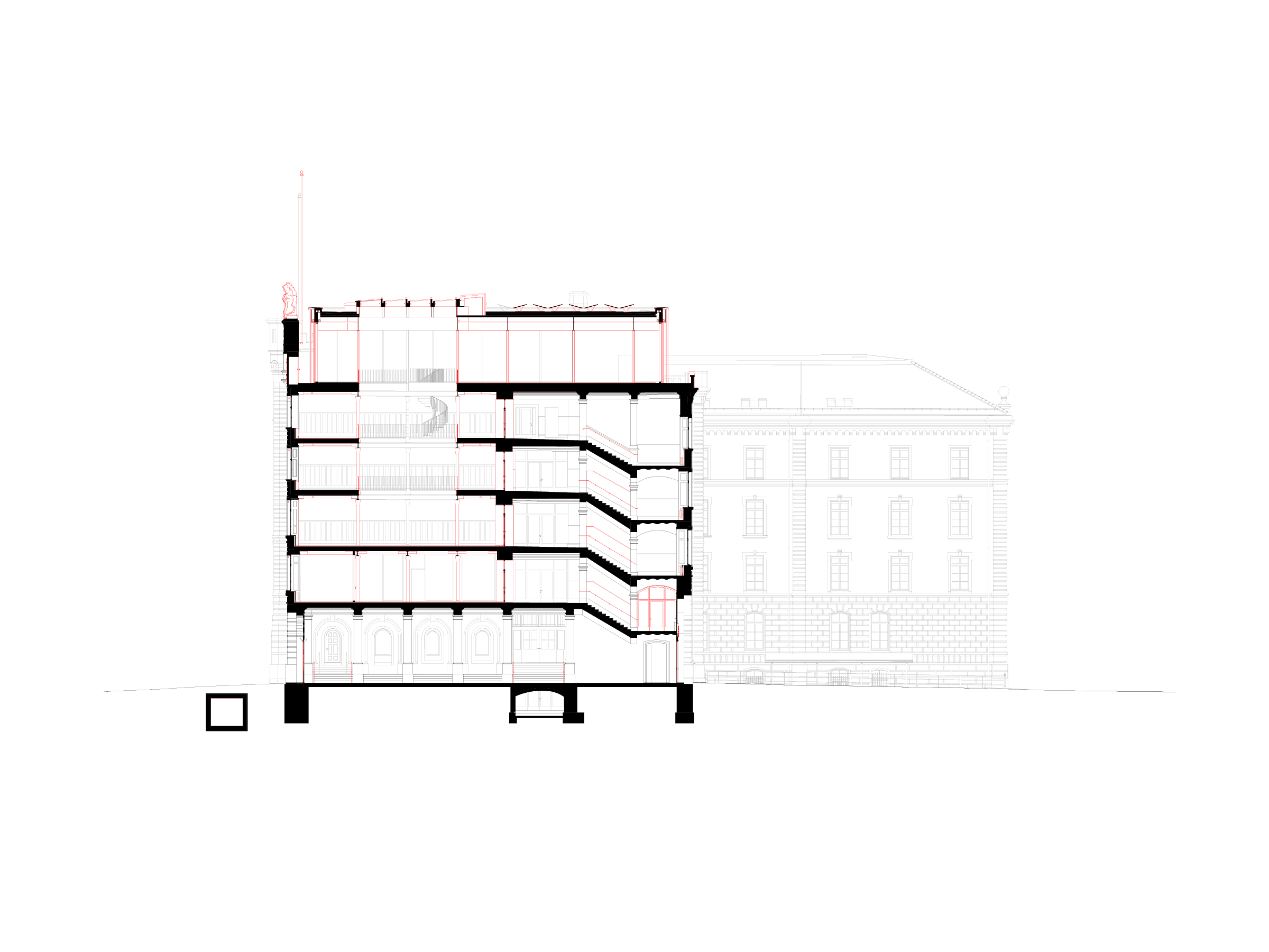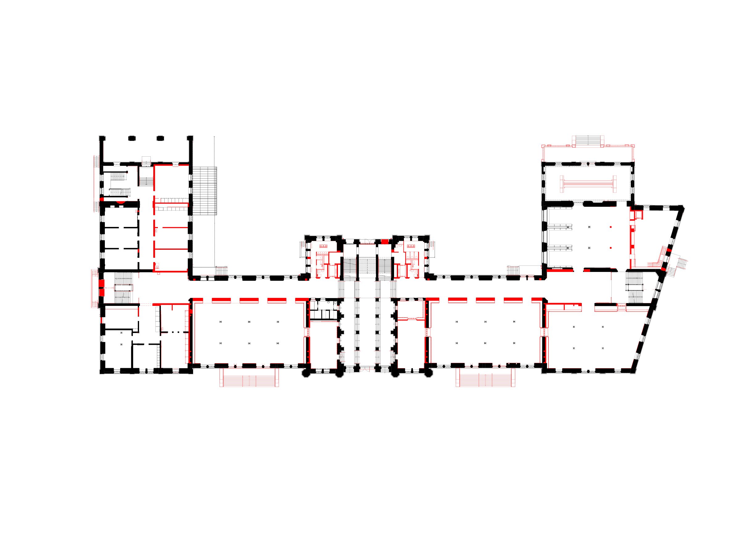The project proposal consists of converting the old military barracks into an education centre, open to public use on the ground level, and comprised of three measures that will enhance the urban fabric. The plan continues with the spatial logic of the building though its axial arrangement: on the mezzanine level, facing Kasernenstrasse, the currently closed volumes of the 122-metre main façade is opened up with two symmetrically placed terraces flanking the main entrance. They consolidate the landing space, while also extending the large areas of the base level towards the exterior. These outdoor extensions are orientated towards each other and function as interconnected market halls, which also connect directly to the main entrance and the surrounding urban space by means of exterior stairs.