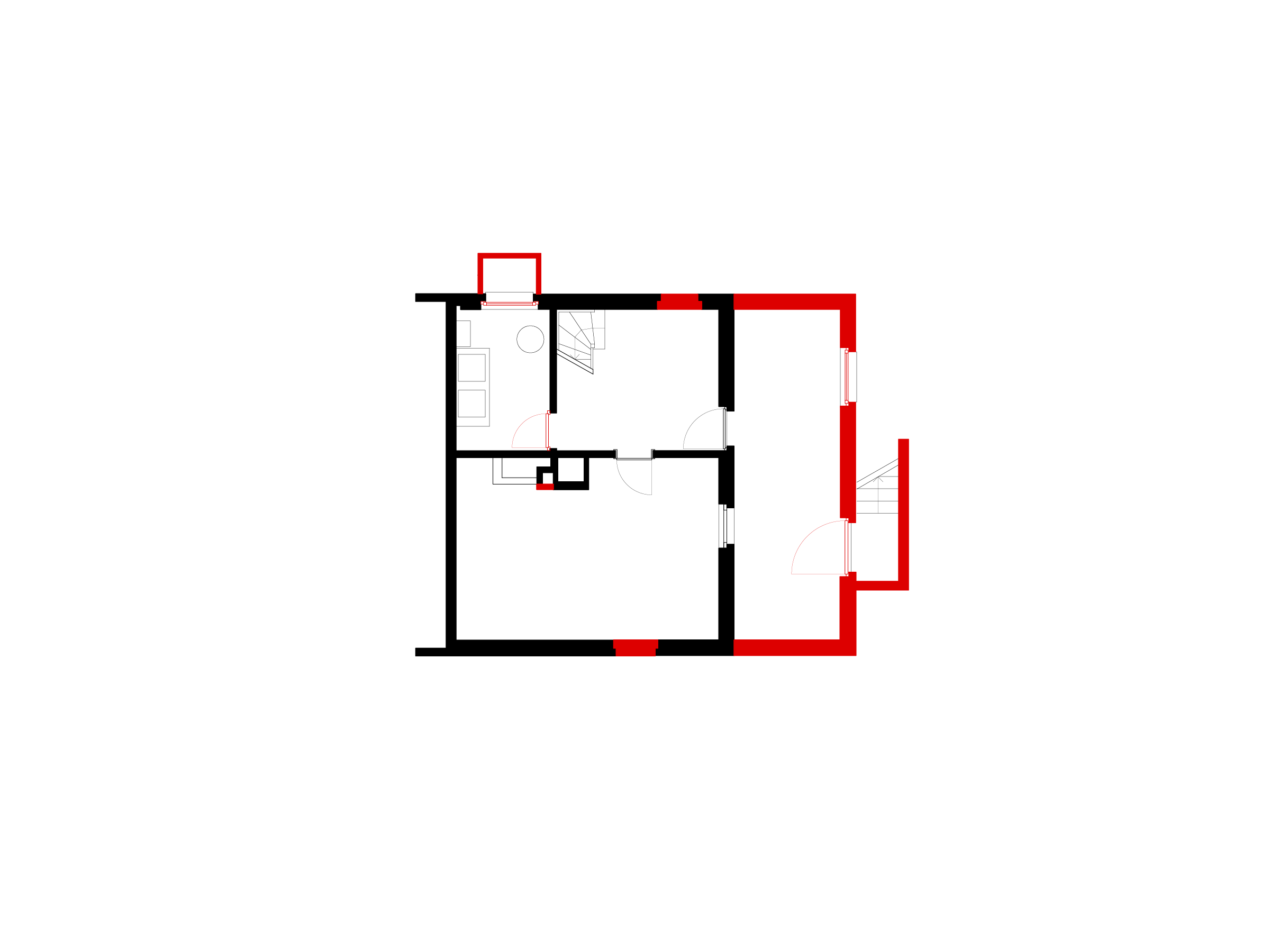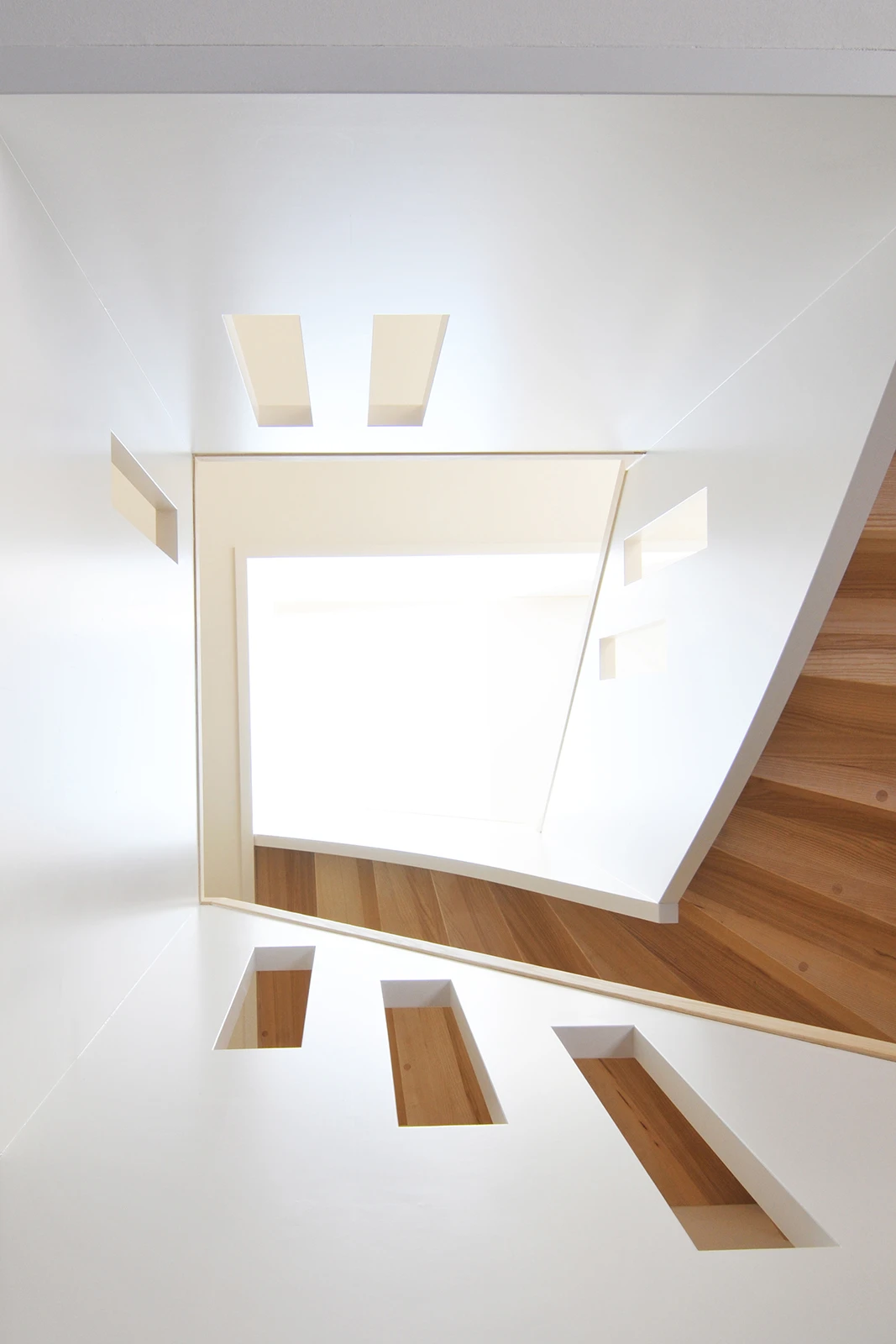 Im EG entstand ein grosszügiger Wohn- und Essbereich mit Küche und einem separaten Gäste-WC. Im Obergeschoss wurde ein zusätzliches Kinderzimmer gewonnen sowie eine grosse Begegnungszone als Vorbereich der Zimmer geschaffen. Im neu ausgebauten Dachgeschoss befindet sich der Elternschlafbereich mit separatem Bad. Die beiden grossen Oblichter verleihen dem Innenraum eine unerwartete Grosszügigkeit und geben den Blick in den Himmel frei. Die neue Treppe, die sich wie ein Band durch die Geschosse windet, ist das zentrale neue Element. Die Oberflächen, wie beispielsweise der geölte Fichtenriemenboden und die gestemmten massiven Türen, nehmen auf den Bestand Bezug, sind jedoch alle neu angefertigt.