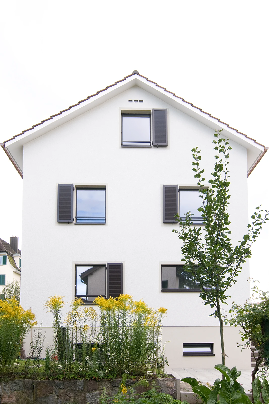 Das äussere Erscheinungsbild nimmt auf spielerische Weise die klassischen Elemente des in den 1940er-Jahren gebauten Hauses auf. Die Fensterläden sind abwechselnd nach links oder rechts gehängt, die grossen Fenster geben den Blick nach aussen frei. Feine Umrandungen, die sich in der Körnigkeit des Putzes sowie in der Farbe von der Fassade unterscheiden, umfassen die Fenster einschliesslich der Läden.