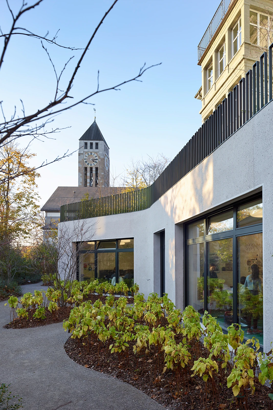 Der Durchgang von der Remise zur Aula wurde über den historischen Gewölbegang wieder geöffnet und die noch vorhandene Steinrahmung freigelegt. Mit dieser baulichen Intervention wird die bestehende Aula zum zentralen Raum. Präzis gesetzte Perforationen durch die ursprüngliche Aussenwand verweben die Aula räumlich mit der unterirdischen Erweiterung. Die vorgelagerten und leicht amorph geschwungenen Klassenzimmer strecken sich zum Licht und alternieren mit Vorbereitungs- und Gruppenräumen. Auf dem Dach des Neubaus ist ein sorgfältig ausgestalteter Gartenraum angelegt.