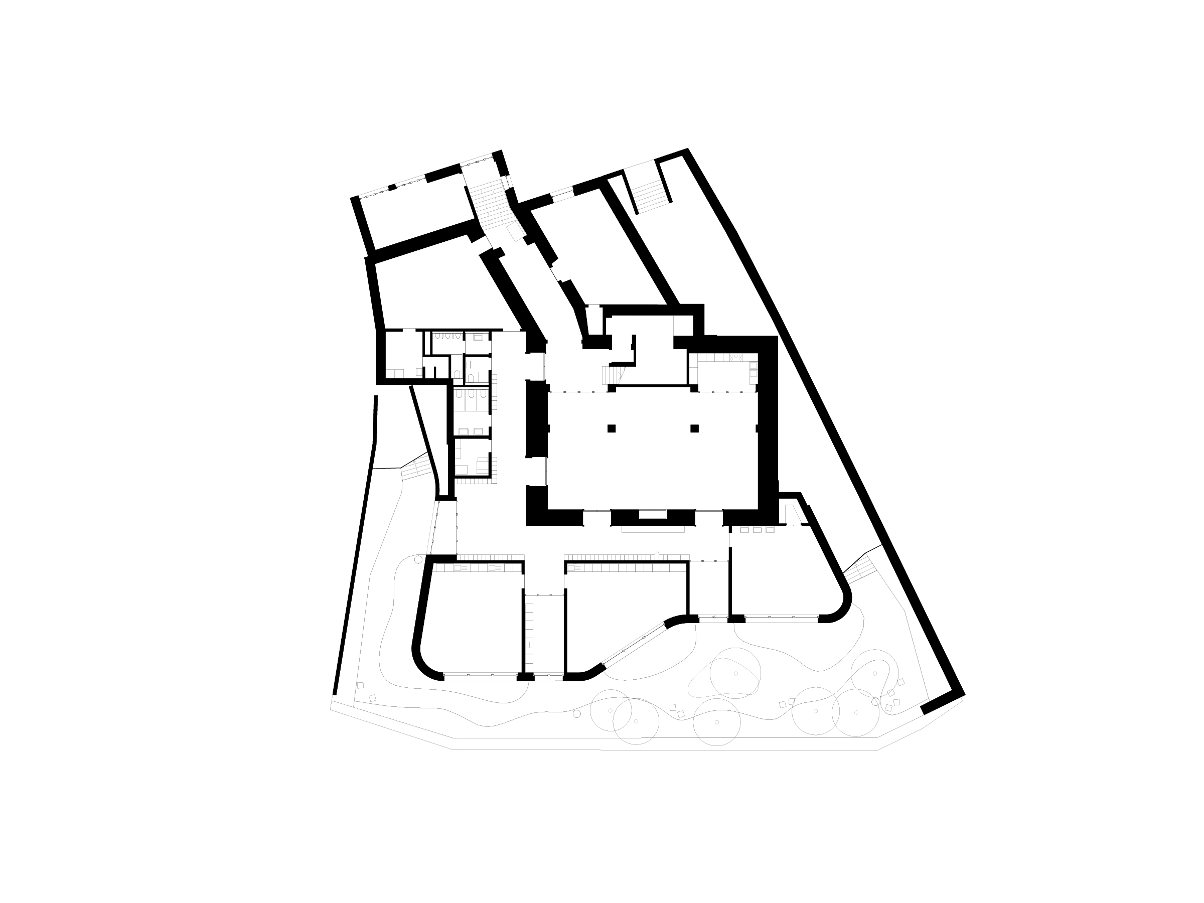 Correspondingly, a plinth frames and encloses the older building, accessible through an extension of the existing staircase, as well as through a garden entry. The original connection linking the carriage house to the auditorium has been reopened through the historical, vaulted corridor, revealing its preserved stone framework and elevating the assembly hall as the focal point. Precisely placed openings in the historic outer wall create an intricate interplay between the auditorium and its subterranean extension. Classrooms, amorphously curved, are juxtaposed between communal rooms and private offices. A landscaped garden flourishes above this newly updated space on the roof of the new building.