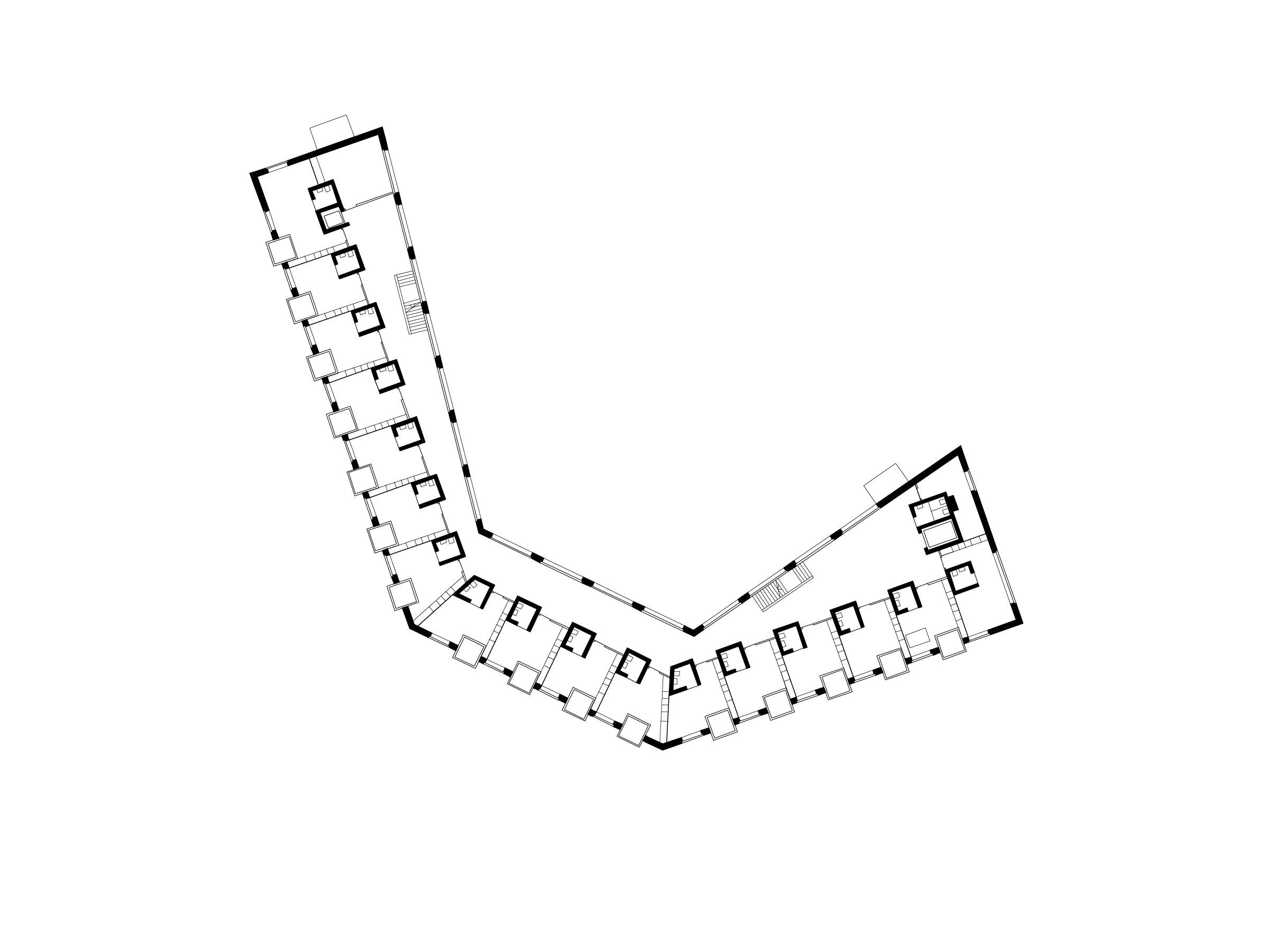 The elongated, curved structure, leaning towards the slope, refers in form and scale to an existing senior residence.